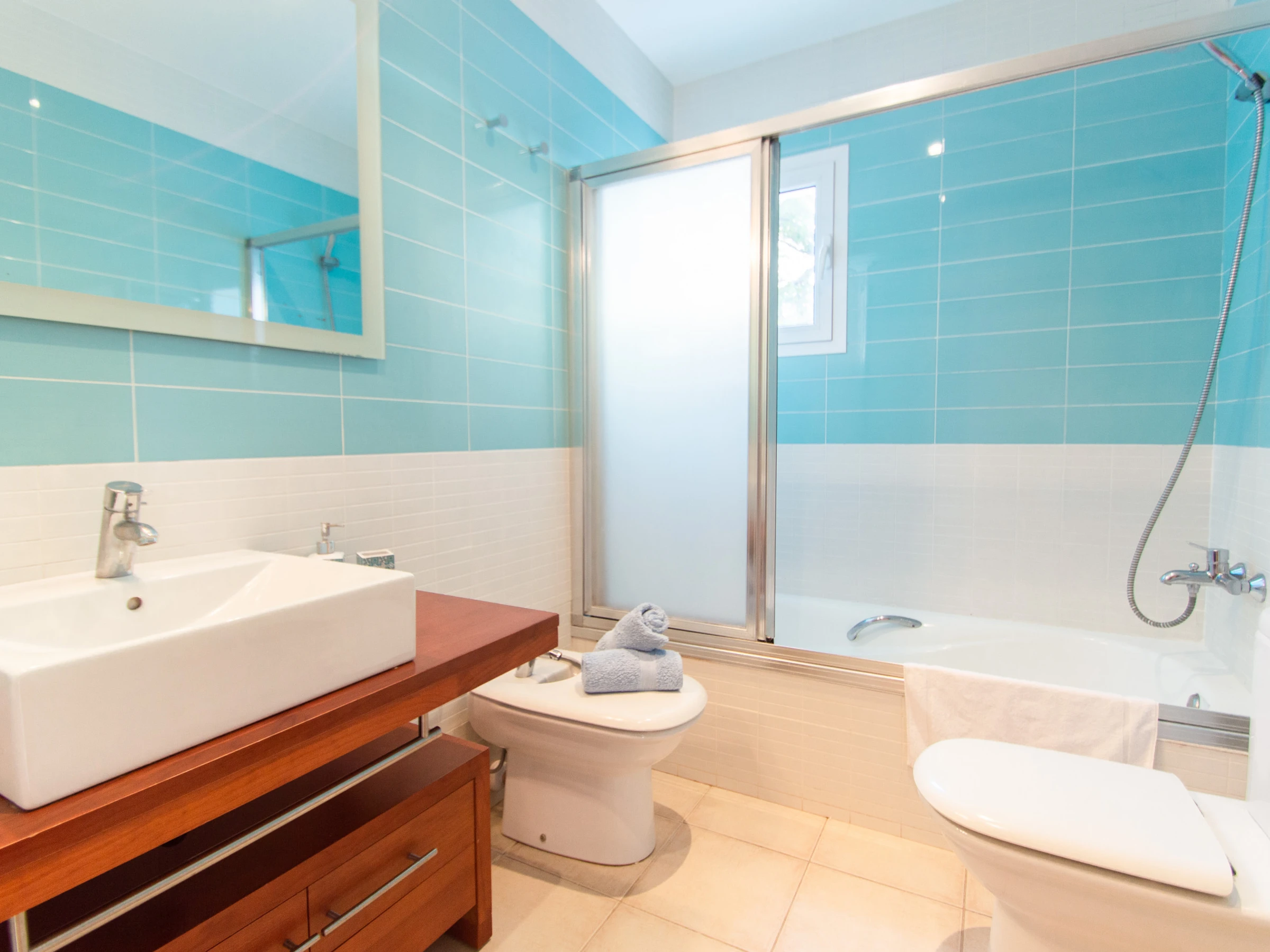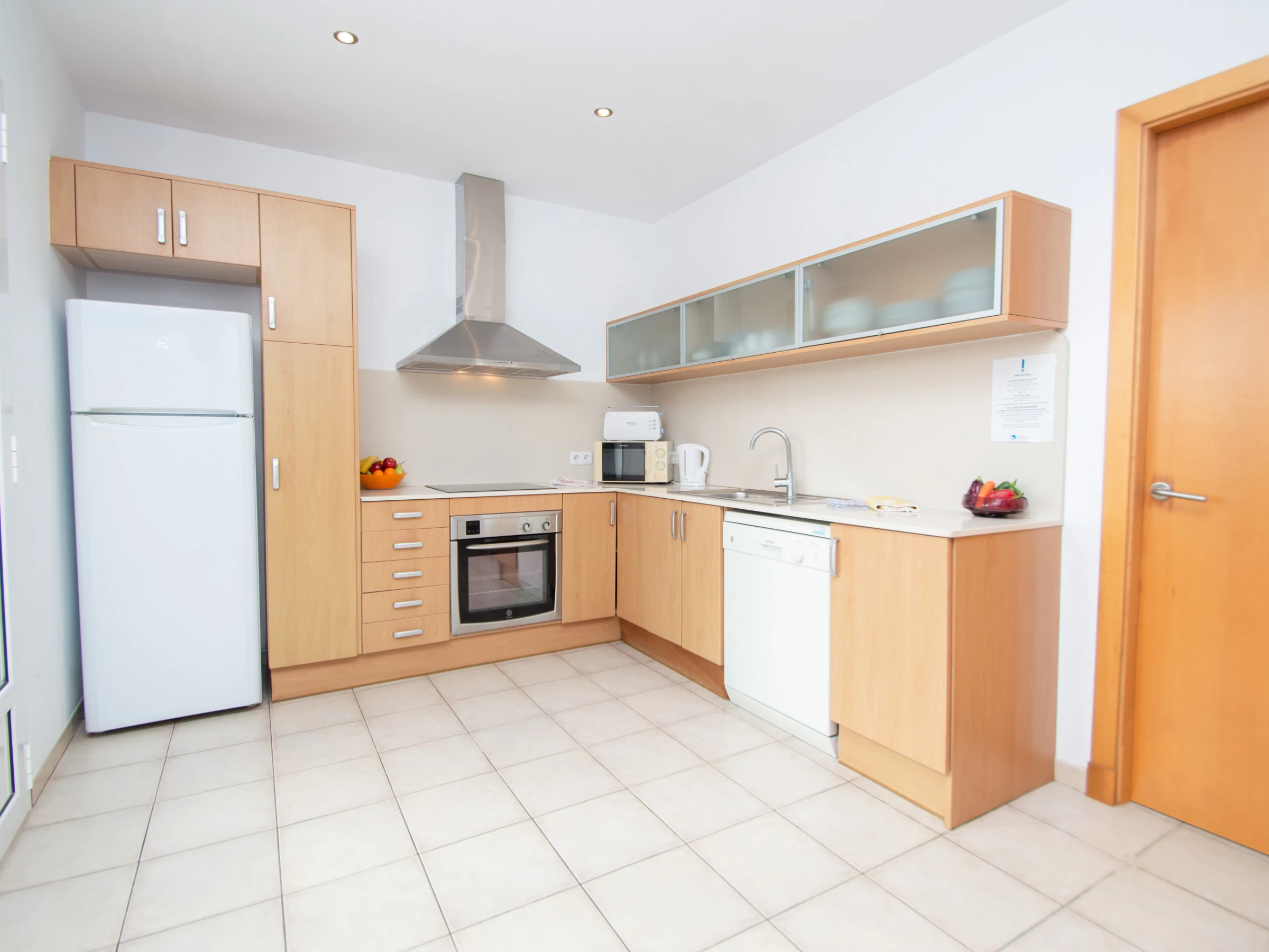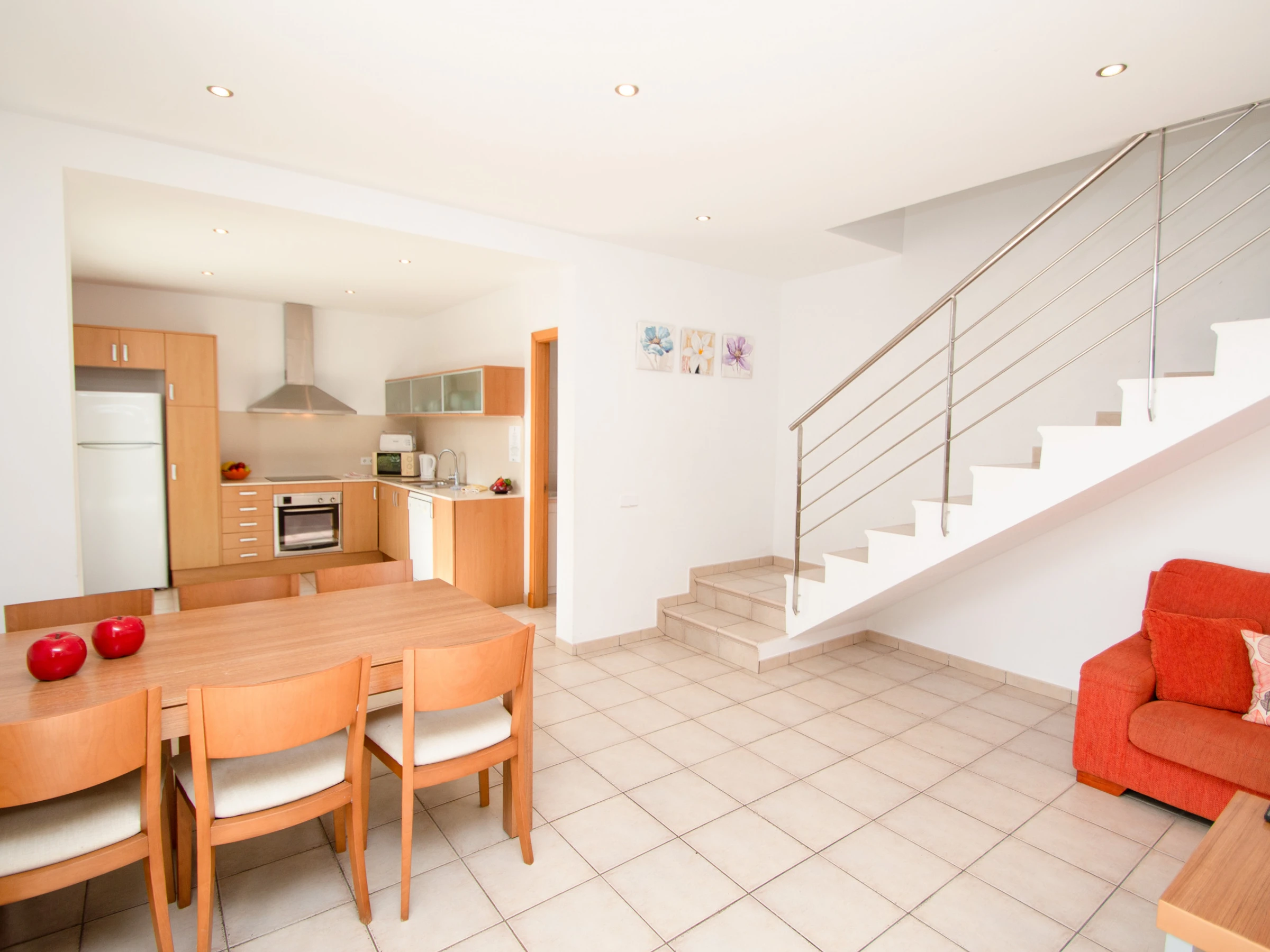 The kitchen is fully equipped with fridge, oven, microwave, dishwasher, coffee maker, kettle, toaster and all necessary kitchenware. It also has an extendible table with chairs to enjoy family meals.