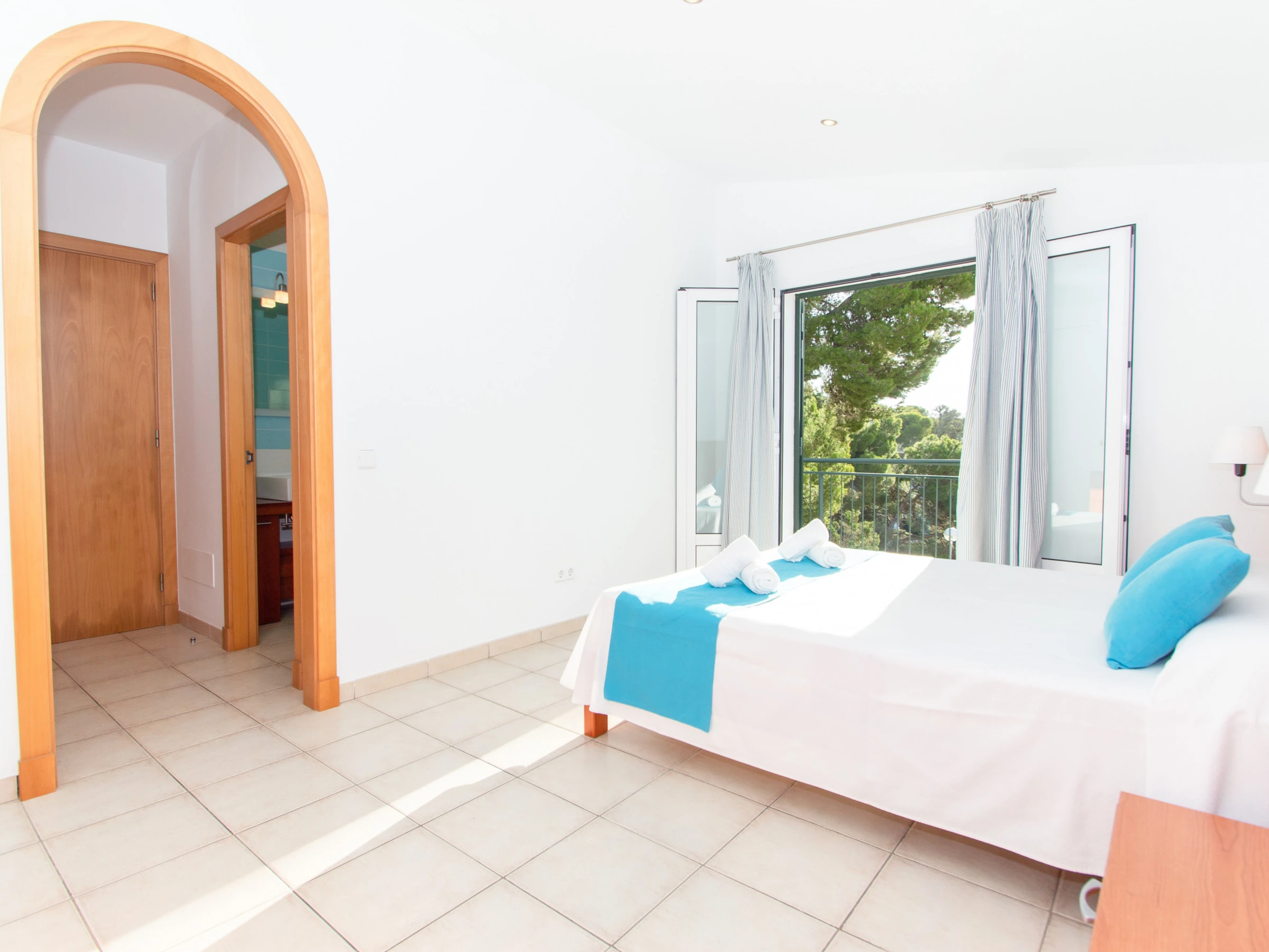 On the first floor of the villa rental in Menorca there are the other three double bedrooms en suite. The master bedroom is composed of a double bed, a large built-in wardrobe and a family bathroom, equipped with bathtub and hair dryer. The other two double rooms are featured with two single beds. Each double bedroom has fitted wardrobes and an en suite bathroom with shower. All bedrooms located on this floor have access to the balcony which overlooks the beach of Cala Galdana and the pool of the Villa.