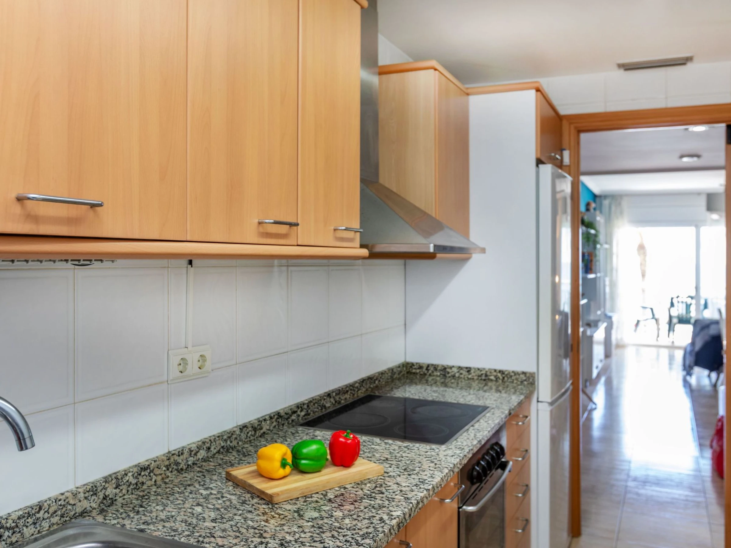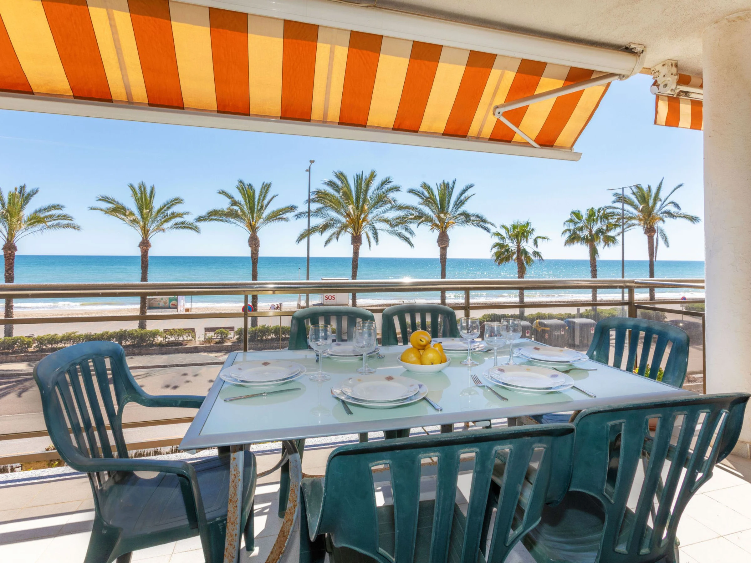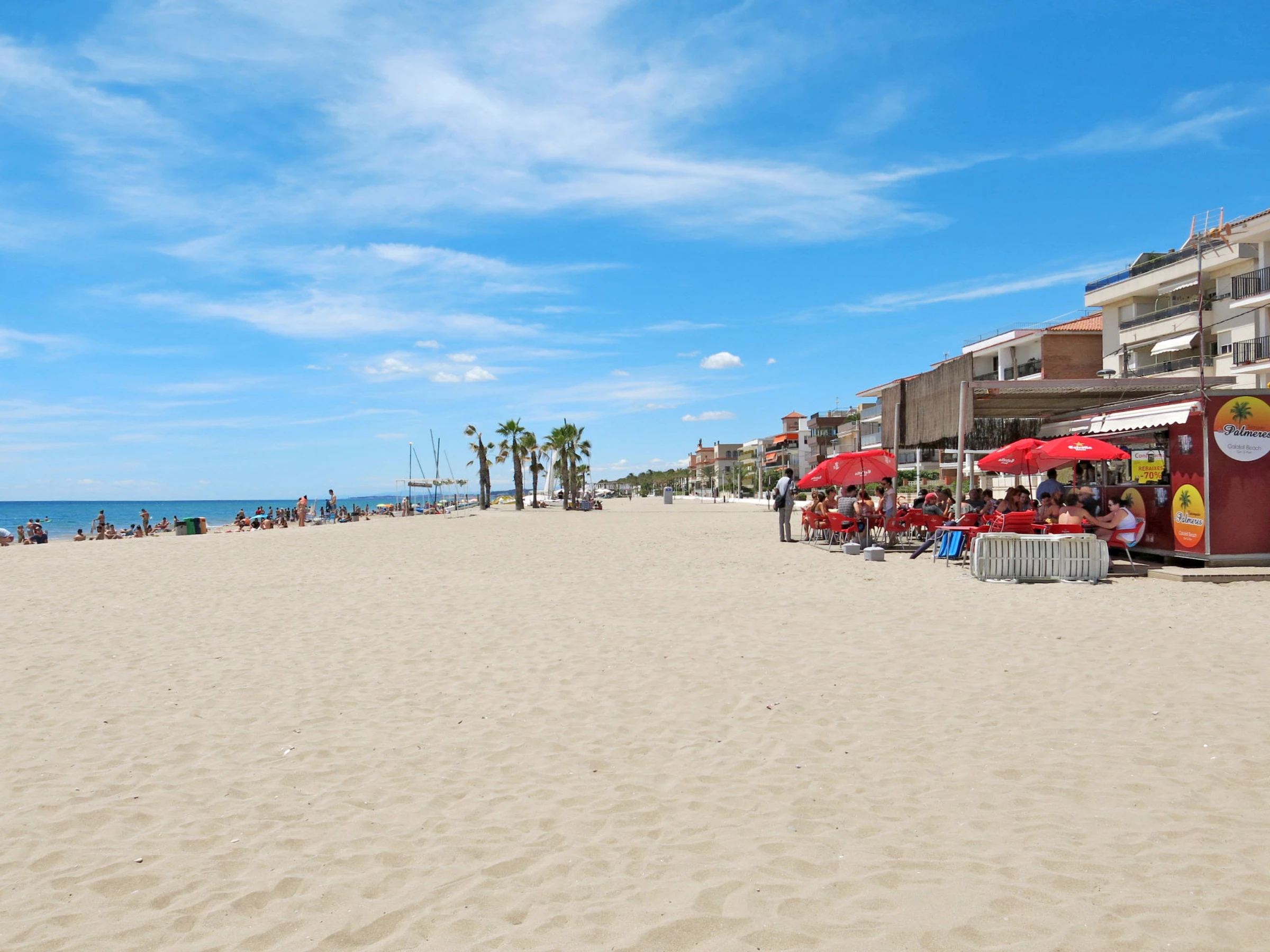 "Playa Calafell", 3-room apartment 66 m2. Practical and cosy furnishings: living/dining room with TV and digital TV (flat screen). Exit to the terrace. 1 room with 1 double bed (2 x 90 cm, length 190 cm), shower/WC. Exit to the terrace. 1 room with 2 beds (90 cm, length 190 cm). Kitchen (oven, dishwasher, 4 ceramic glass hob hotplates, toaster, kettle, electric coffee machine, Capsules for coffee machine (L´Or) extra). Shower/WC. Air-conditioning, forced-air heating, boiler (80 litres). Terrace furniture. Marvellous view of the sea. Facilities: washing machine, iron, baby cot for up to 2 year olds, hair dryer. Internet (WiFi, free). Parking space n 46. Please note: suitable for families. Non-smokers only. TV only ES. [hidden] // Reg. Nr.: ESFCTU00004302500030654400000000000000[hidden]-823