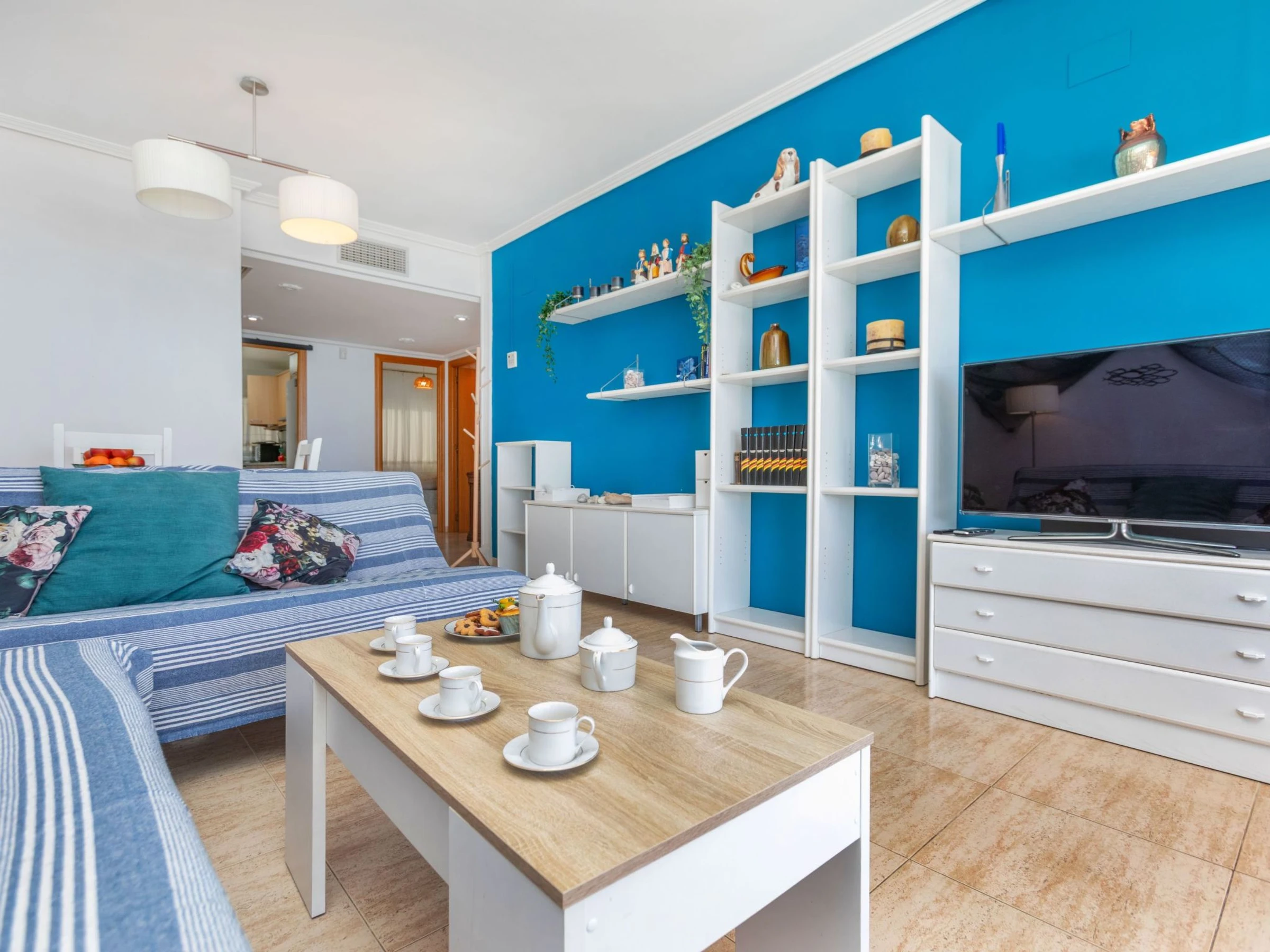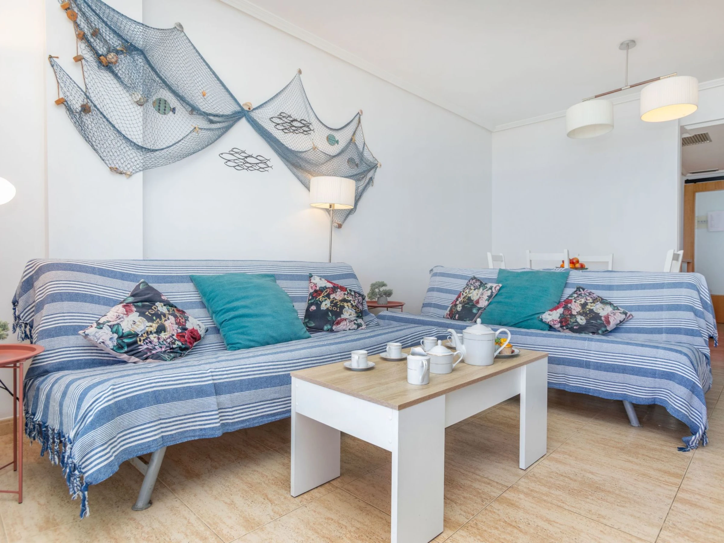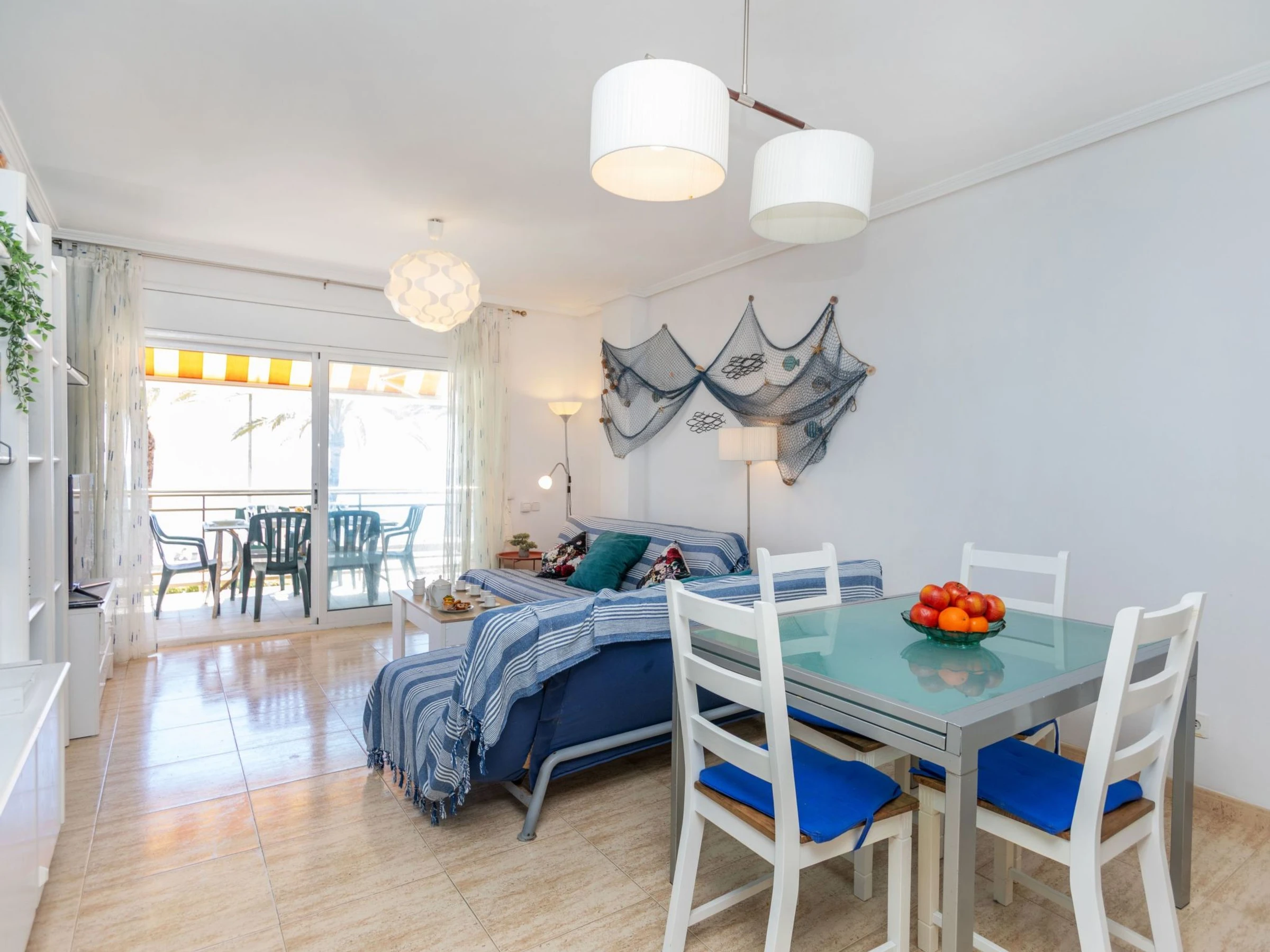 "Playa Calafell", 3-room apartment 66 m2. Practical and cosy furnishings: living/dining room with TV and digital TV (flat screen). Exit to the terrace. 1 room with 1 double bed (2 x 90 cm, length 190 cm), shower/WC. Exit to the terrace. 1 room with 2 beds (90 cm, length 190 cm). Kitchen (oven, dishwasher, 4 ceramic glass hob hotplates, toaster, kettle, electric coffee machine, Capsules for coffee machine (L´Or) extra). Shower/WC. Air-conditioning, forced-air heating, boiler (80 litres). Terrace furniture. Marvellous view of the sea. Facilities: washing machine, iron, baby cot for up to 2 year olds, hair dryer. Internet (WiFi, free). Parking space n 46. Please note: suitable for families. Non-smokers only. TV only ES. [hidden] // Reg. Nr.: ESFCTU00004302500030654400000000000000[hidden]-823