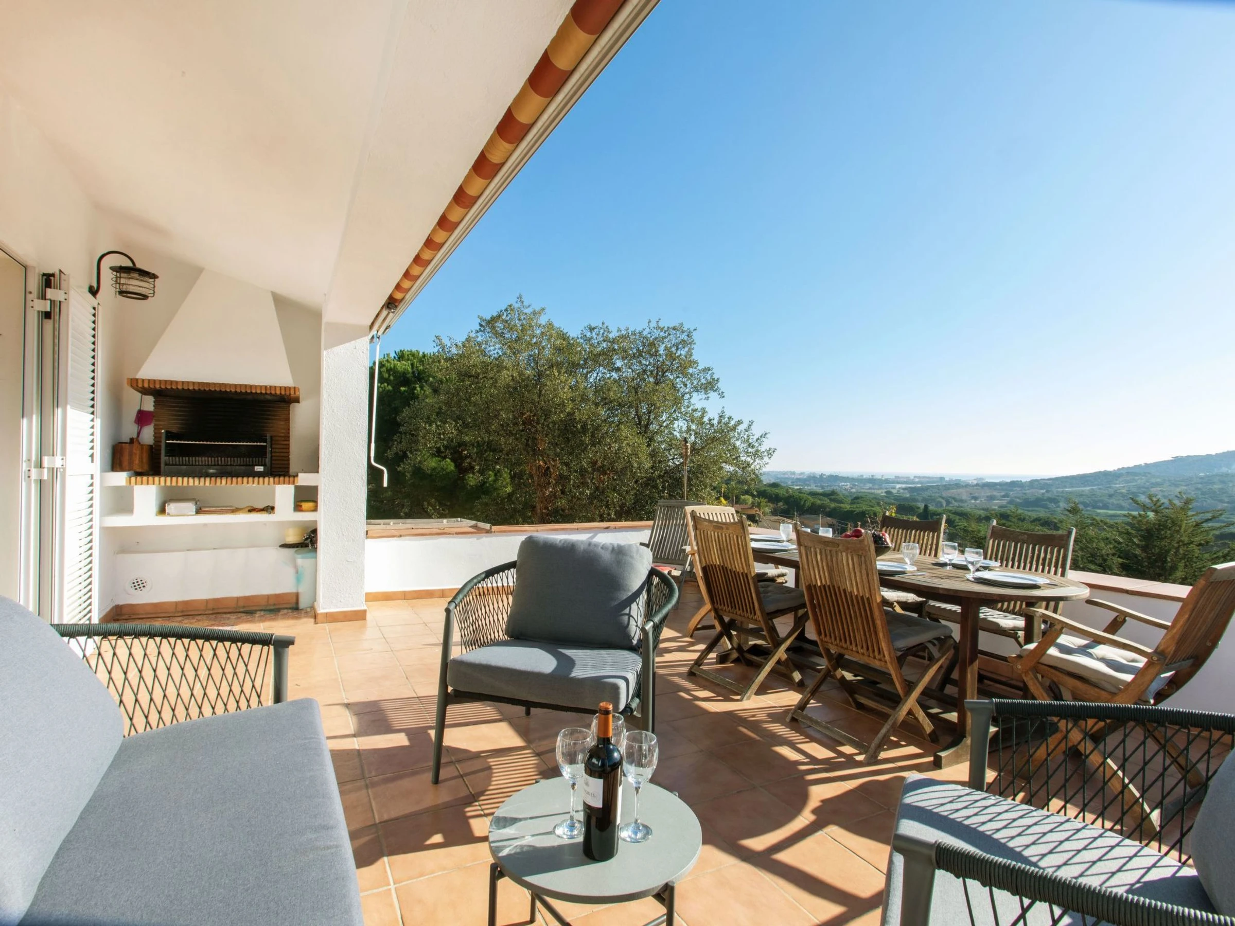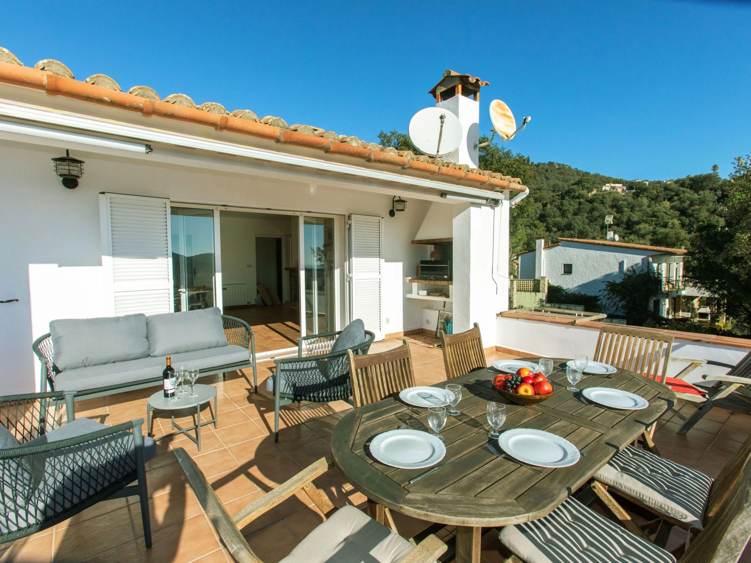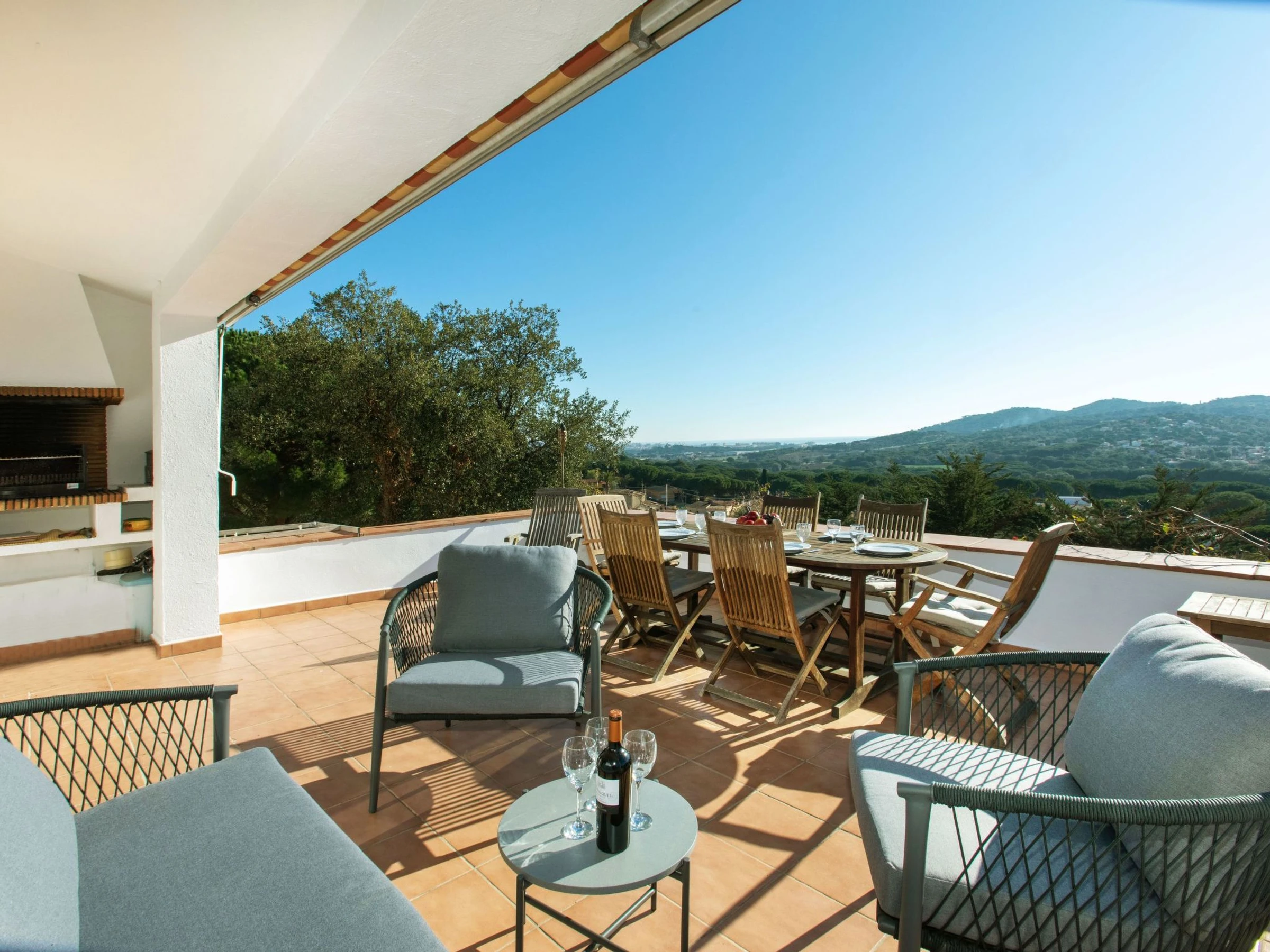 "El Suro", 6-room villa 270 m2 on 2 levels. Comfortable furnishings: living/dining room with digital TV. Exit to the terrace. 1 room with 1 french bed (160 cm, length 220 cm). 1 room with 2 beds (90 cm, length 200 cm). Open kitchen (oven, dishwasher, 4 ceramic glass hob hotplates, toaster, kettle, microwave, freezer, grill, electric coffee machine). Bath/WC. Air-conditioning. No heating option. On the lower ground floor: living/dining room. Exit to the patio, to the swimming pool. 1 room with 1 french bed (150 cm, length 200 cm) with 2 beds (90 cm, length 200 cm), 1 french bed (150 cm, length 200 cm). Small kitchen (freezer). Shower/WC. Large terrace 25 m2, garden, porch. Terrace furniture, barbecue, deck chairs (8), covered balcony. View of the sea and the countryside. Facilities: washing machine, iron, children's high chair, baby cot, hair dryer. Internet (WiFi, free). Parking at the house. Please note: suitable for families. TV only ES. [hidden] // Reg. Nr.: ESFCTU00001701500026216700000000000000000[hidden]5