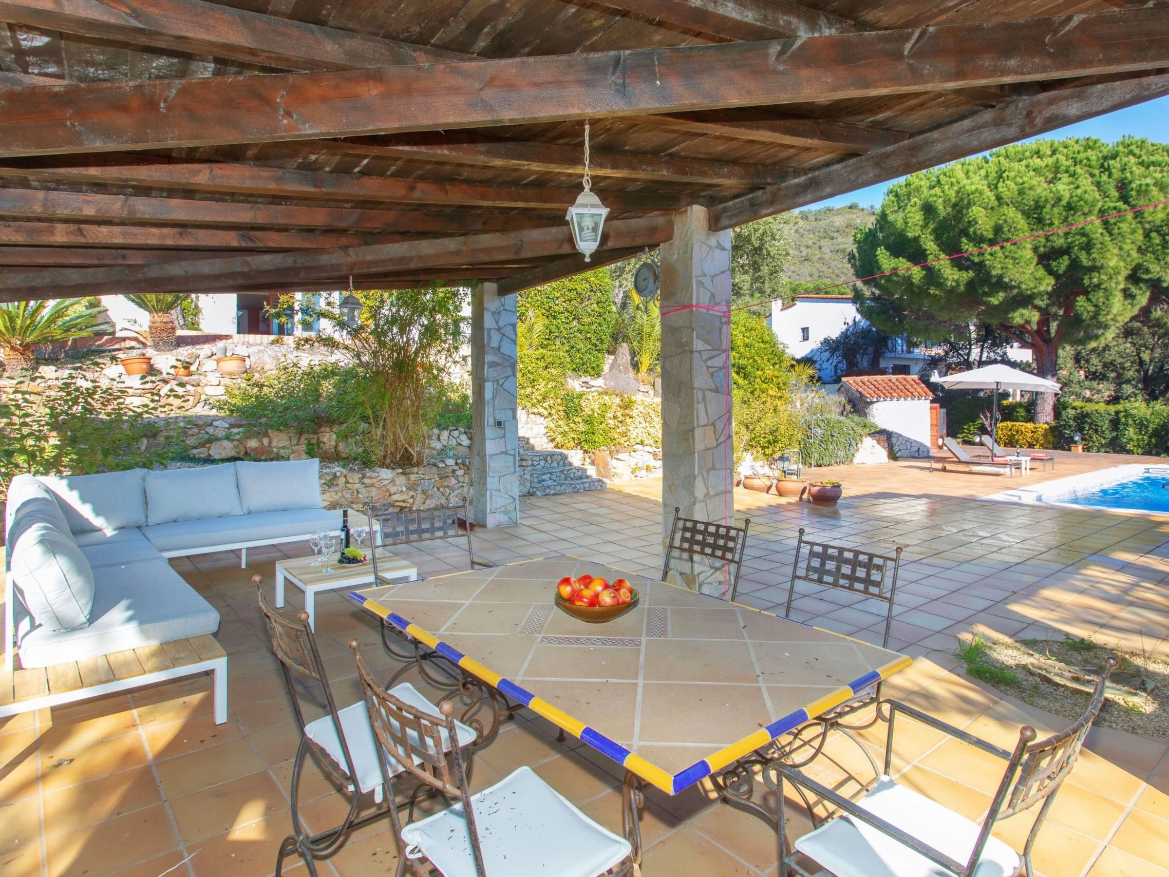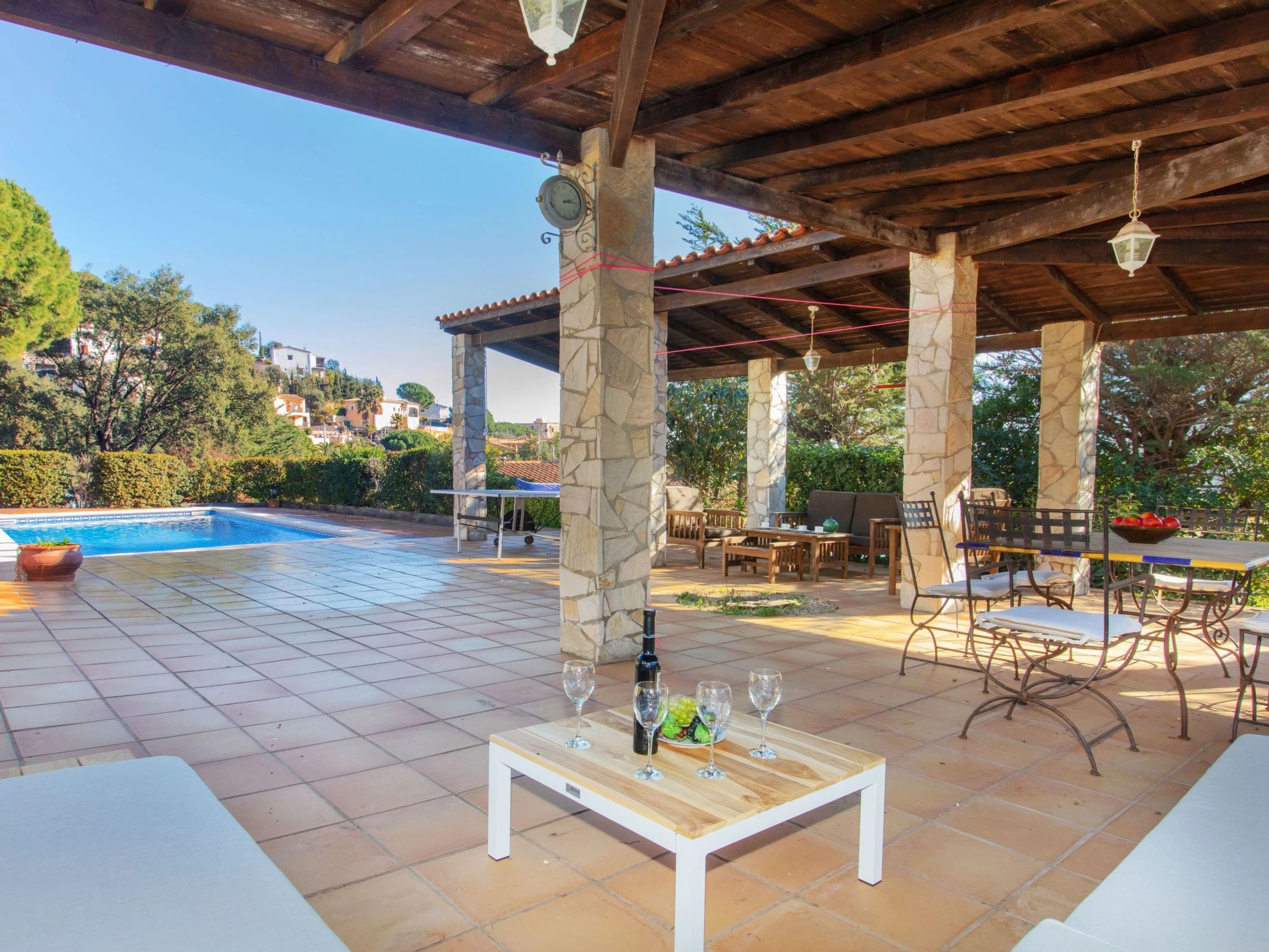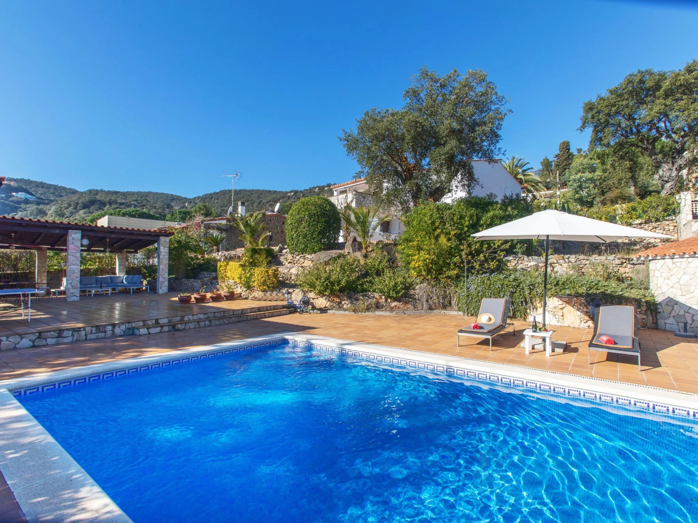 Urb. Mas Ambros 2 km from Calonge: Cosy house "El Suro". In a quiet, sunny position, 5 km from the sea, in a cul-de-sac. Private: large garden (fenced), swimming pool angular (10 x 5 m, seasonal availability: [hidden] - [hidden] with internal staircase. Outdoor shower, table tennis, basketball, patio, arbour, pergola, garden furniture, barbecue, barbecue house. In the house: solarium. Parking (for 5 cars) at the house on the premises. Supermarket 2 km, restaurant 1 km, bus stop 1 km, sandy beach "Sant Antoni de Calonge" 5 km. Sports harbour 7 km, golf course (18 hole) 7 km, riding stable 12 km. Please note: car recommended. The owner does not accept any youth groups. Neighbourhood highly sensitive to noise. Quietness and good behaviour expected.