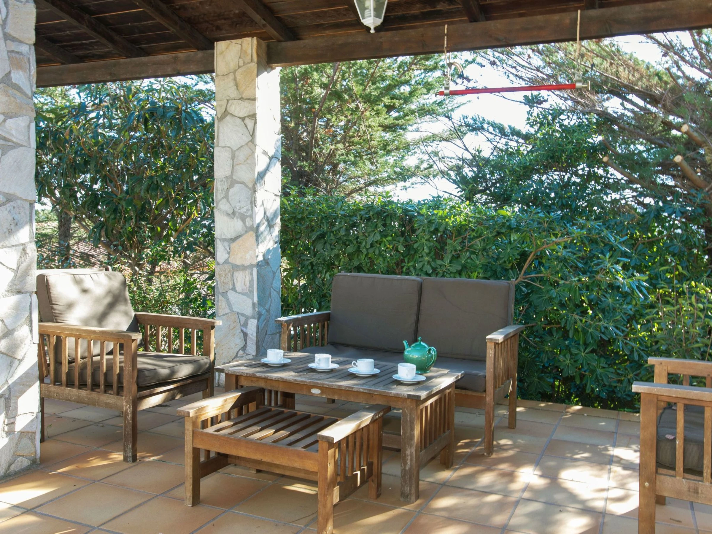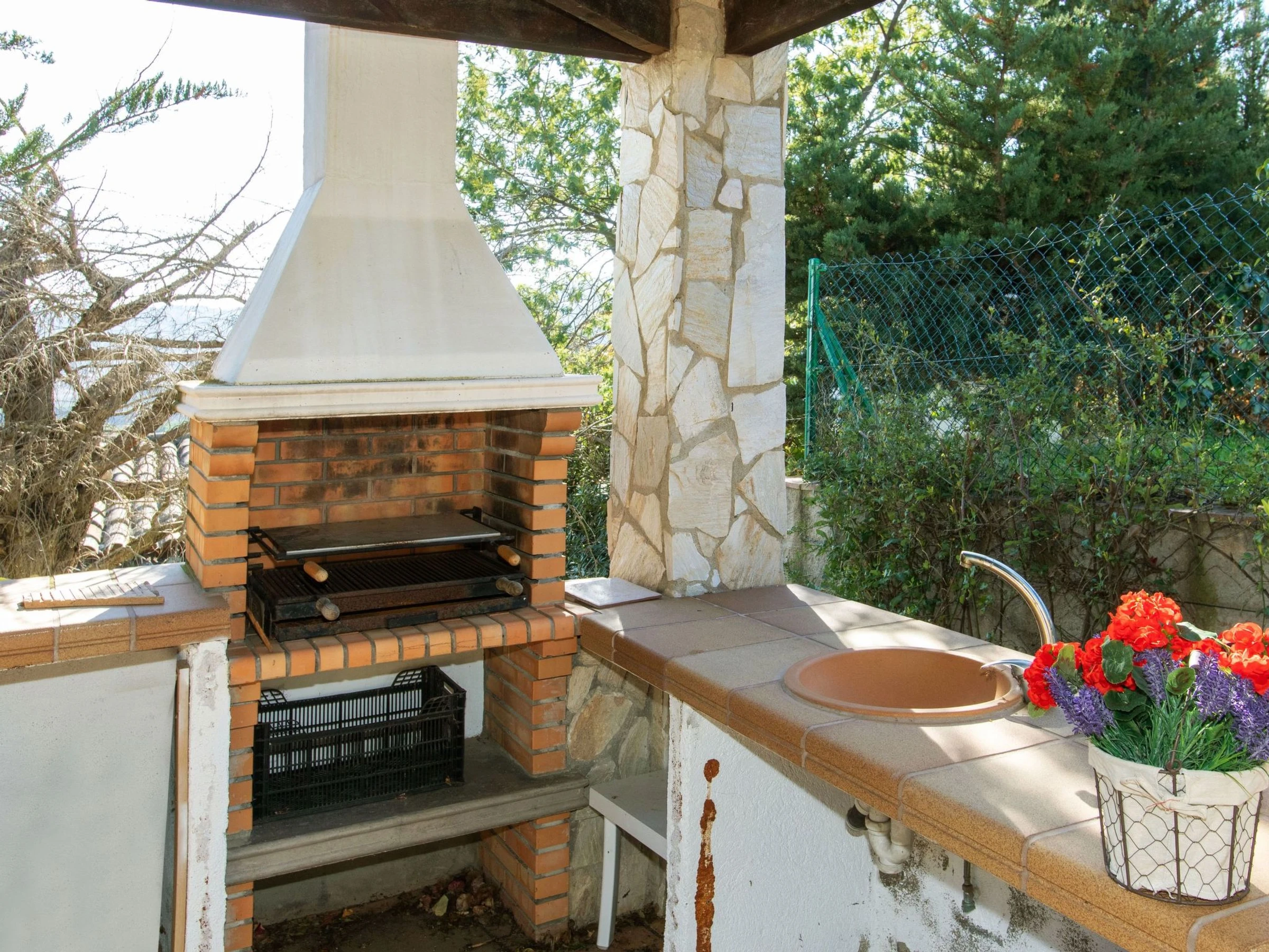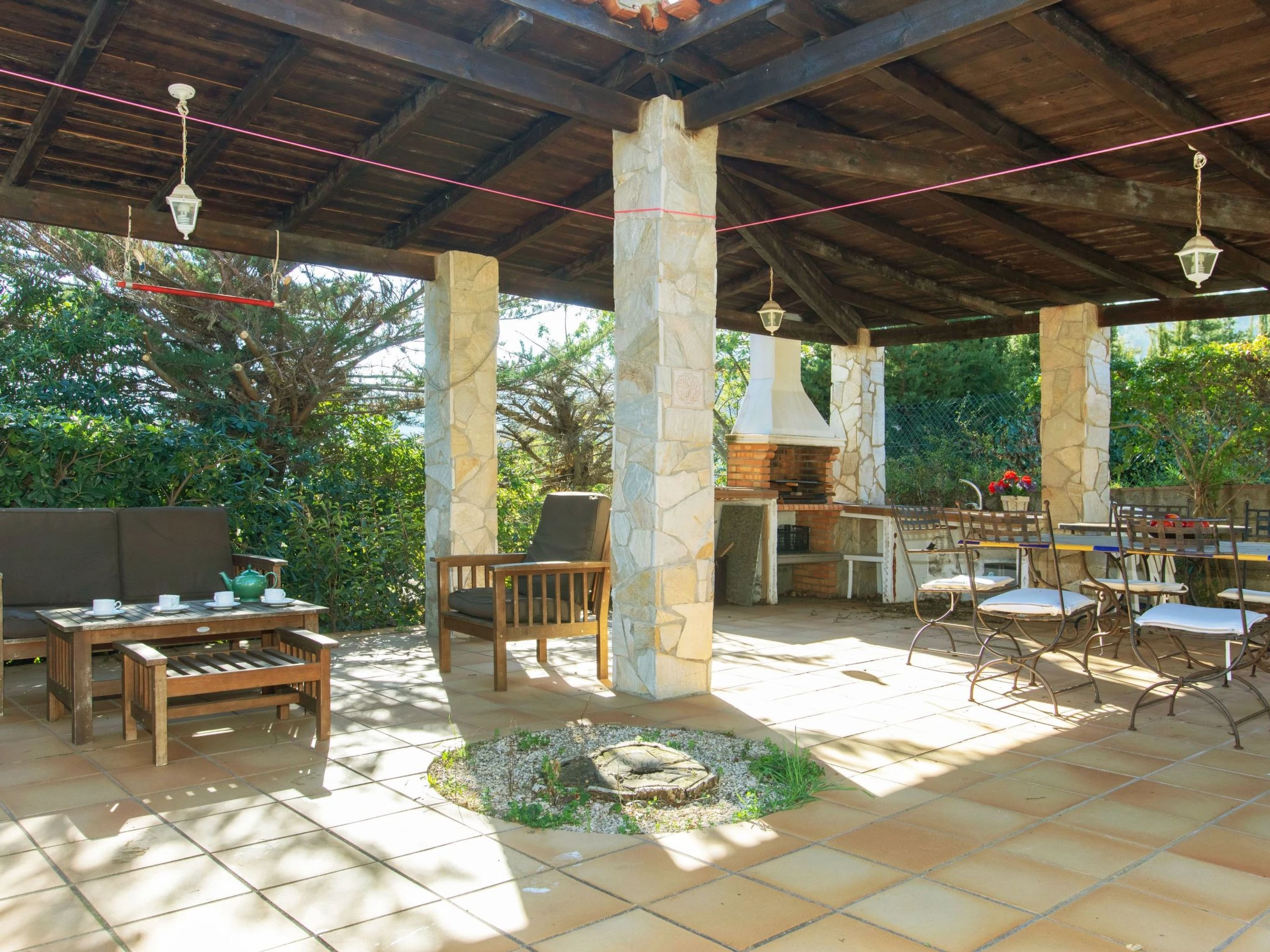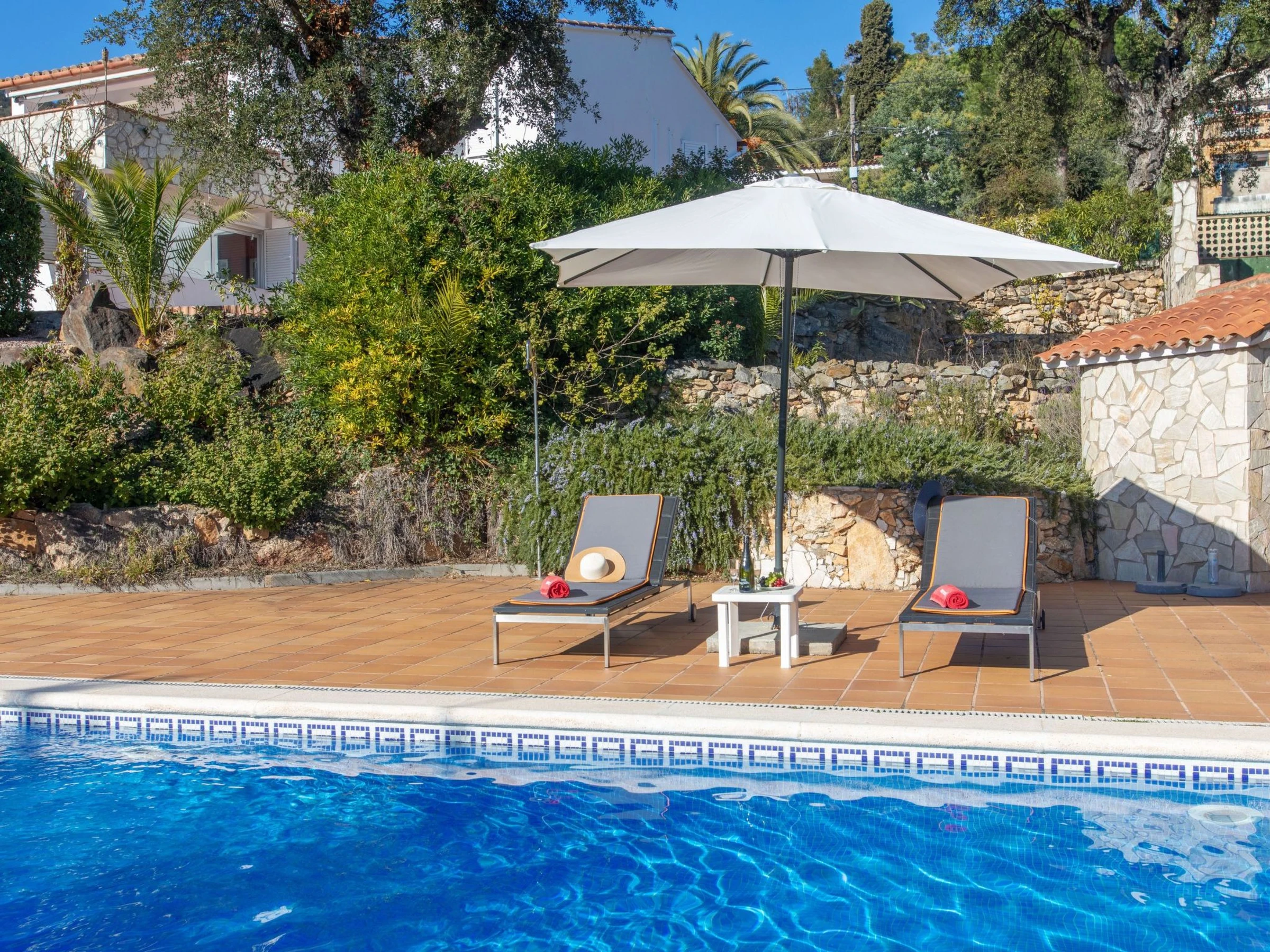 Urb. Mas Ambros 2 km from Calonge: Cosy house "El Suro". In a quiet, sunny position, 5 km from the sea, in a cul-de-sac. Private: large garden (fenced), swimming pool angular (10 x 5 m, seasonal availability: [hidden] - [hidden] with internal staircase. Outdoor shower, table tennis, basketball, patio, arbour, pergola, garden furniture, barbecue, barbecue house. In the house: solarium. Parking (for 5 cars) at the house on the premises. Supermarket 2 km, restaurant 1 km, bus stop 1 km, sandy beach "Sant Antoni de Calonge" 5 km. Sports harbour 7 km, golf course (18 hole) 7 km, riding stable 12 km. Please note: car recommended. The owner does not accept any youth groups. Neighbourhood highly sensitive to noise. Quietness and good behaviour expected.