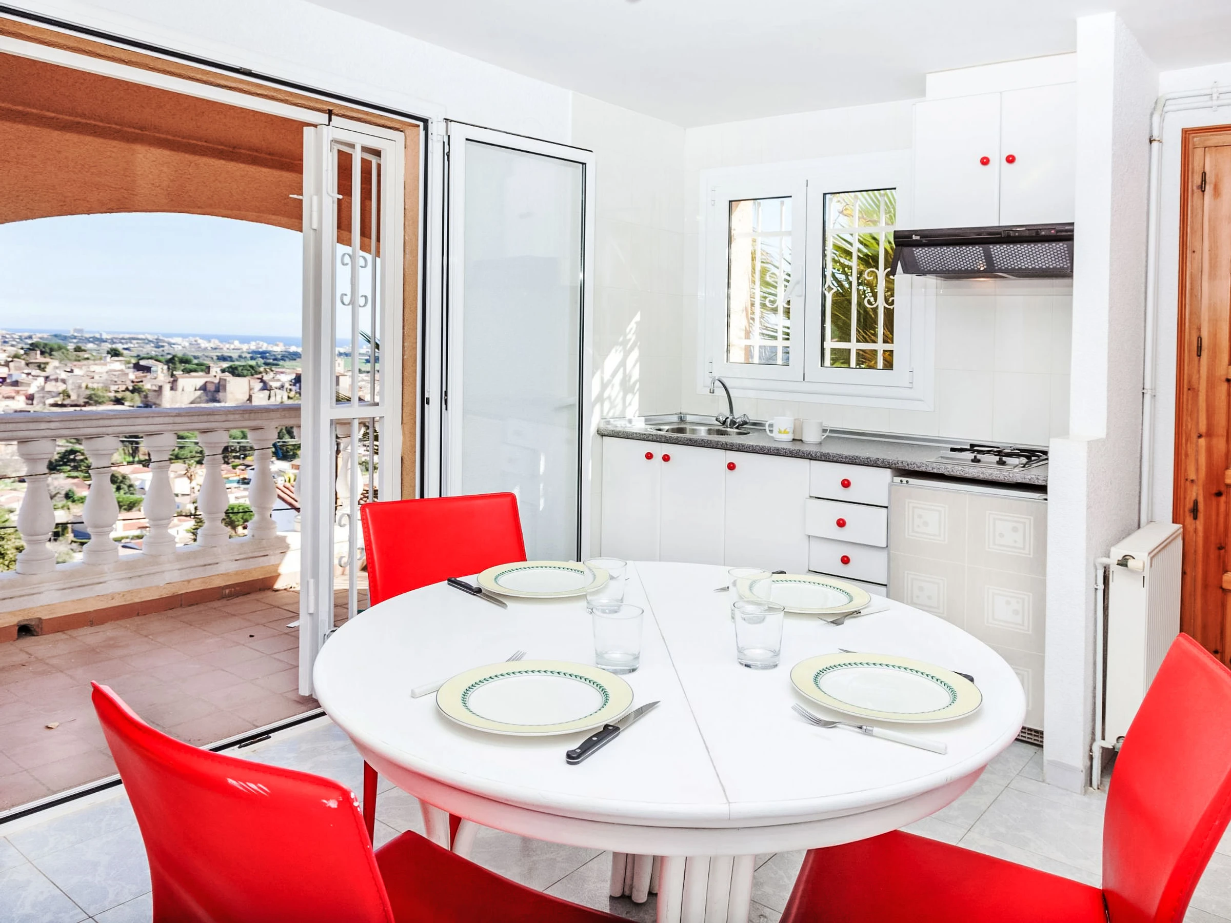 "Bella Vista", 6-room house 95 m2 on 3 levels. Practical furnishings: living/dining room with open-hearth fireplace, digital TV and air conditioning. Exit to the terrace. 1 room with 2 beds (90 cm, length 190 cm). Open kitchen (3 hot plates, oven, dishwasher, toaster, kettle, microwave, electric coffee machine). Bath/bidet/WC. Heating. On the lower ground floor: (exterior staircase) living/dining room. Exit to the terrace. 2 rooms, each room with 2 beds (90 cm, length 190 cm). Kitchenette (2 hot plates). Shower/WC. Upper floor: 1 room with 1 french bed (135 cm, length 190 cm), shower/WC. Exit to the terrace. Terrace. Terrace furniture, barbecue, deck chairs (4). Marvellous view of the sea, the mountains and the resort. Facilities: washing machine, iron, children's high chair, baby cot for up to 2 year olds. Internet (WiFi, free). Please note: non-smoking house. Maximum 1 pet/ dog allowed. TV only ES. [hidden] // Reg. Nr.: ESFCTU00001701500003032200000000000000000[hidden]4