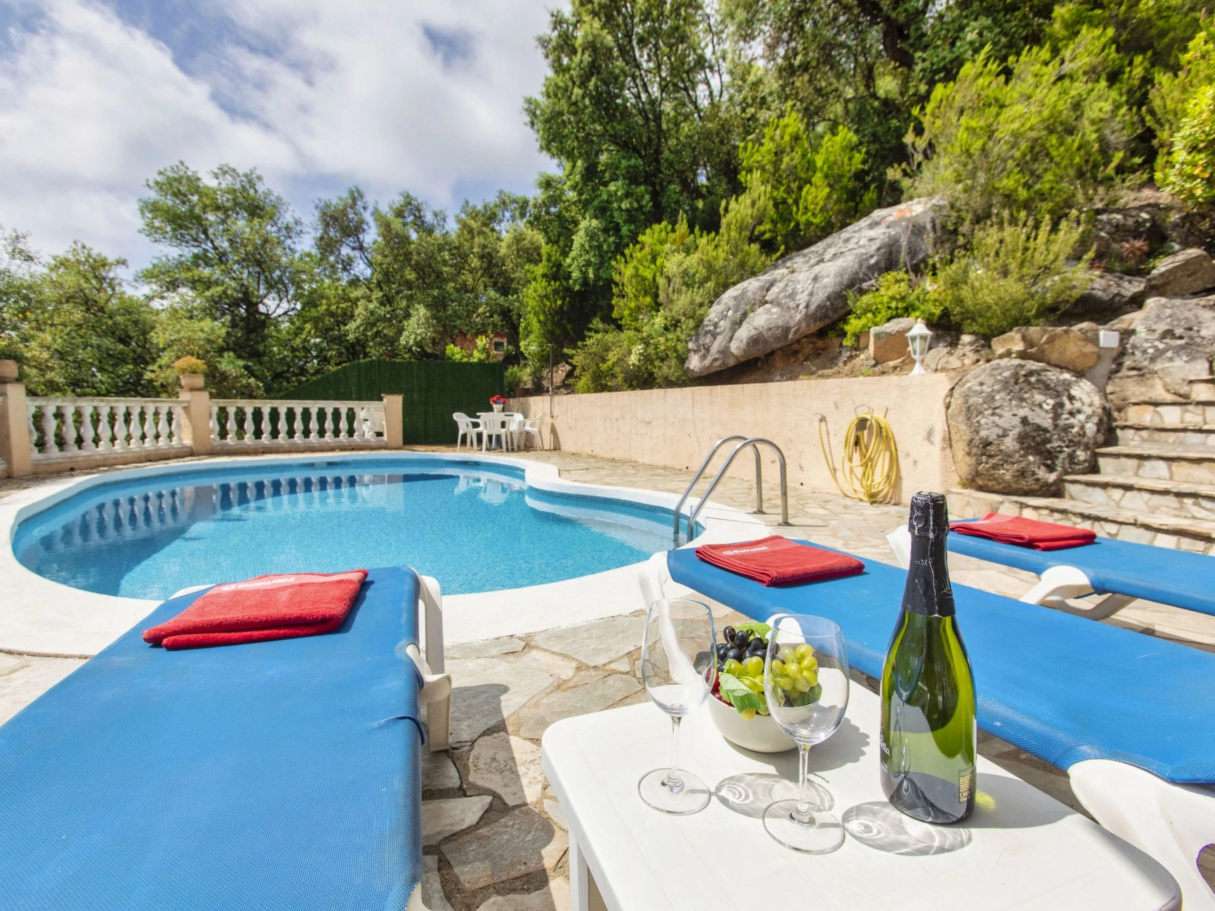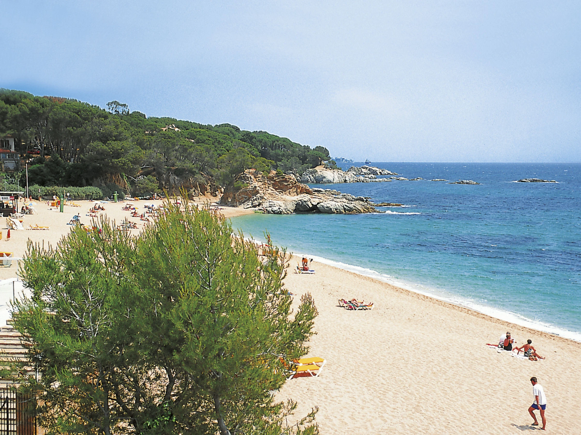 Mas Ambros, 1 km from Calonge: House "Bella Vista". In a quiet, sunny position on top of a hill, 4 km from the sea, in a cul-de-sac. Private: natural state property, swimming pool kidney shaped (7 x 3 m, depth 80 - 190 cm, seasonal availability: [hidden] - [hidden] Stepped path to the house. Single garage, public parking on the road. Supermarket 1 km, restaurant 300 m, bus stop 1 km, sandy beach "Sant Antoni de Calonge" 4 km. Sports harbour 7 km, golf course (18 hole) 6 km, riding stable 12 km. Nearby attractions: Parque Acuatico "Aguadiver" 4 km. Please note: car recommended. Groups of teenagers on request only. Kidney shaped swimming pool. Grounds with rockery and plants.