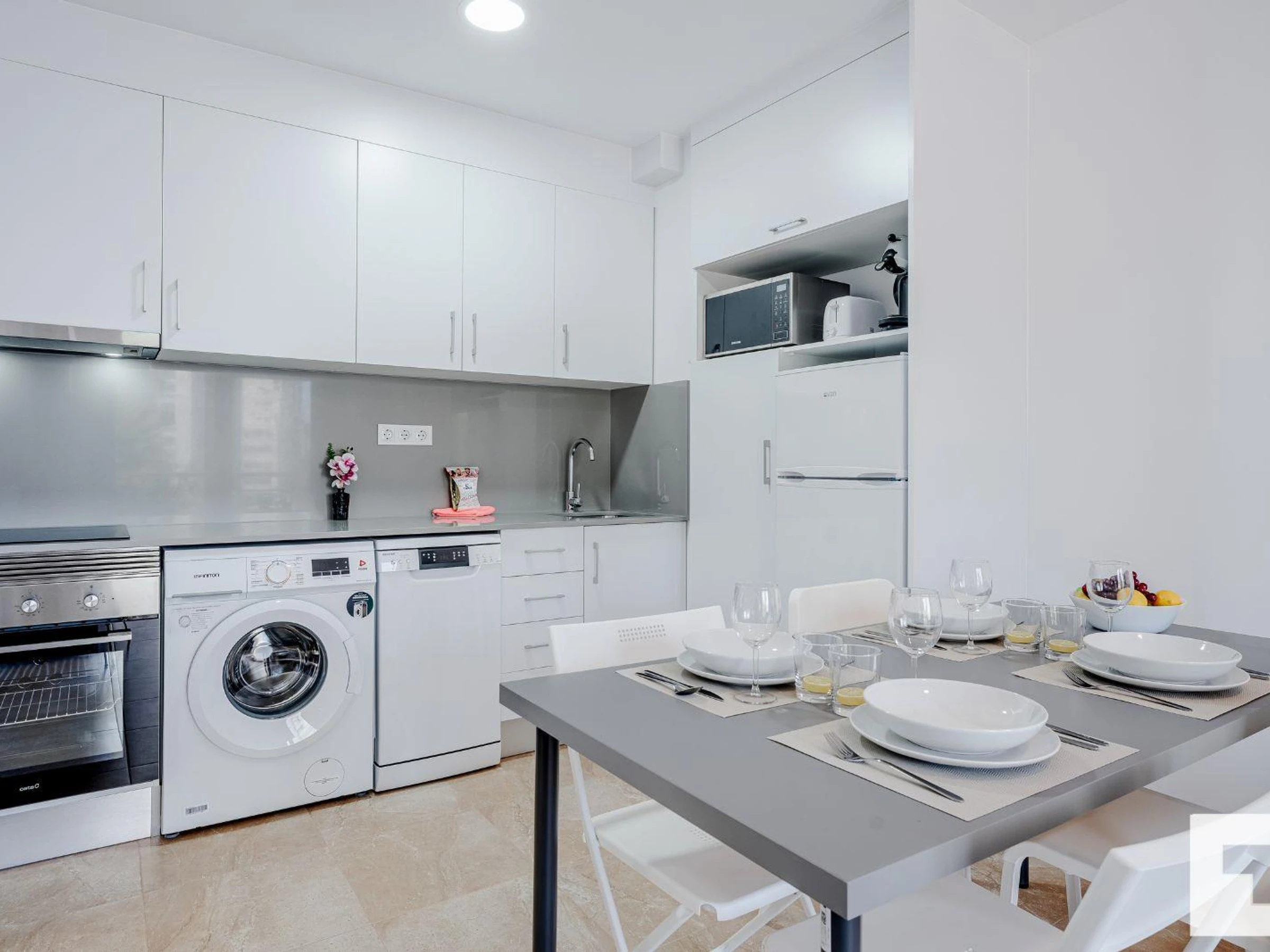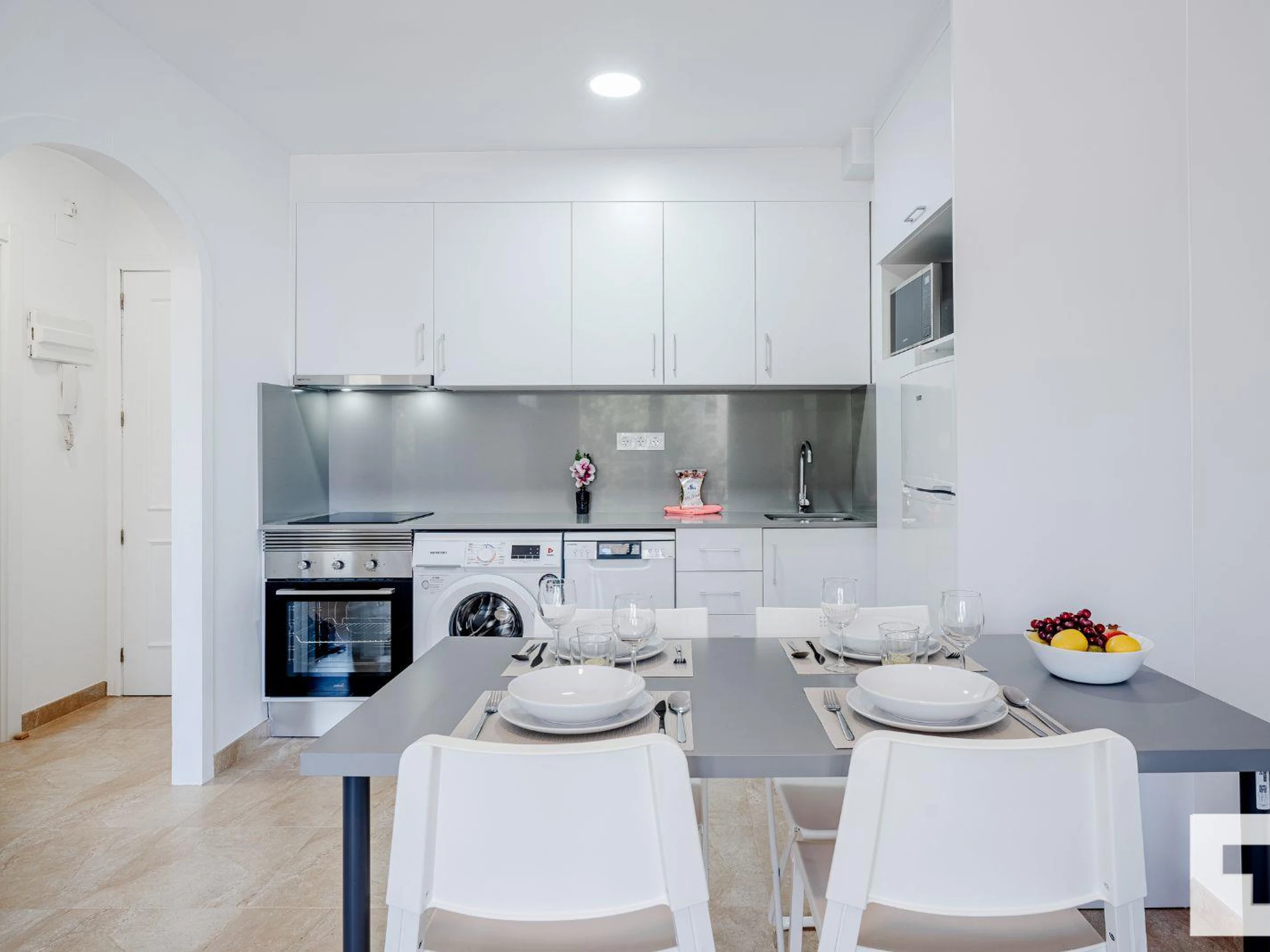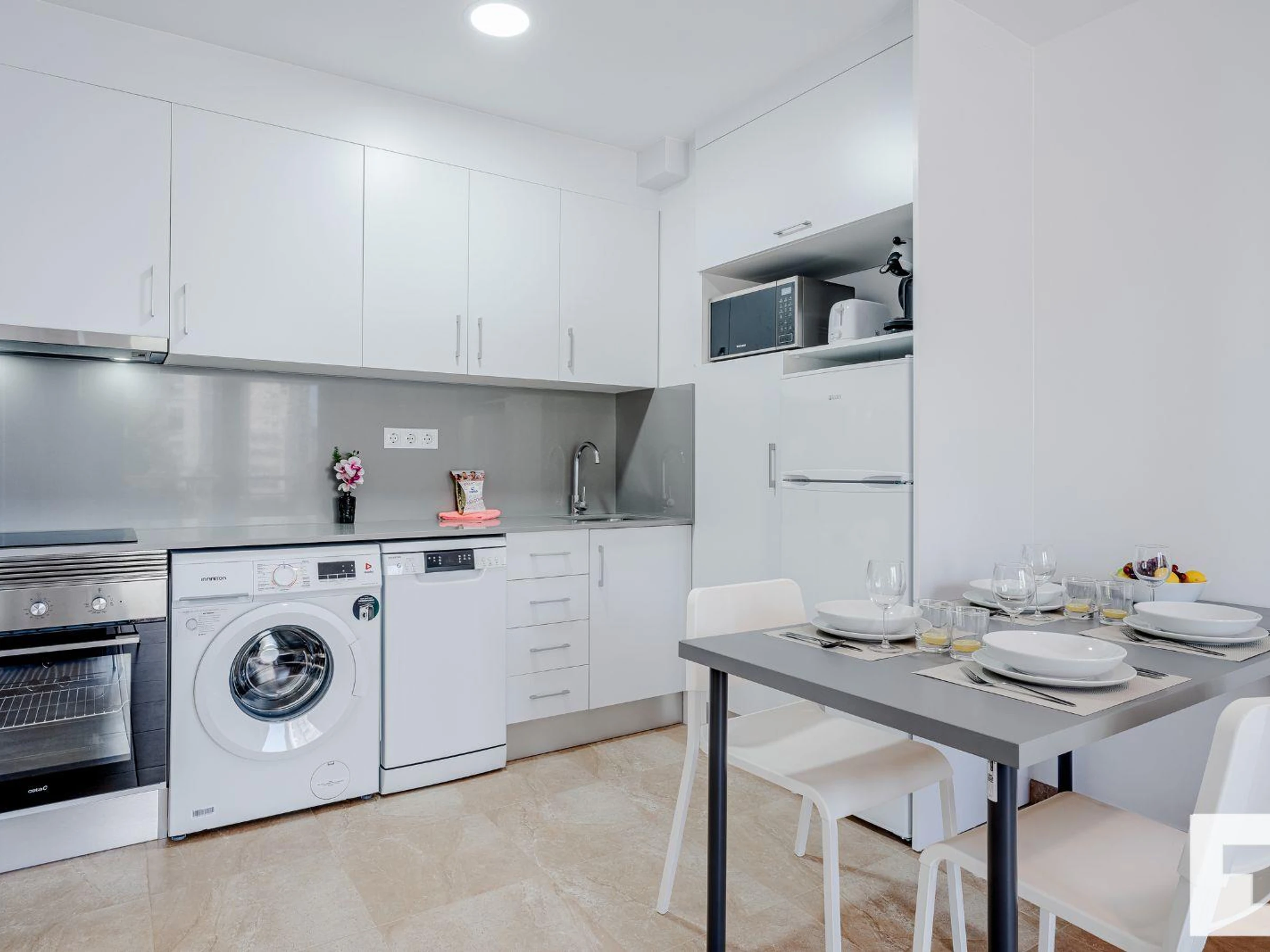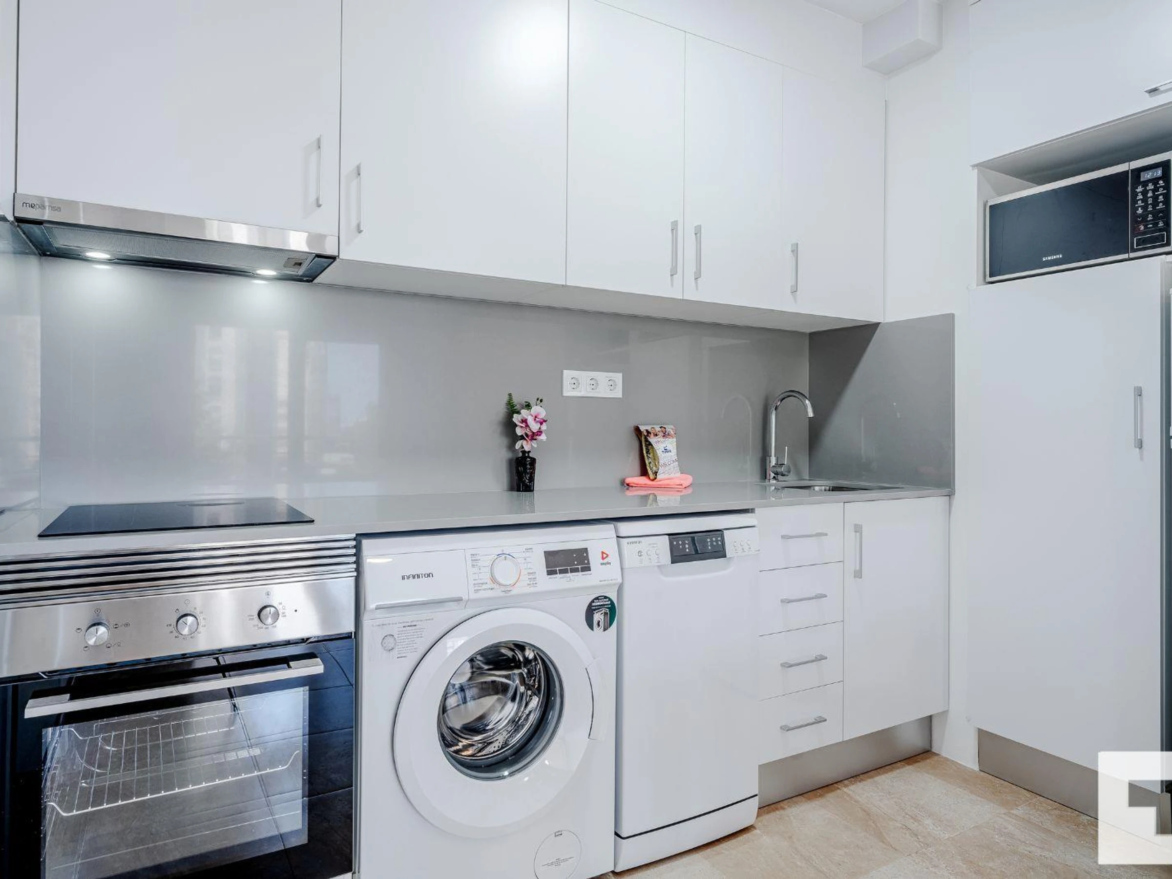 π³ Open-plan kitchen fully equipped with ceramic hob, oven, washing machine,
