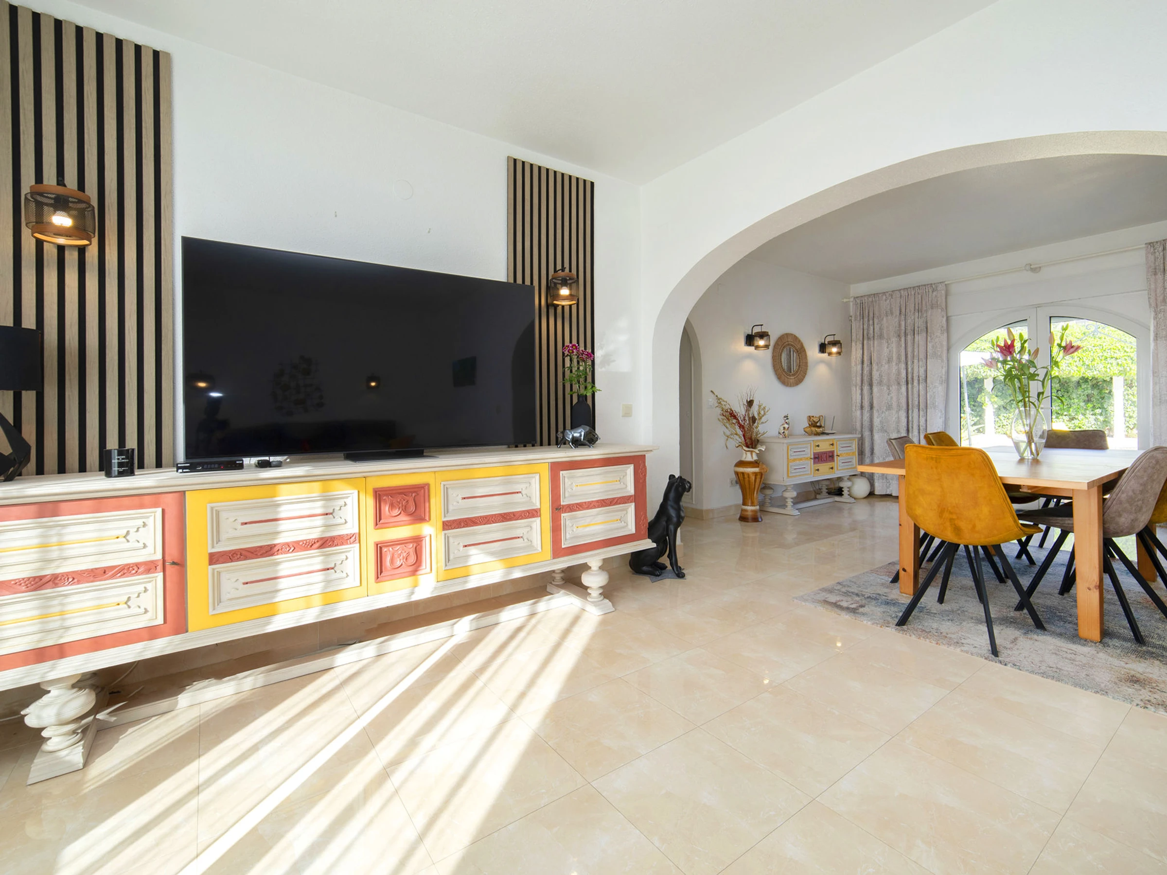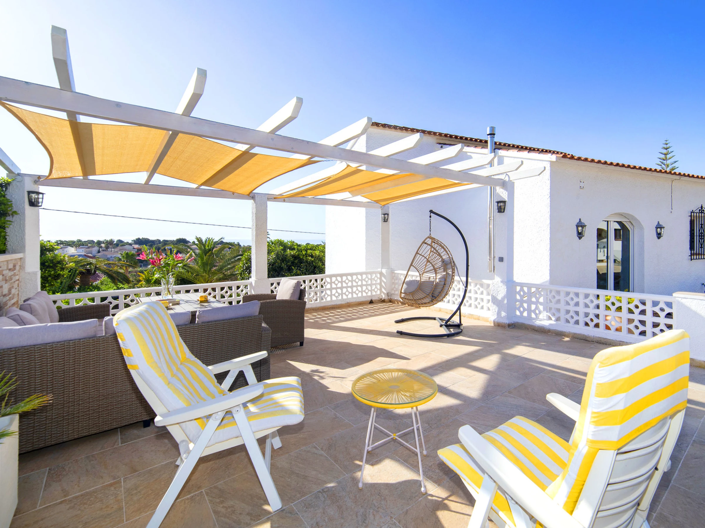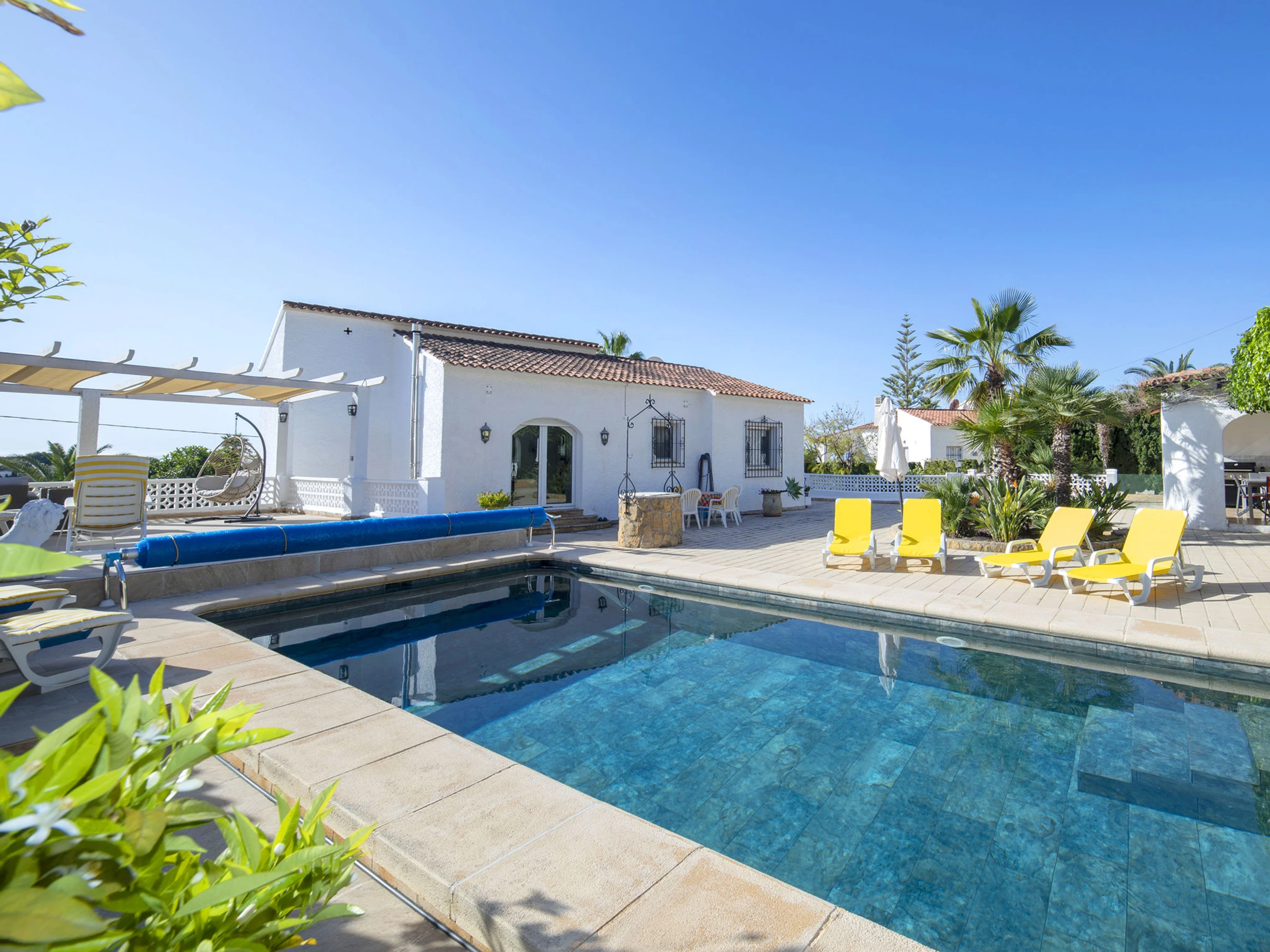 Gran Sol: House "La Grippiere". In the resort 4.4 km from the centre of Calpe, in a quiet, sunny position, 2.1 km from the sea. Private: property 900 m2 (fenced), terraced garden, swimming pool (4 x 9 m, depth 145 - 195 cm, seasonal availability: [hidden] - [hidden] with internal staircase. Terrace. Stepped path (15 steps) to the house. Supermarket 2.8 km, restaurant 2.1 km, bar 2.1 km, bus stop "Parada bus" 1.6 km, sandy beach 2.2 km. Sports harbour 4.6 km, marina 4.6 km, golf course (9 hole) 7.8 km, tennis 3.8 km. Nearby attractions: Aqualandia, Mundomar, Terra Mítica, Terra Natura, Benidorm Palace en Benidorm.