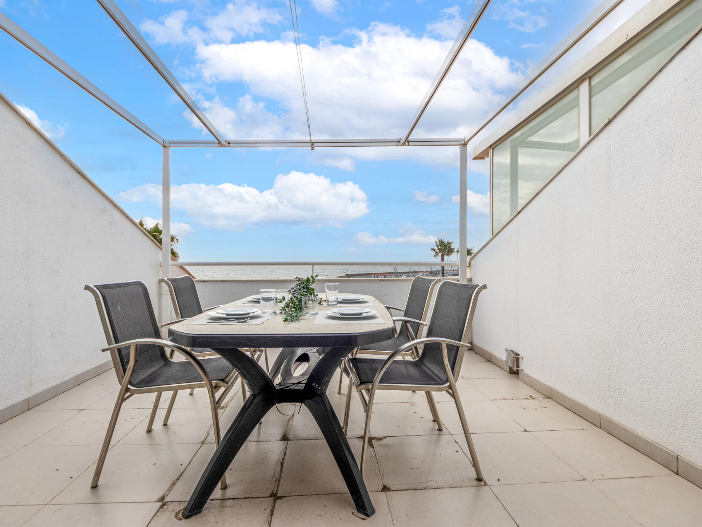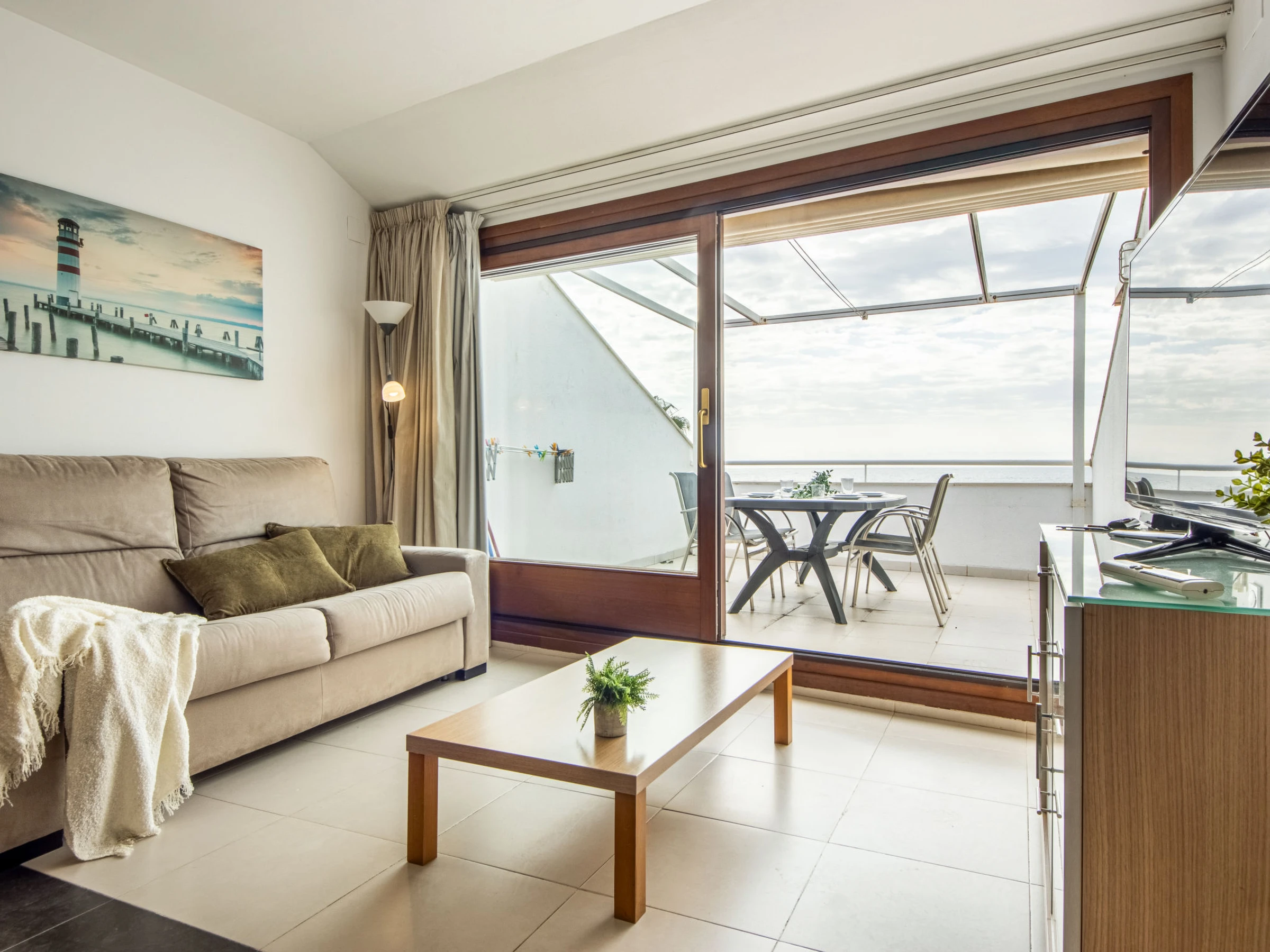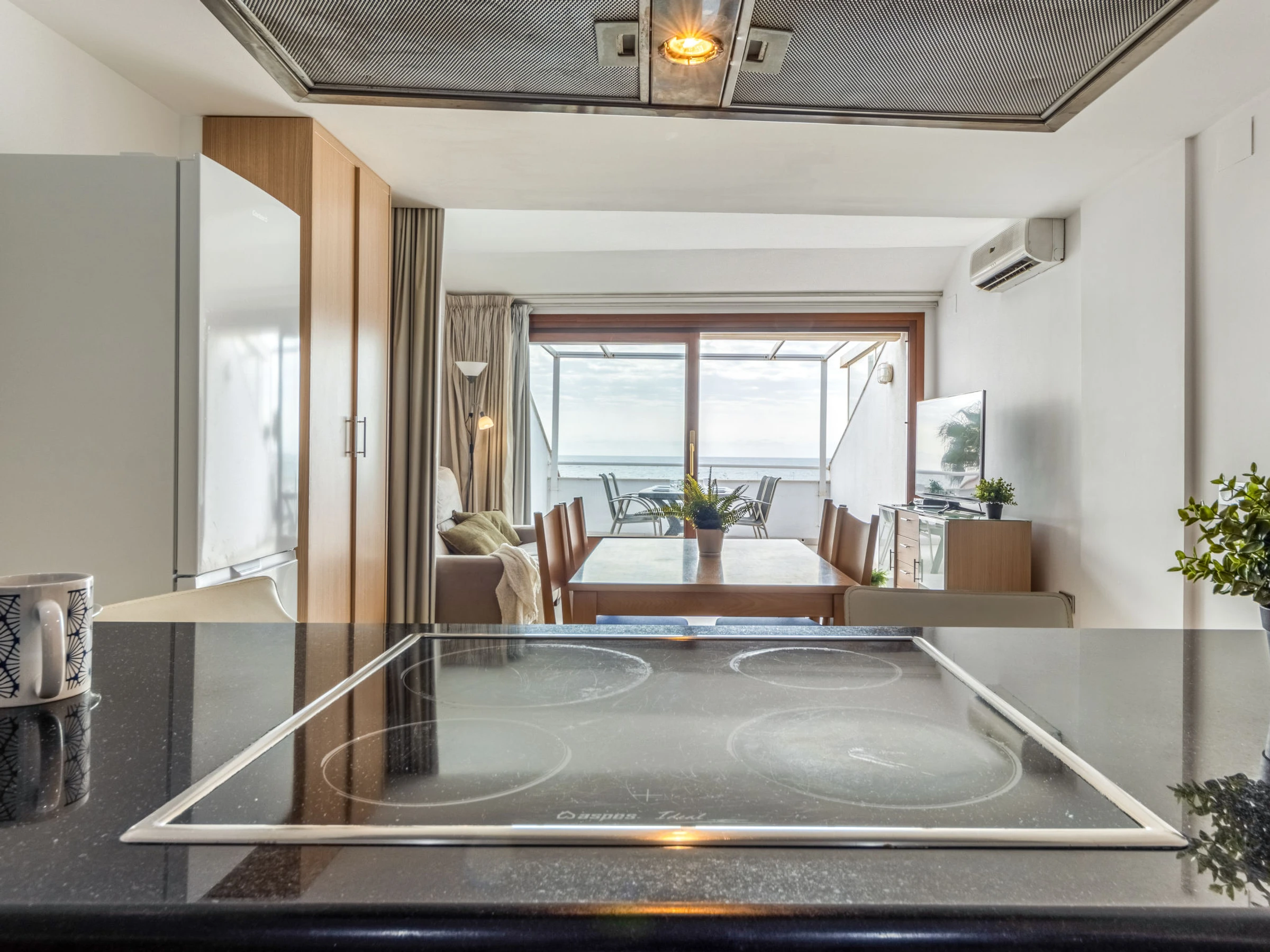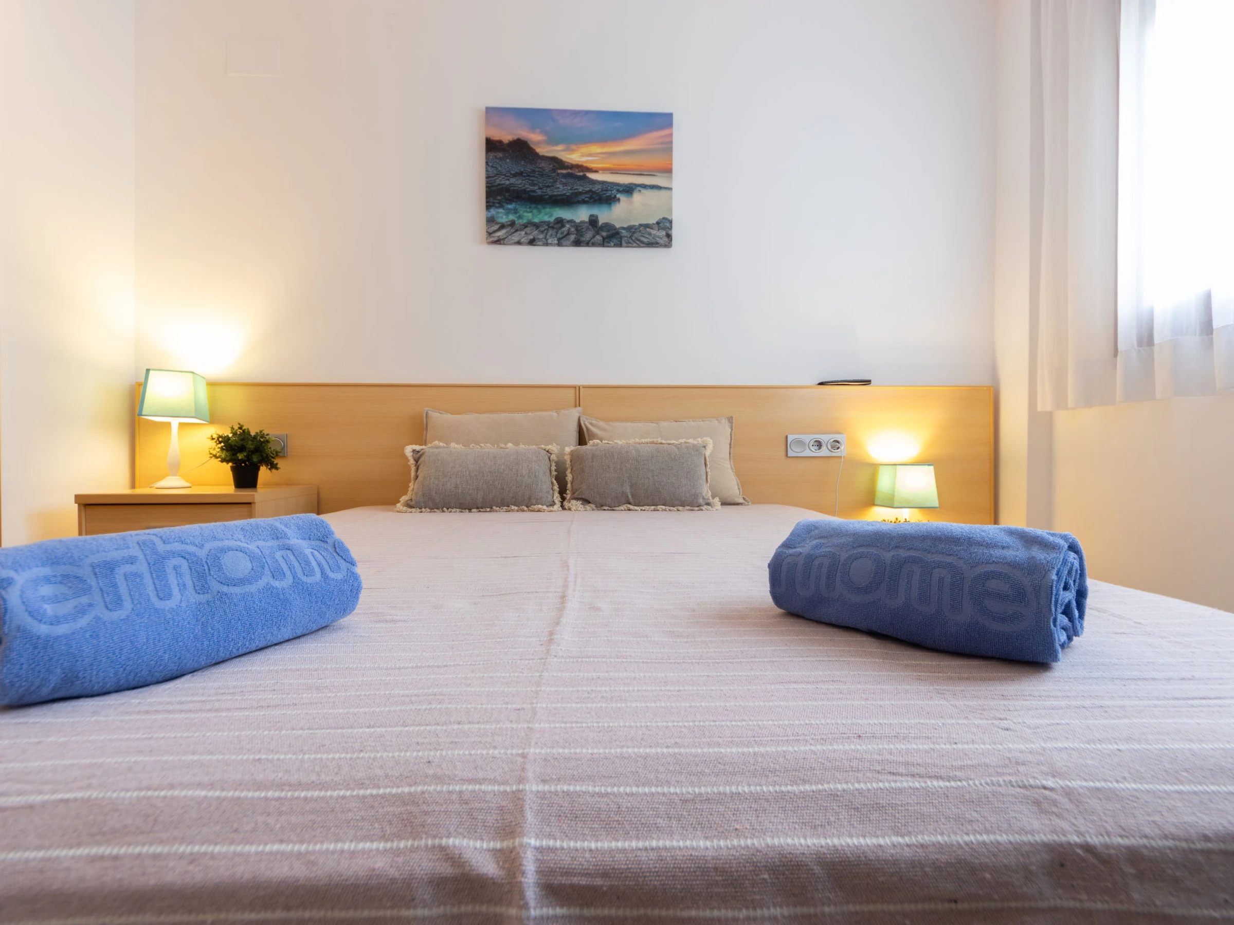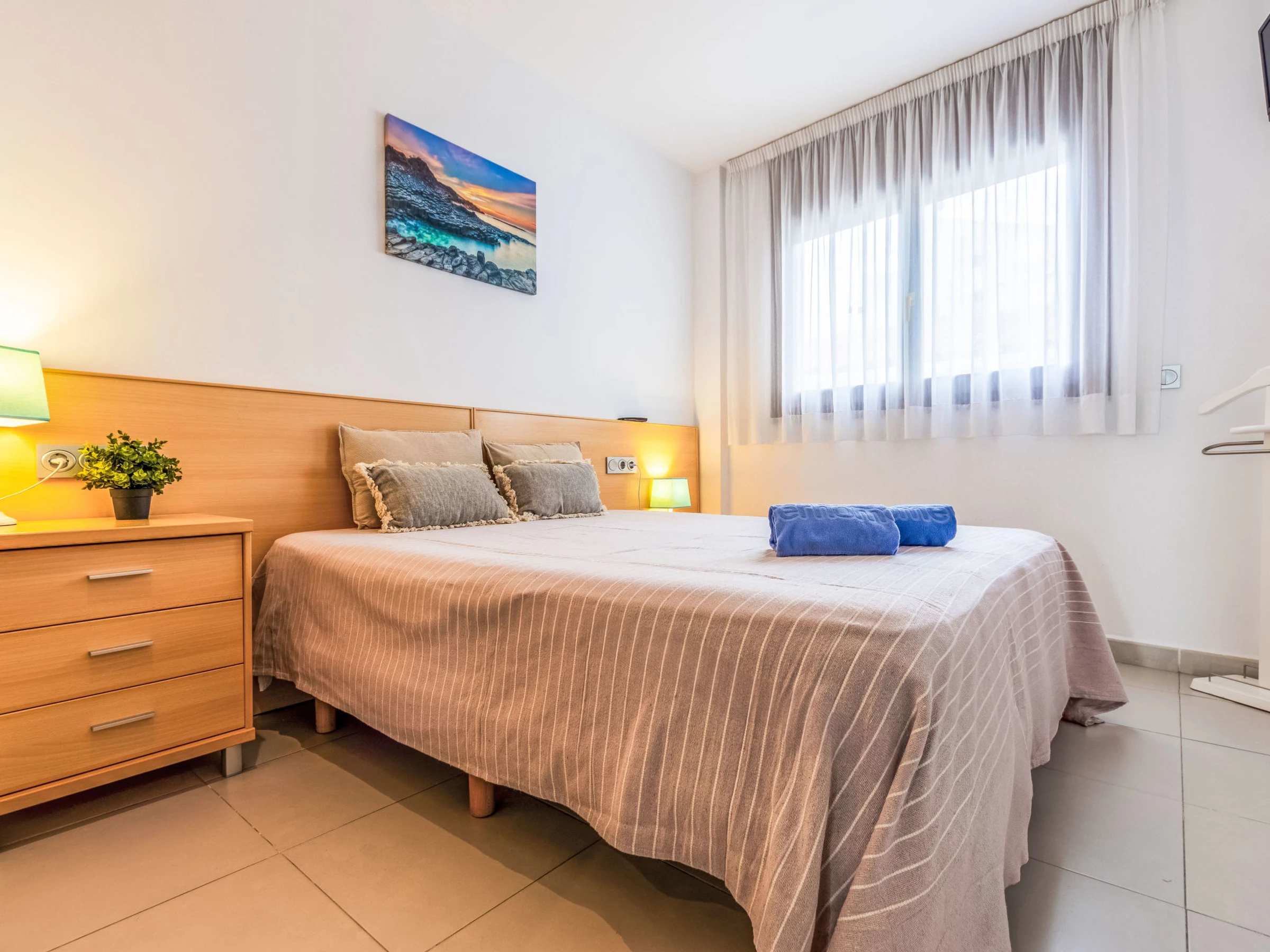 "Voramar 4", 2-room apartment 50 m2. Practical and comfortable furnishings: living/dining room with 1 double sofabed (150 cm, length 190 cm), digital TV, air conditioning and forced-air heating. Exit to the loggia. 1 room with 1 french bed (135 cm, length 190 cm), air conditioning and forced-air heating. Open kitchen (oven, dishwasher, 3 ceramic glass hob hotplates, toaster, kettle, microwave, electric coffee machine, Capsules for coffee machine (Nespresso)) with dining table, boiler (100 litres). Shower/WC. Heating not available in all rooms. Balcony. Balcony furniture. Very beautiful panoramic view of the sea. Facilities: washing machine, iron, children's high chair, baby cot, hair dryer. Suitable for families. Maximum 1 pet/ dog allowed. [hidden] // Reg. Nr.: ESFCTU00004303100042064700000000000000[hidden]-498