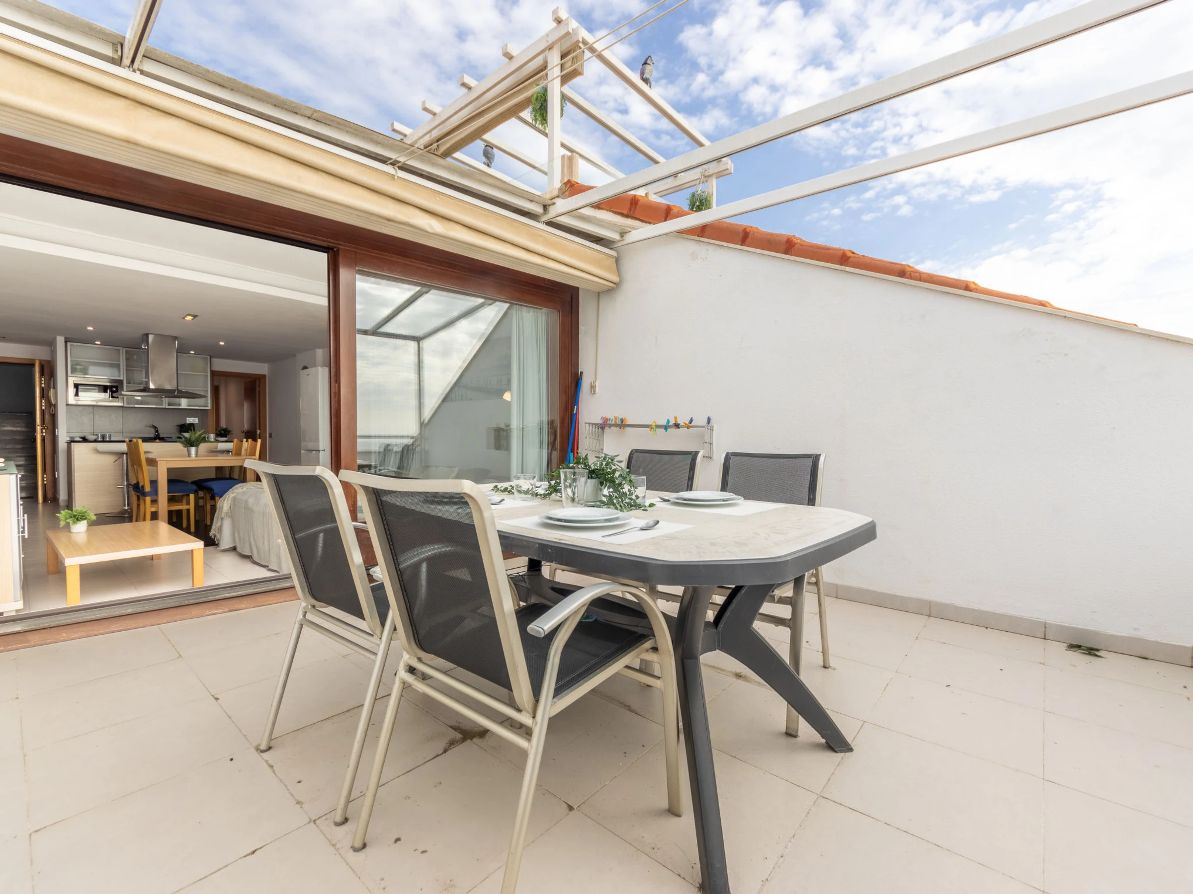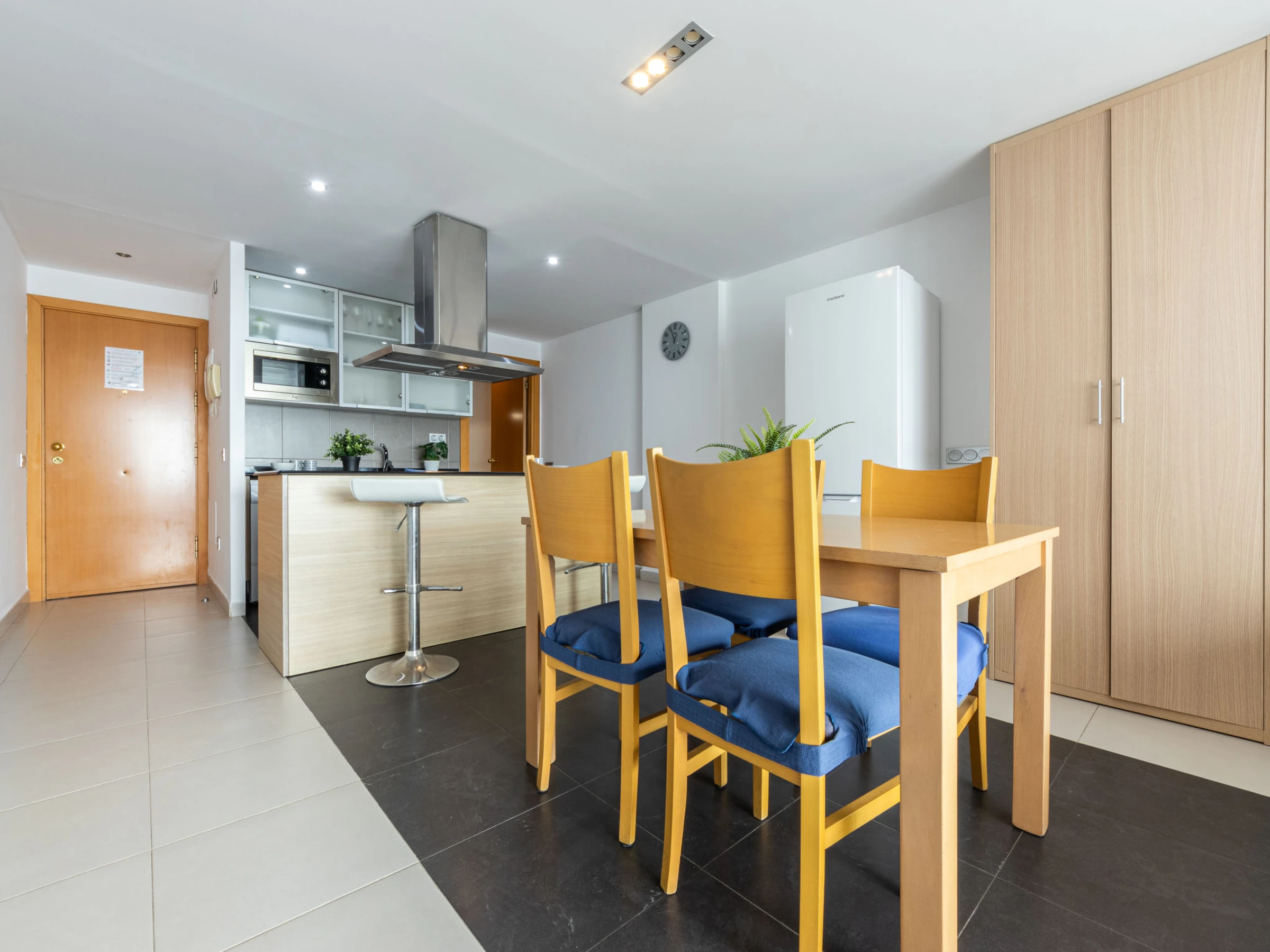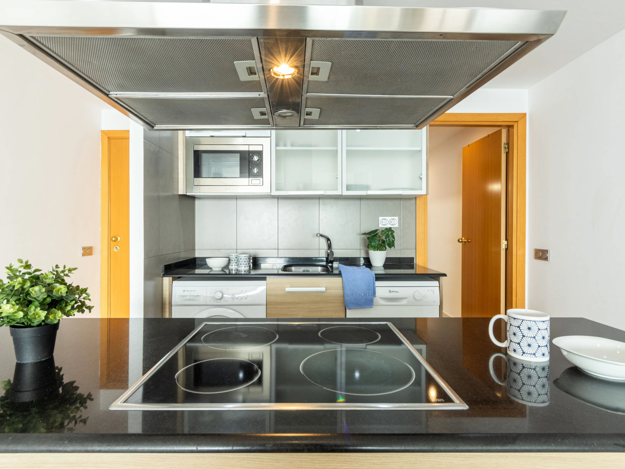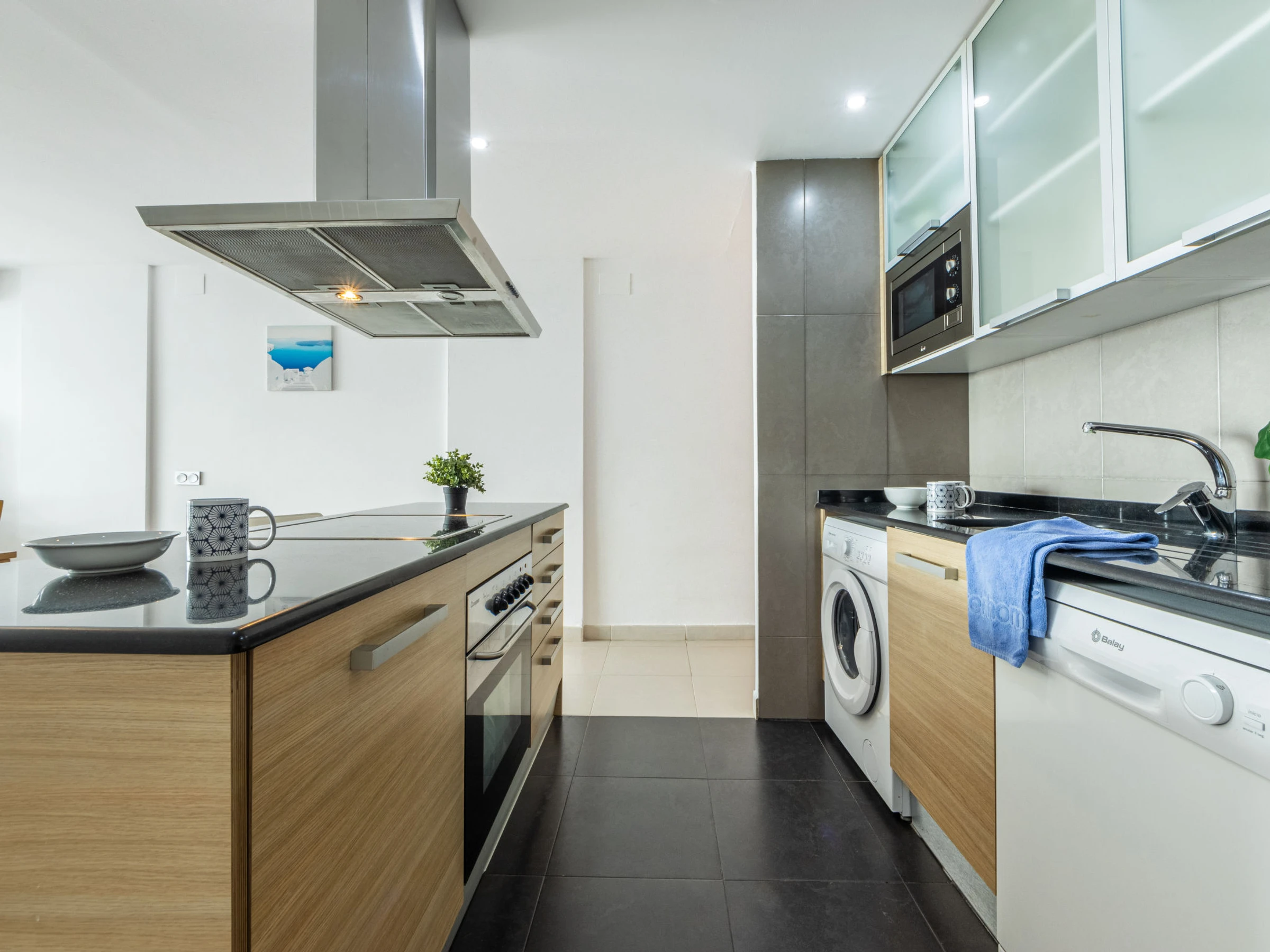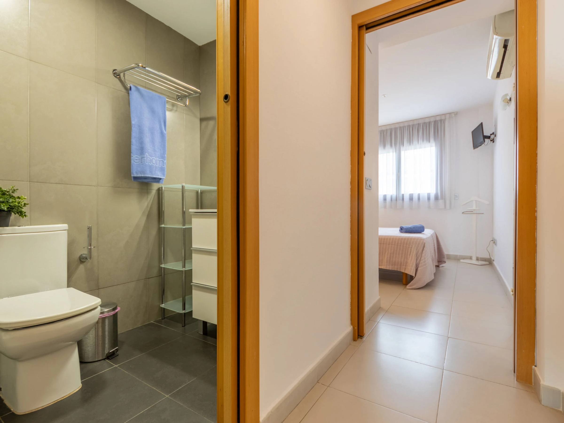 "Voramar 4", 2-room apartment 50 m2. Practical and comfortable furnishings: living/dining room with 1 double sofabed (150 cm, length 190 cm), digital TV, air conditioning and forced-air heating. Exit to the loggia. 1 room with 1 french bed (135 cm, length 190 cm), air conditioning and forced-air heating. Open kitchen (oven, dishwasher, 3 ceramic glass hob hotplates, toaster, kettle, microwave, electric coffee machine, Capsules for coffee machine (Nespresso)) with dining table, boiler (100 litres). Shower/WC. Heating not available in all rooms. Balcony. Balcony furniture. Very beautiful panoramic view of the sea. Facilities: washing machine, iron, children's high chair, baby cot, hair dryer. Suitable for families. Maximum 1 pet/ dog allowed. [hidden] // Reg. Nr.: ESFCTU00004303100042064700000000000000[hidden]-498