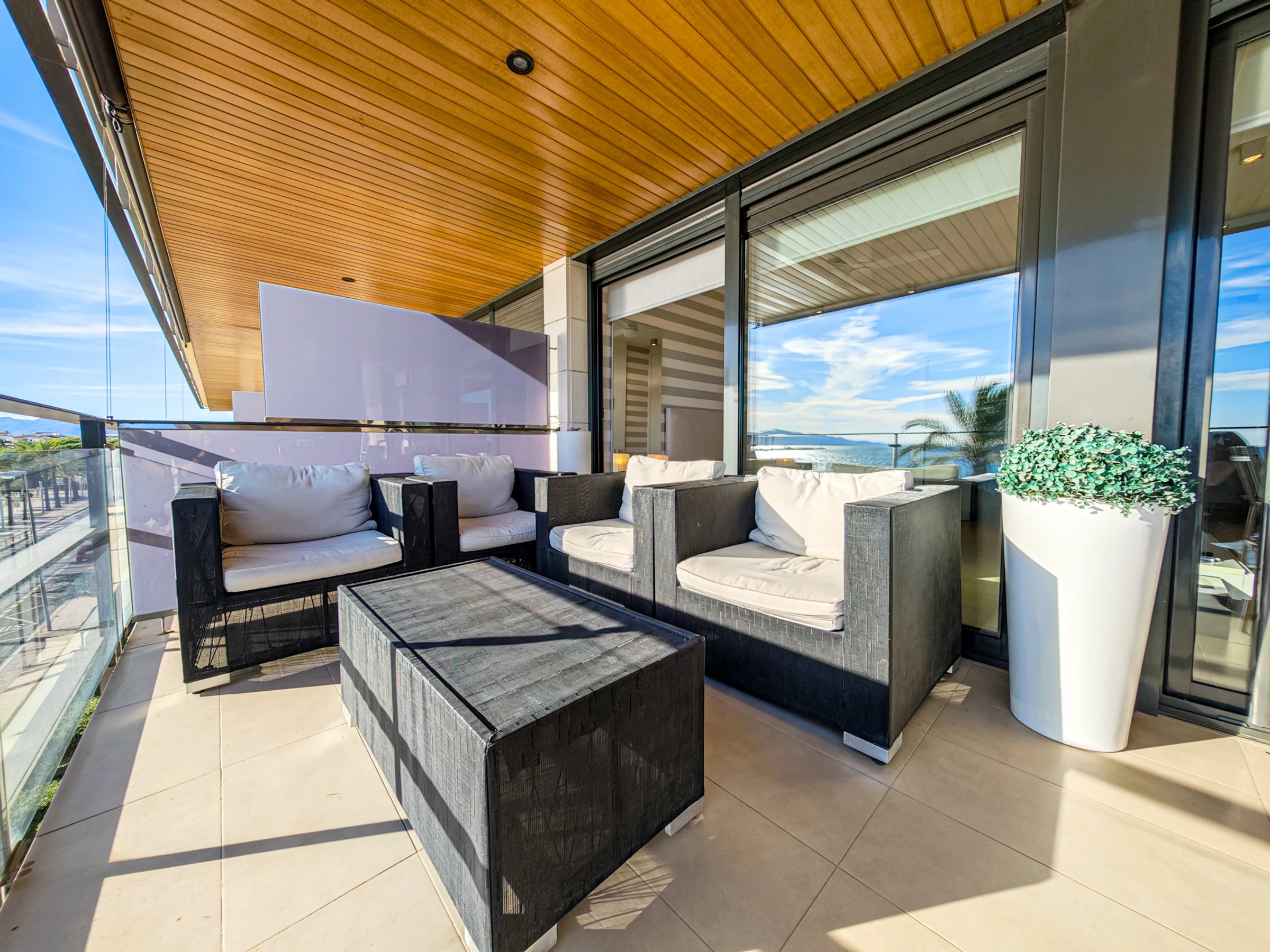 Large terrace with relaxing sofas, awnings and spectacular furniture in front of the main beach of Cambrils.