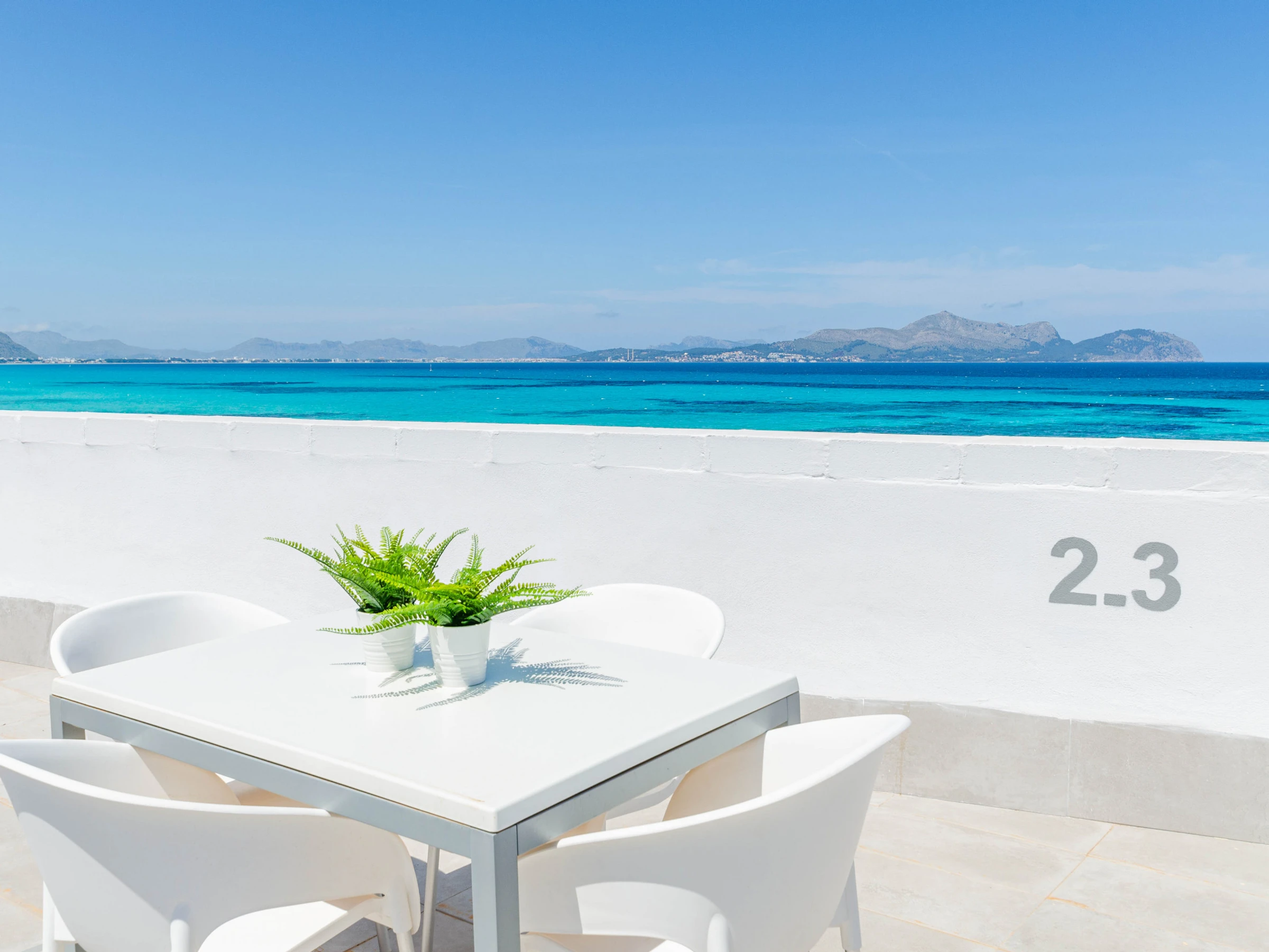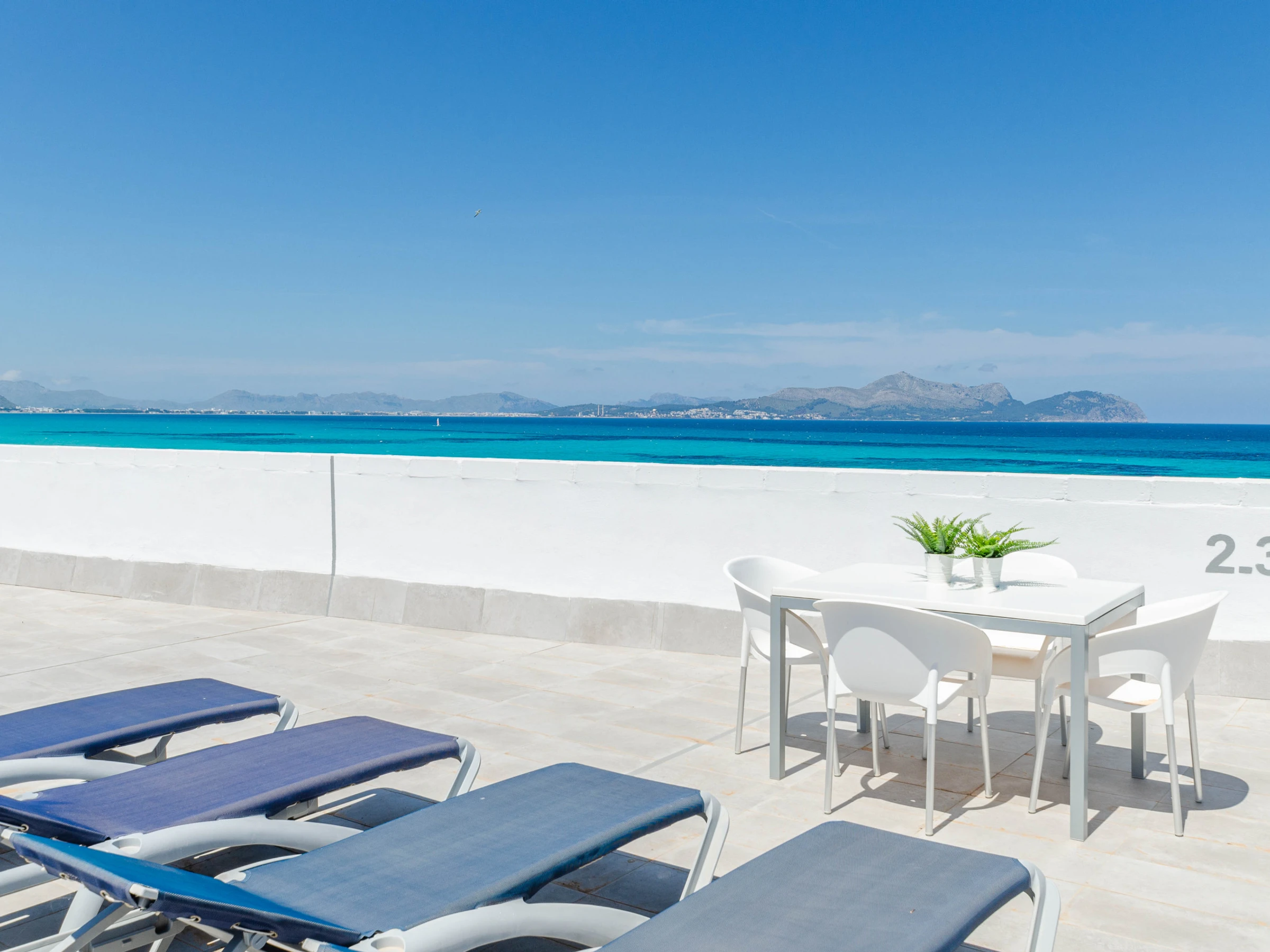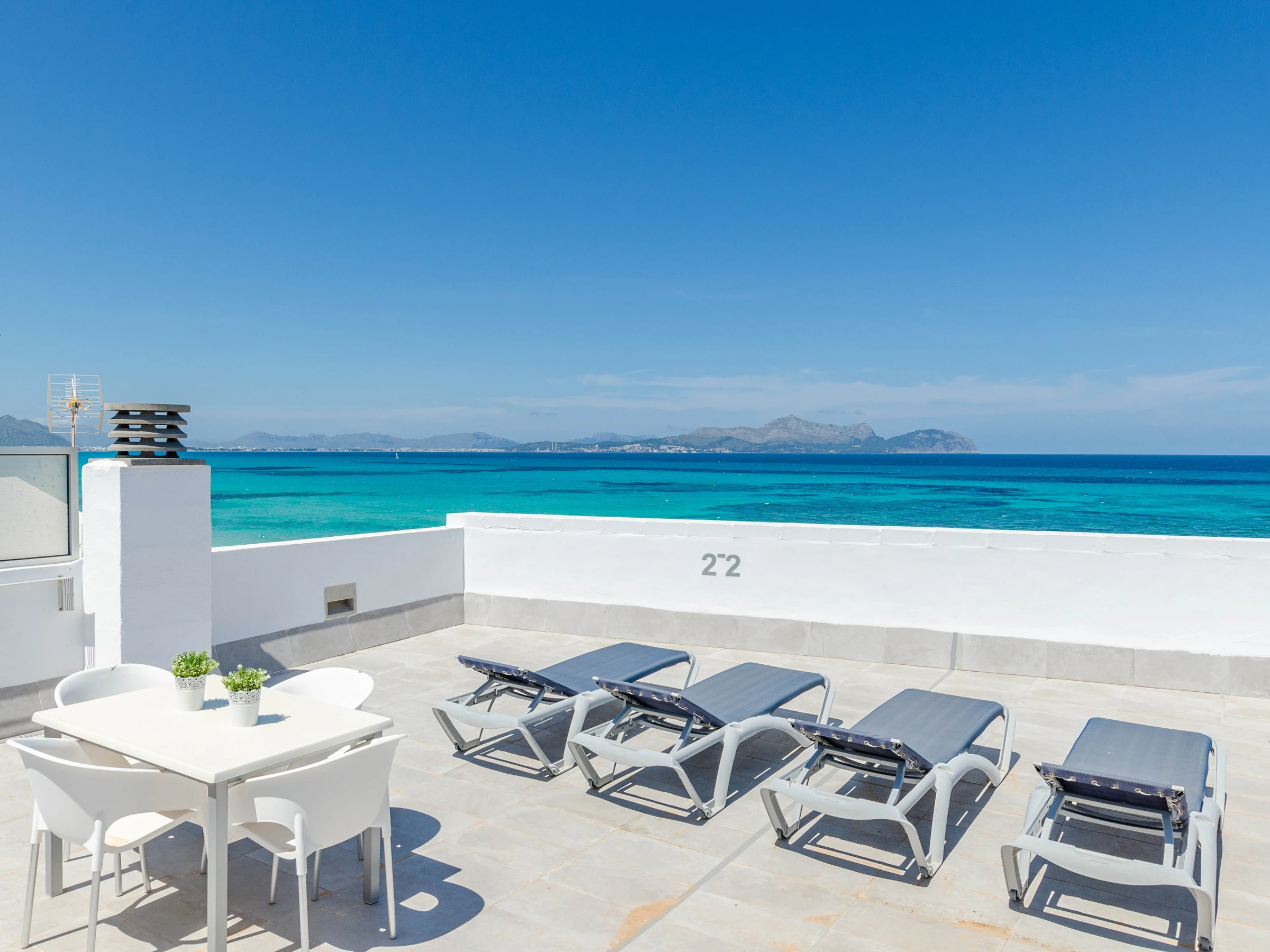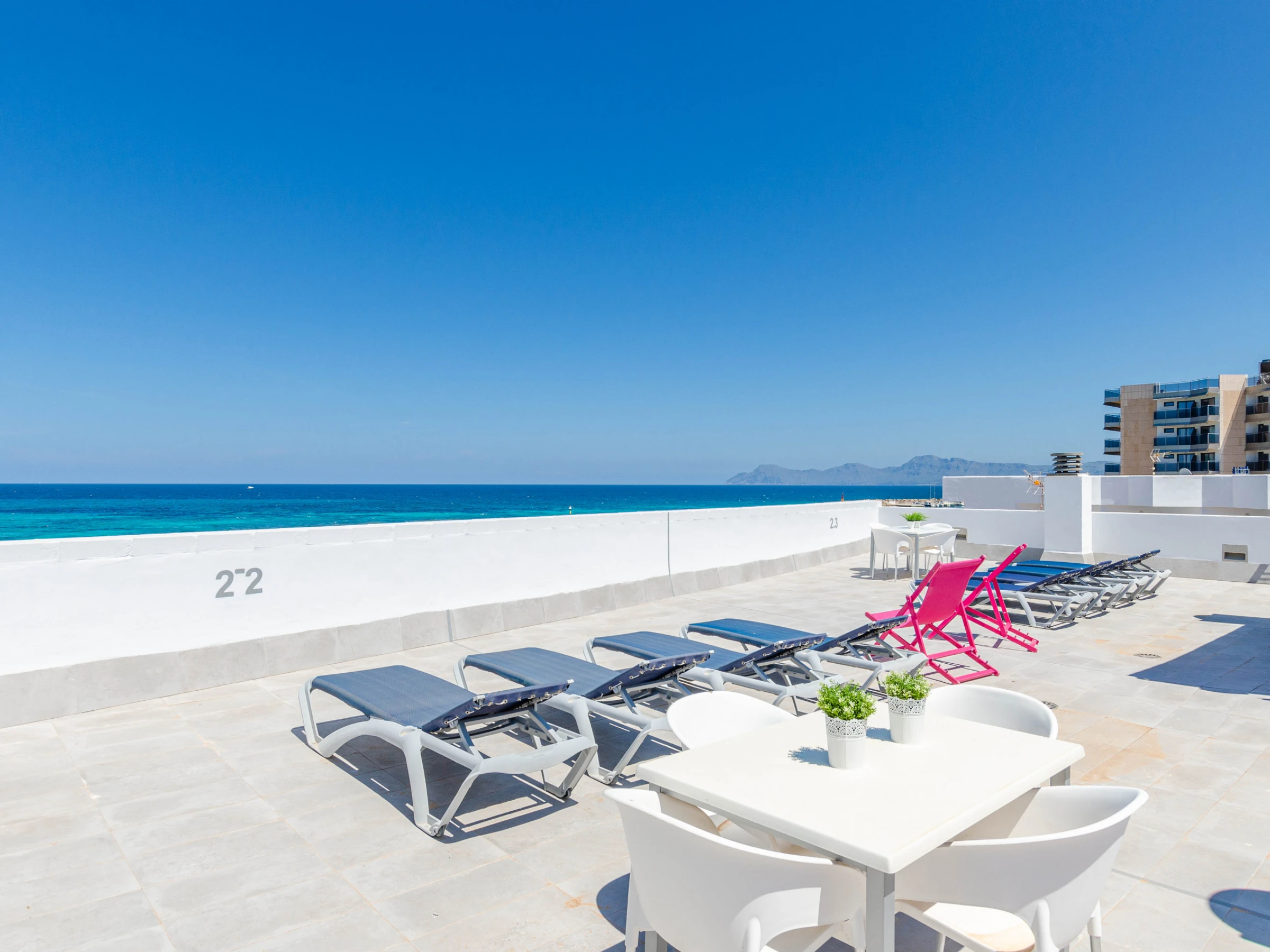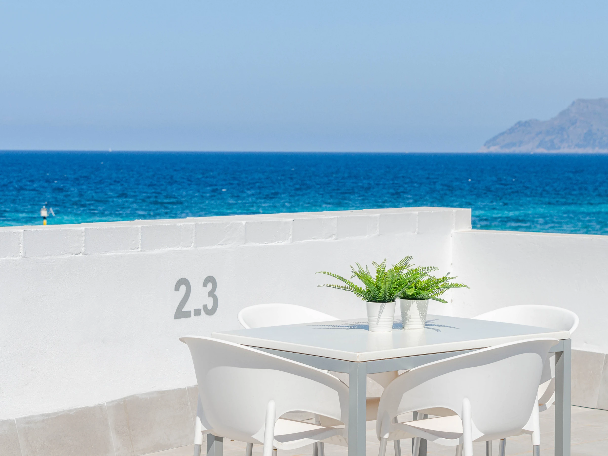 The apartments are perfect for 4 guests and consist of 2 twin bedrooms, a living-dining area, a kitchen with basic equipment including a coffee machine and a kettle, a bathroom, and a washing machine. If you come with your baby, we can supply a cot and a high chair on request. You can start your day with a large breakfast in the dining room with sea views. There’s air conditioning in the living area and free Wifi. The shared sun terrace is on the top floor and has amazing sea views.