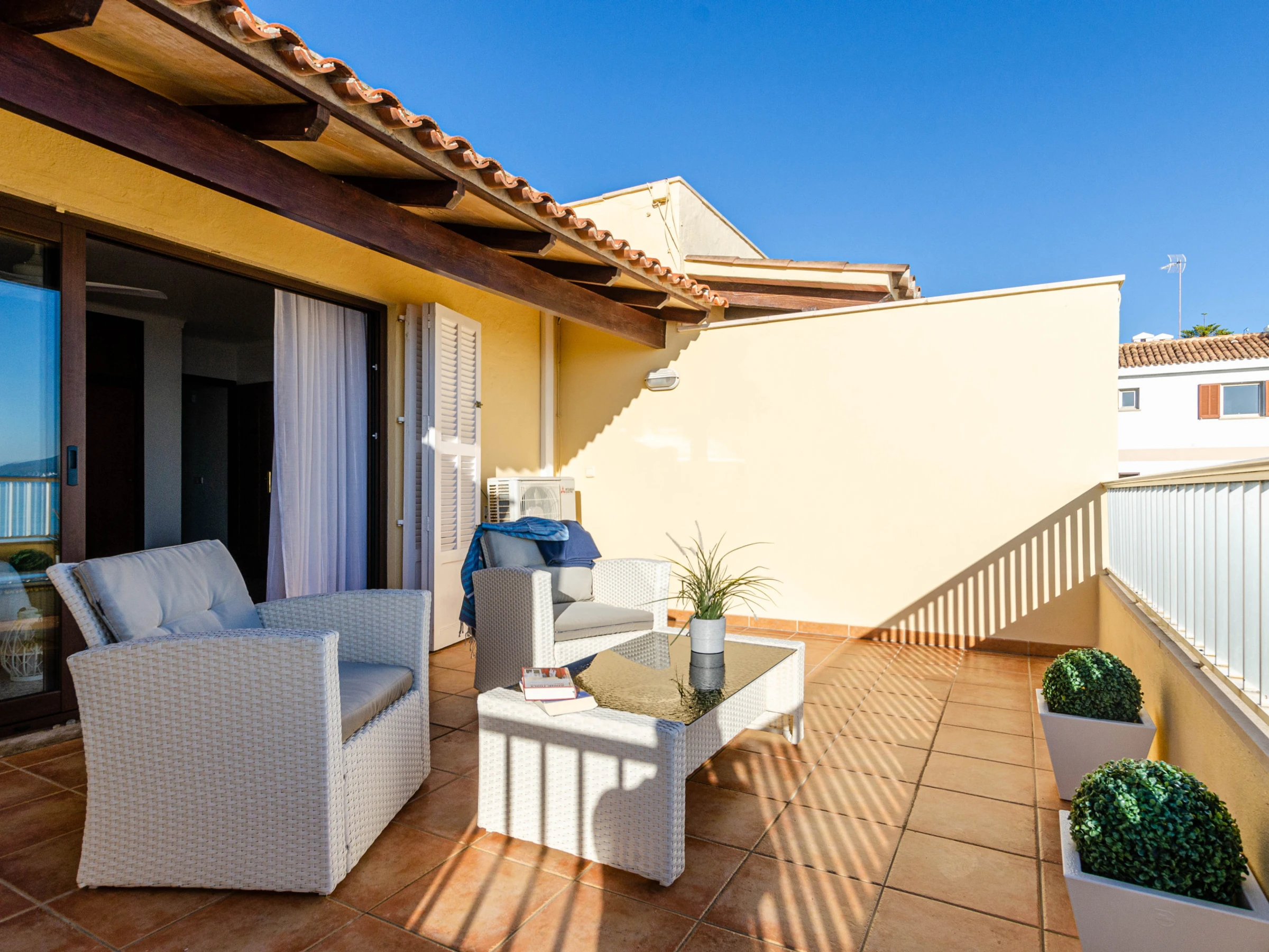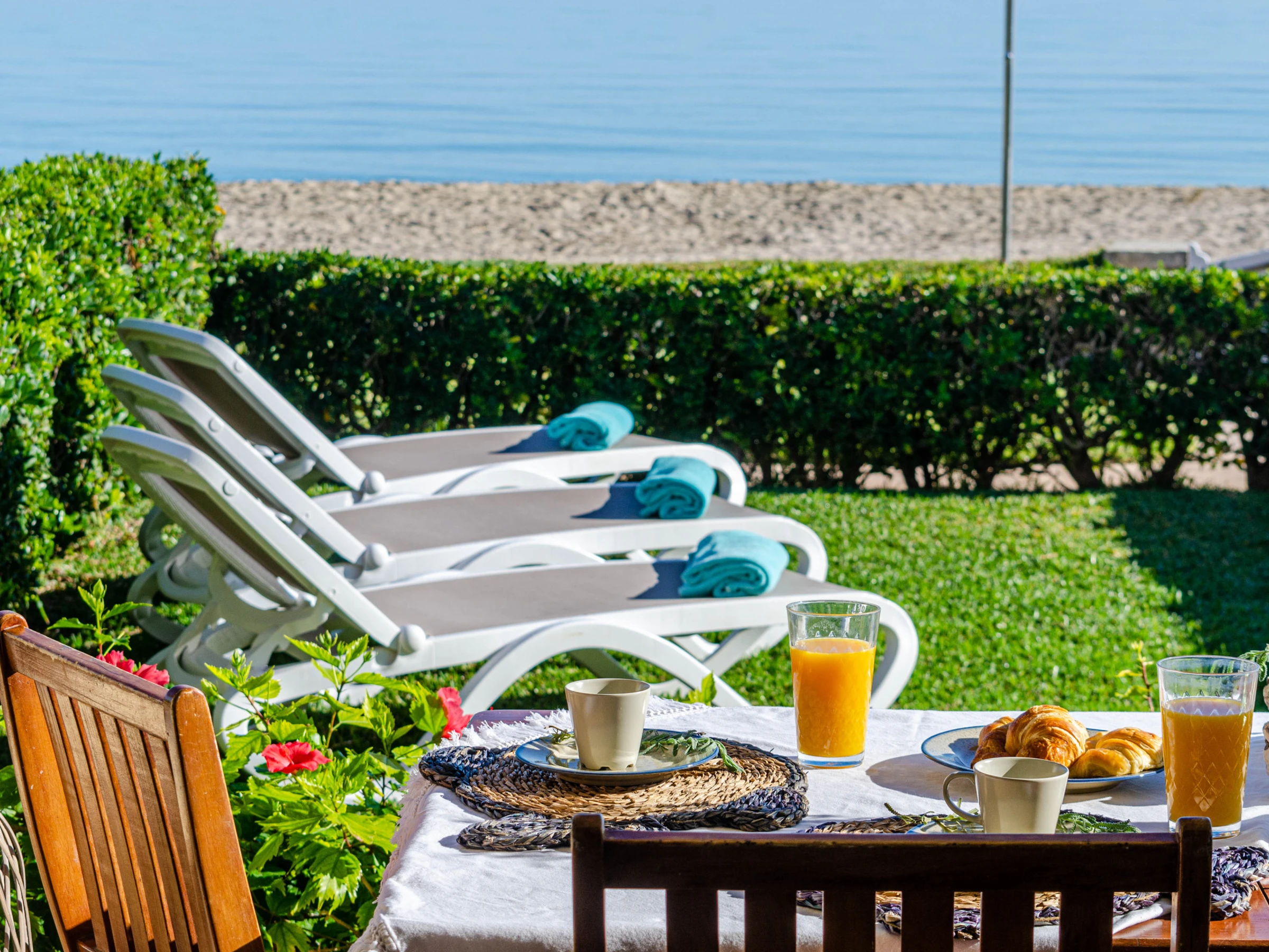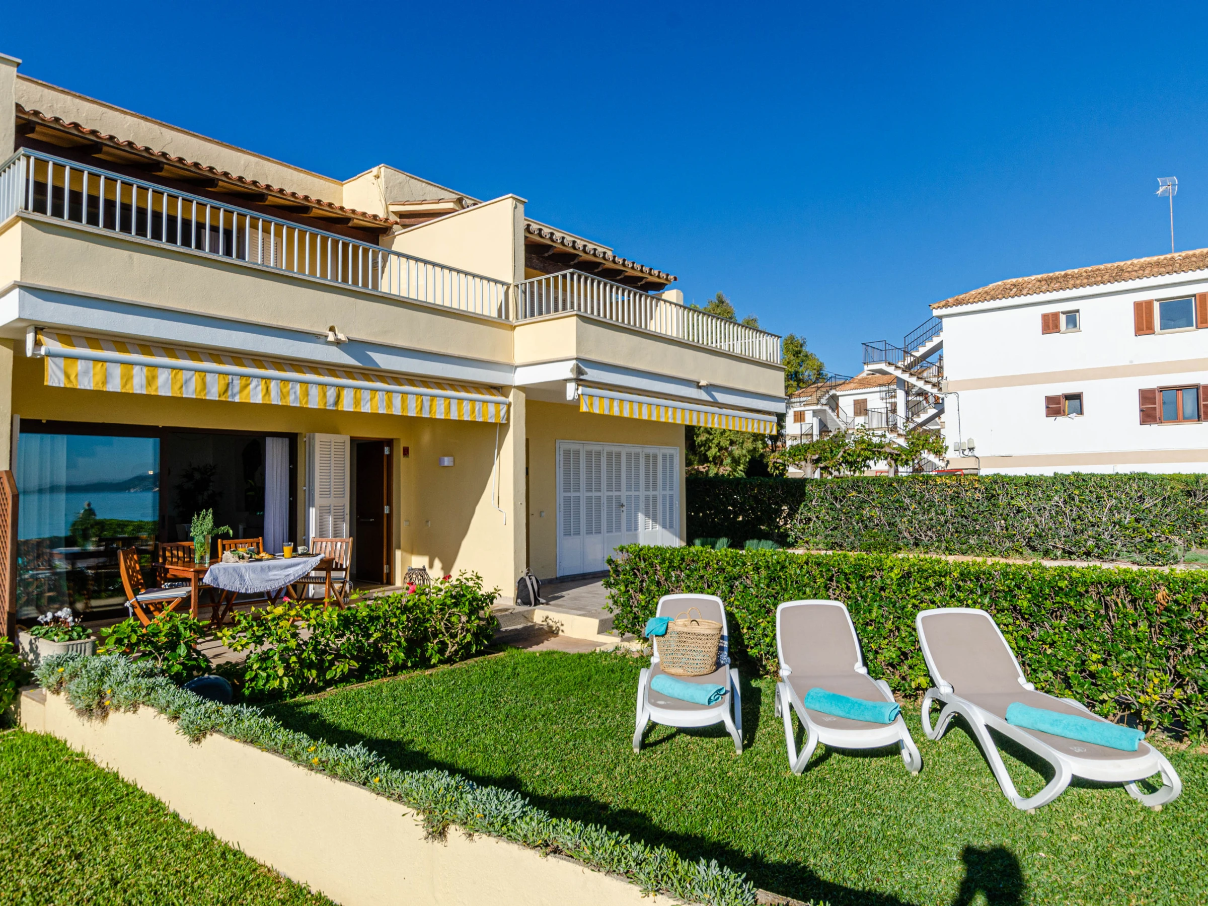 The terrace with sea views is a nice place for a large breakfast. The garden with 4 loungers is perfect for a little siesta. The terrace gives access to the living-dining area with satellite-TV. The independent kitchen with gas cooker and dishwasher is well-equipped. The apartment has 3 bedrooms, two with 2 single beds each and the master bedroom, equipped with a double bed and en-suite shower bath with hair dryer. Two of the bedrooms have air conditioning while the third room has a fan. There’s another bath with shower, a baby bed, a washing machine and fast Wifi.