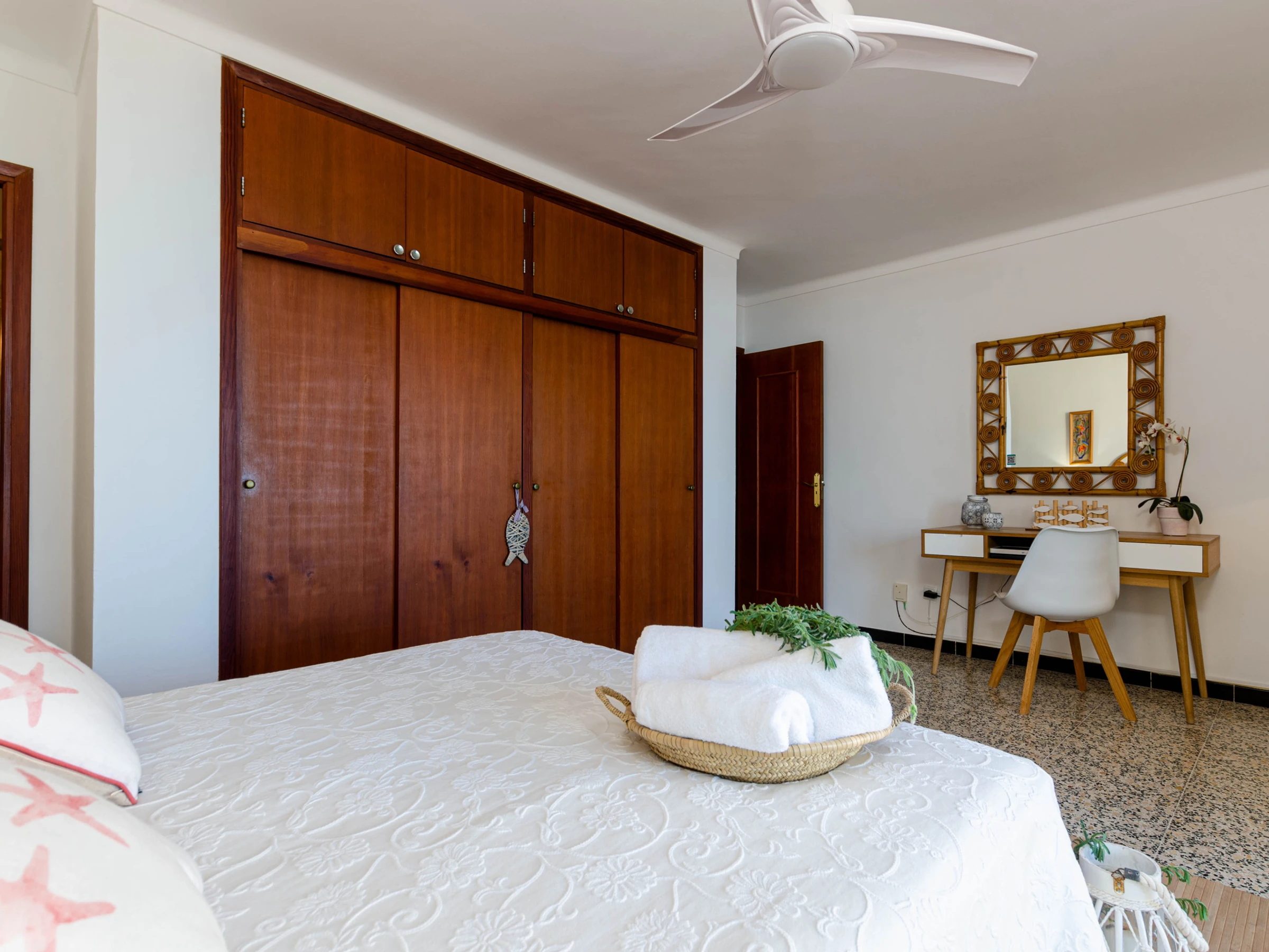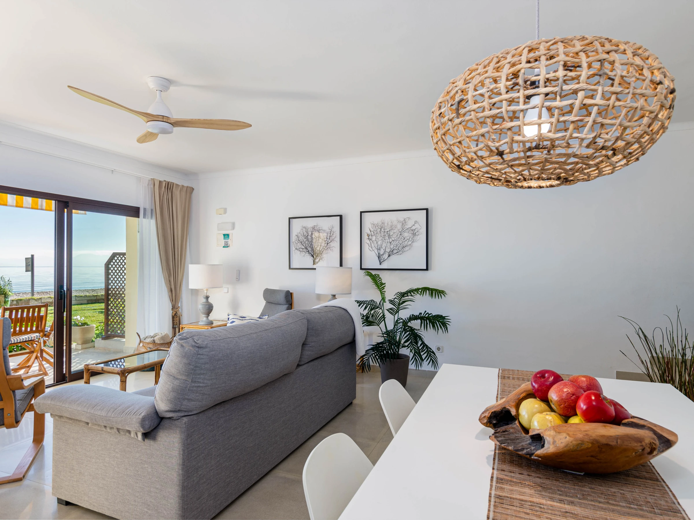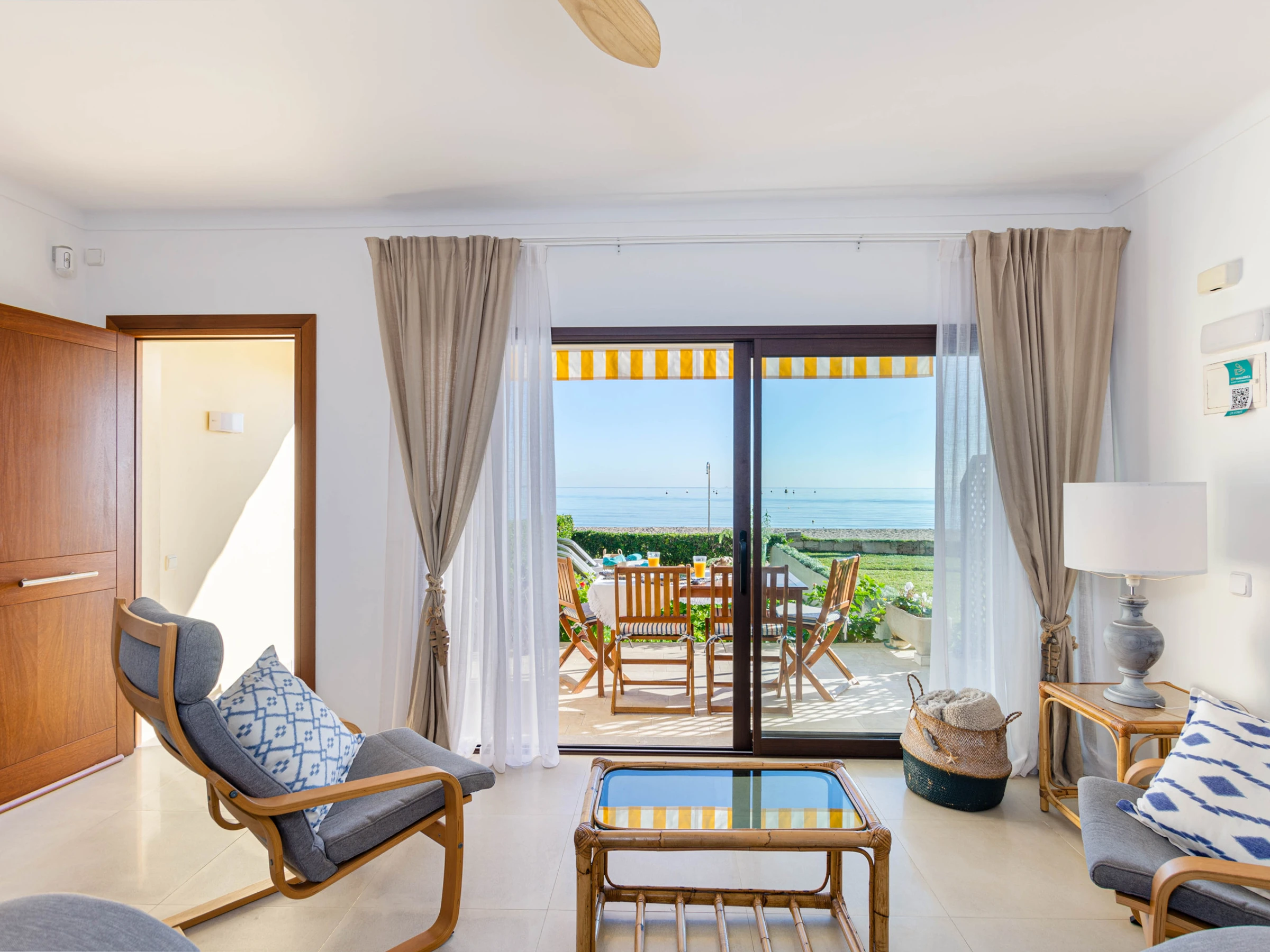 The terrace with sea views is a nice place for a large breakfast. The garden with 4 loungers is perfect for a little siesta. The terrace gives access to the living-dining area with satellite-TV. The independent kitchen with gas cooker and dishwasher is well-equipped. The apartment has 3 bedrooms, two with 2 single beds each and the master bedroom, equipped with a double bed and en-suite shower bath with hair dryer. Two of the bedrooms have air conditioning while the third room has a fan. There’s another bath with shower, a baby bed, a washing machine and fast Wifi.