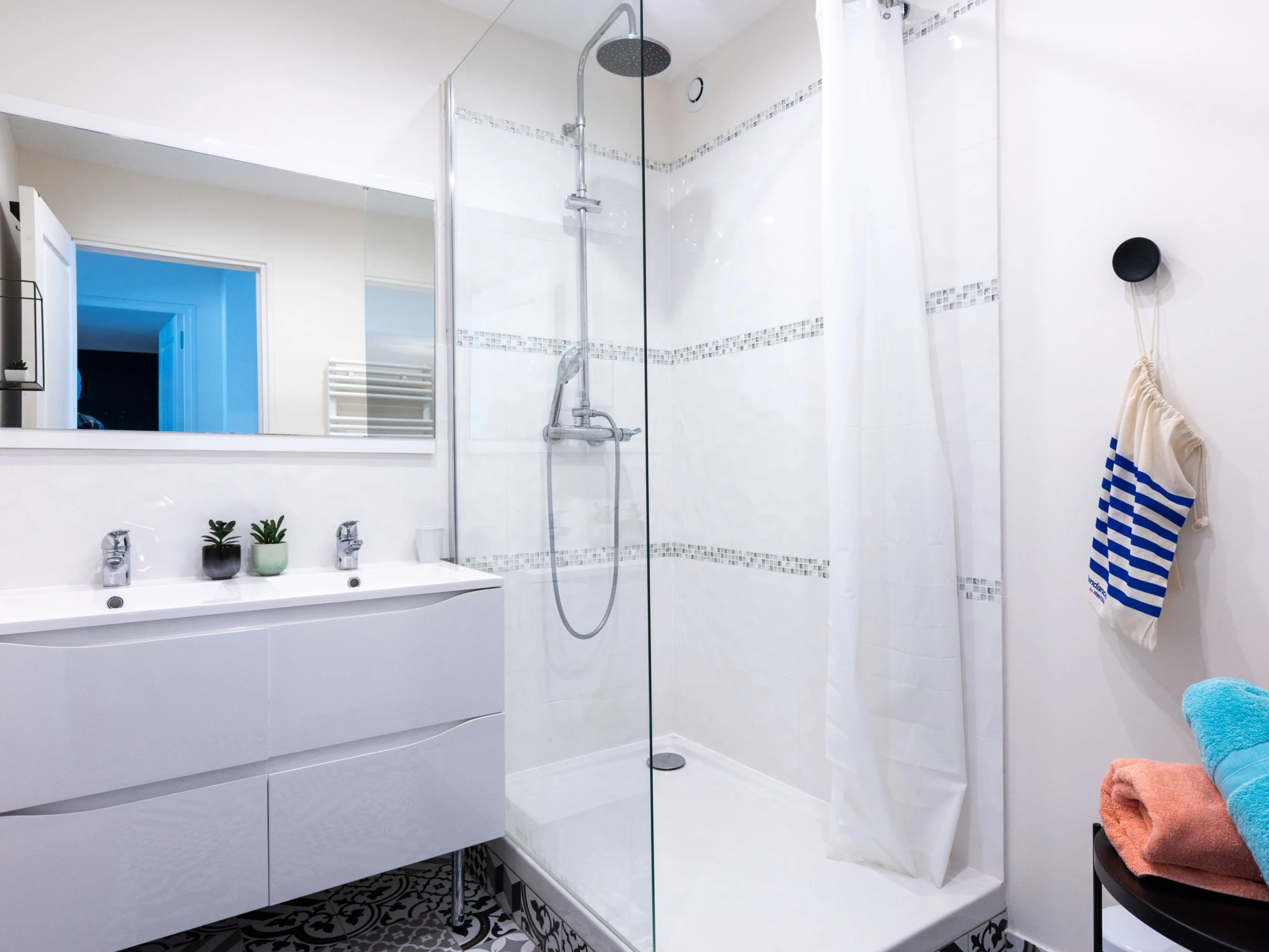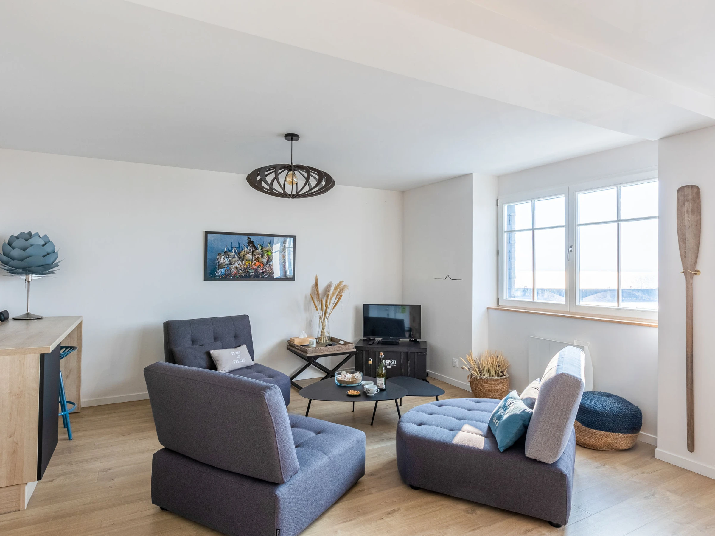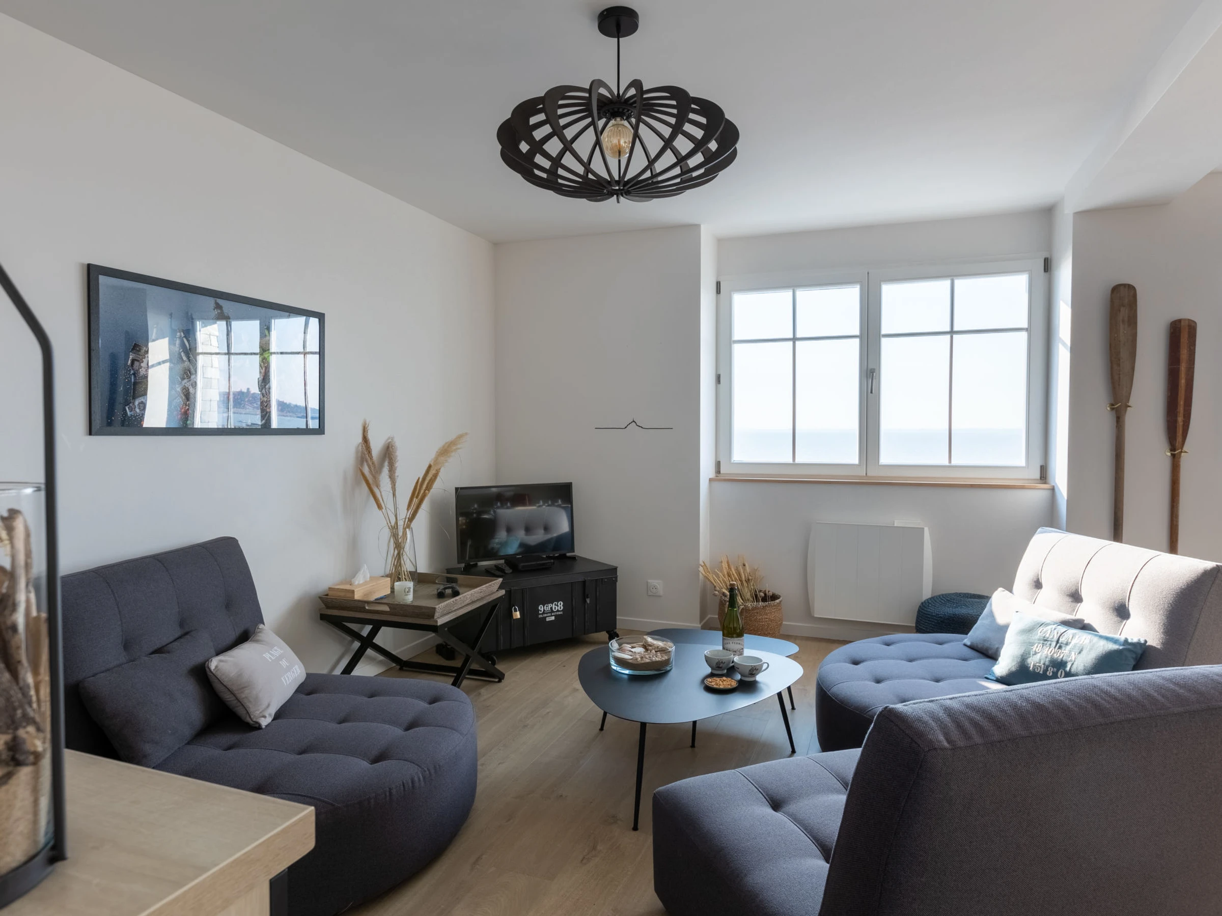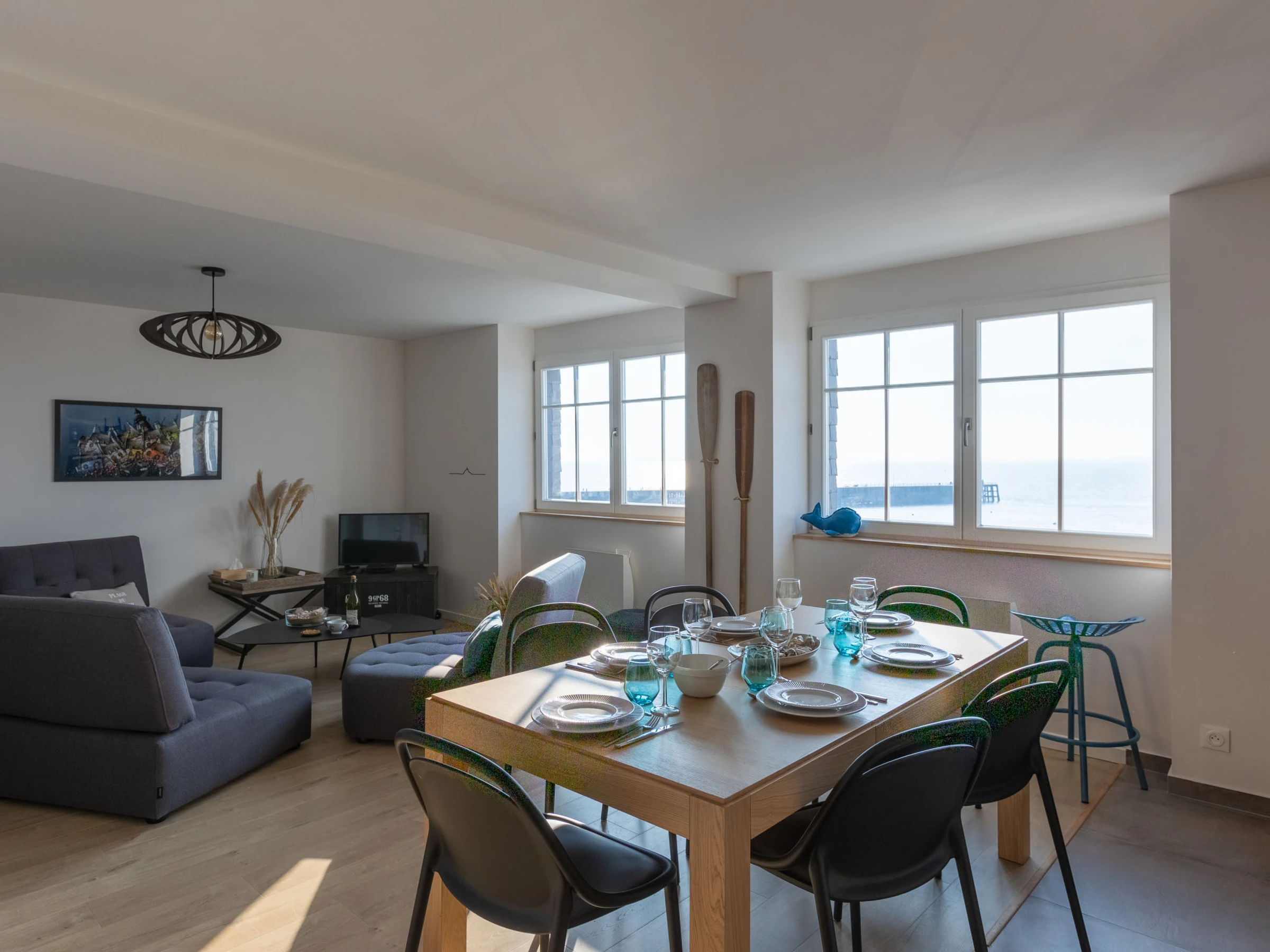 "Vue Eméraude", 4-room maisonette 90 m2 on 3rd floor. Bright, fully renovated in 2022, very comfortable and modern furnishings: large living/dining room with TV (flat screen). 1 room with 1 french bed (160 cm, length 200 cm). Exit to the terrace. 1 room with 2 beds (90 cm, length 190 cm). Exit to the terrace. Open kitchen (oven, dishwasher, 3 ceramic glass hob hotplates, toaster, kettle, microwave, electric coffee machine). Shower, sep. WC, double hand-basin. Electric heating. Upper floor: 1 large room with 1 french bed (180 cm, length 200 cm), bathroom. Small balcony 3 m2. Balcony furniture. Marvellous view of the sea. Facilities: washing machine, iron, hair dryer. Internet (WiFi, free). Please note: non-smokers only. Smoke alarm. Offer by a private individual according to Art. 155, IV of CGI.