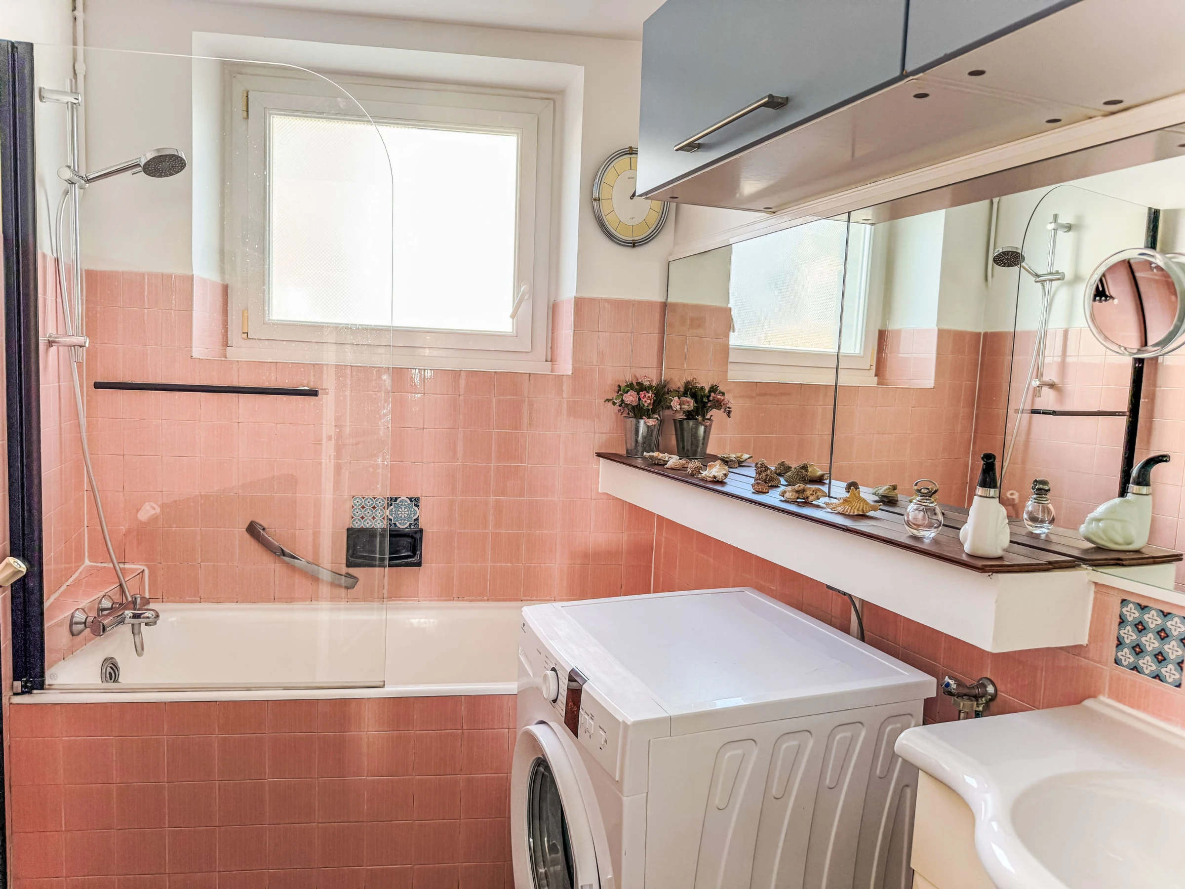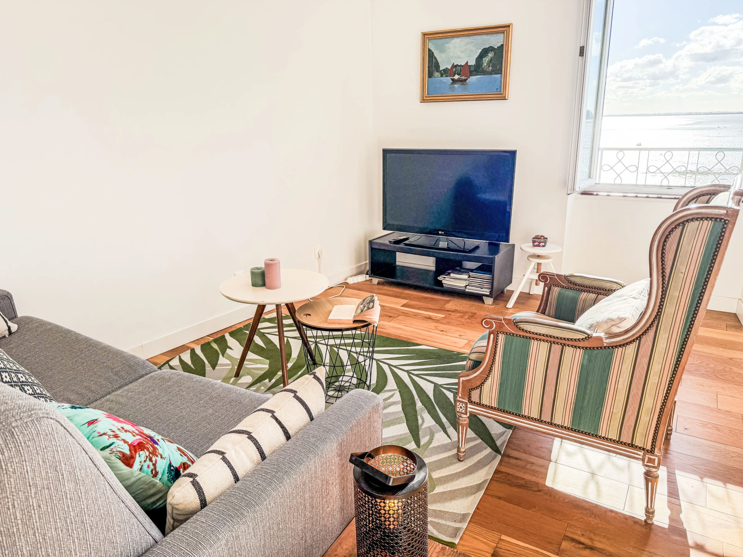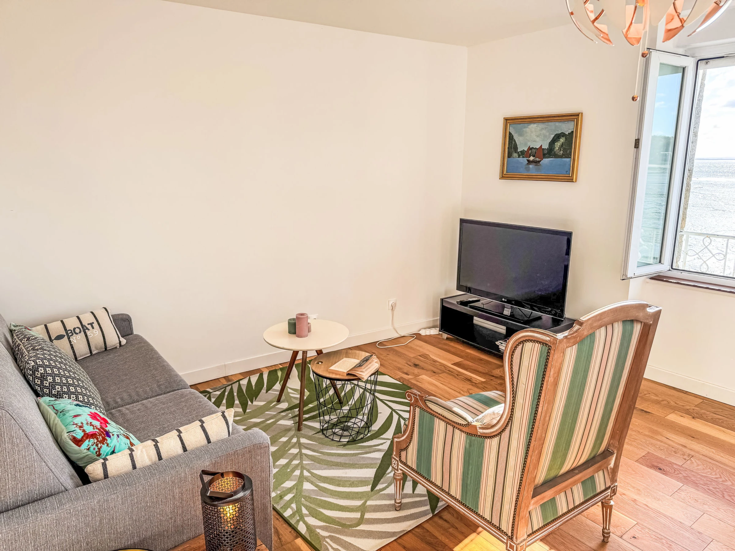 "L'Emeraude", 2-room apartment 55 m2 on 1st floor. Beautiful and modern furnishings: large living/dining room 30 m2 with 1 sofabed (140 cm, length 190 cm). 1 room with 1 french bed (1 x 140 cm, length 190 cm). Open kitchen (oven, dishwasher, 4 induction hot plates, toaster, kettle, microwave, electric coffee machine). Bathroom, sep. WC. Gas heating. Parquet floors. Terrace 12 m2. Terrace furniture. Very beautiful view of the sea and the port. Facilities: washing machine. Internet (WiFi, extra). Garage (1 car). Please note: non-smokers only. Smoke alarm. Offer by a private individual according to Art. 155, IV of CGI.