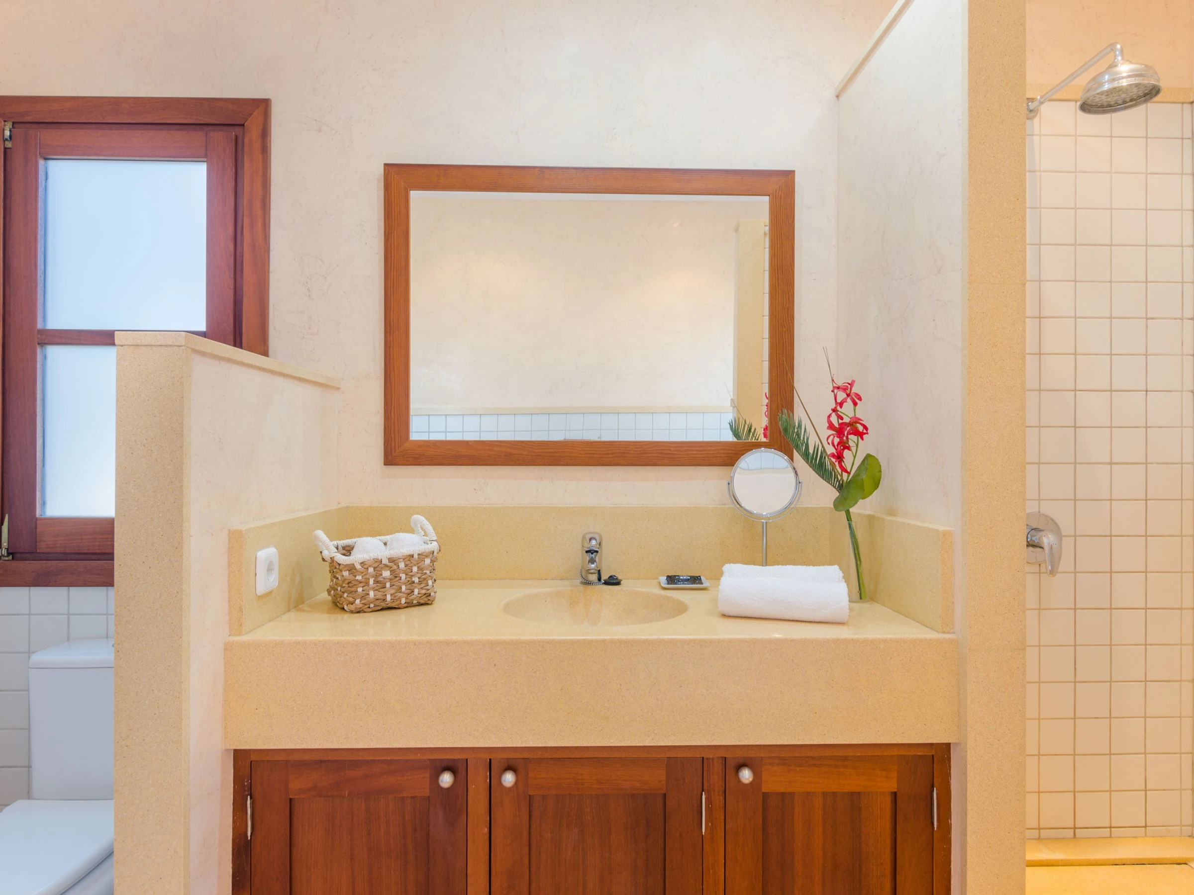 This floor also has two bathrooms—one with a shower and the other with both a separate shower and tub. The house features three bedrooms, each furnished with two twin beds. Two of the bedrooms are on the ground floor and include closets, while the third bedroom upstairs boasts a walk-in closet and an en-suite bathroom with a separate shower and tub. All rooms offer beautiful views of the fields and the pool.