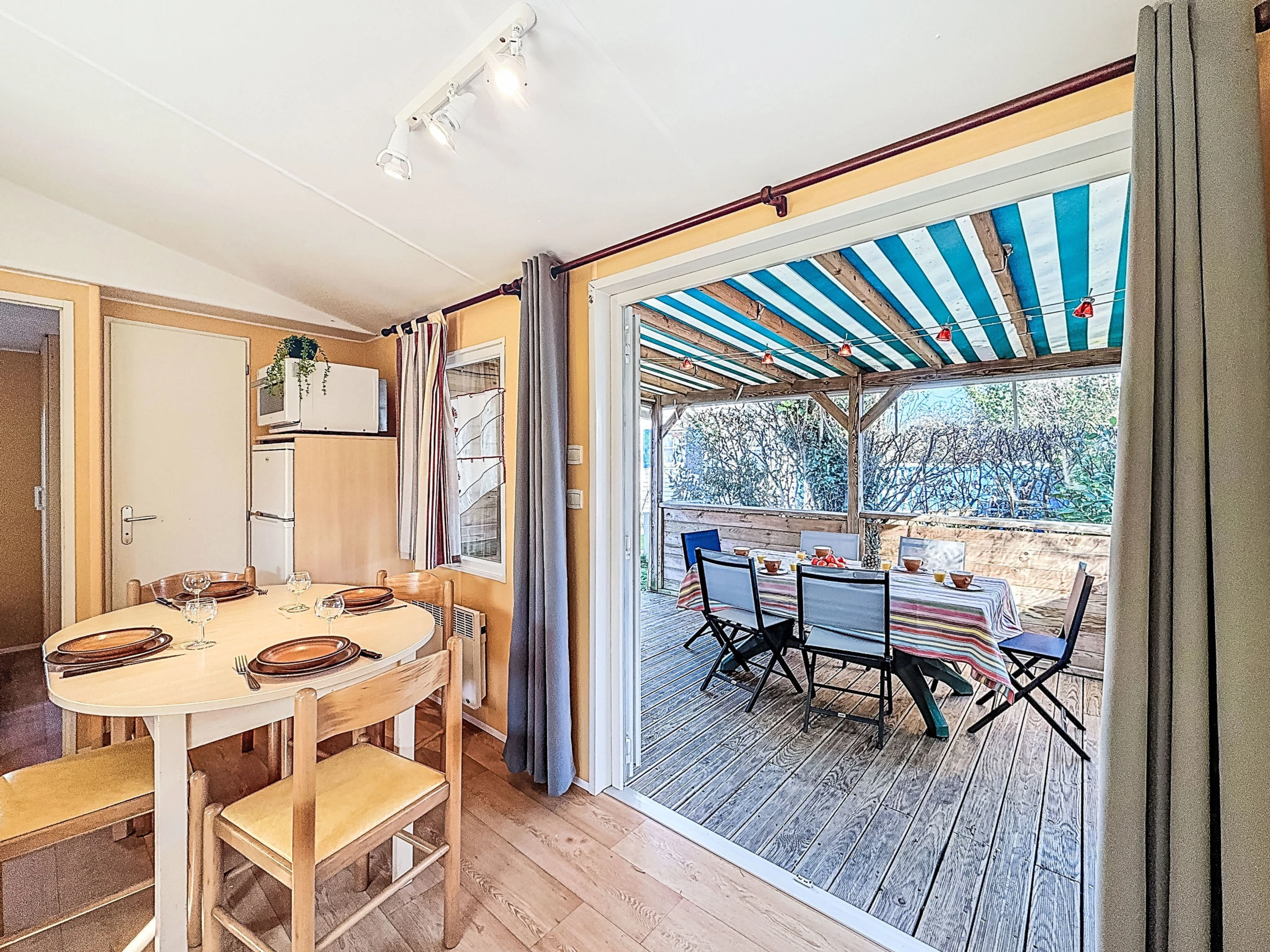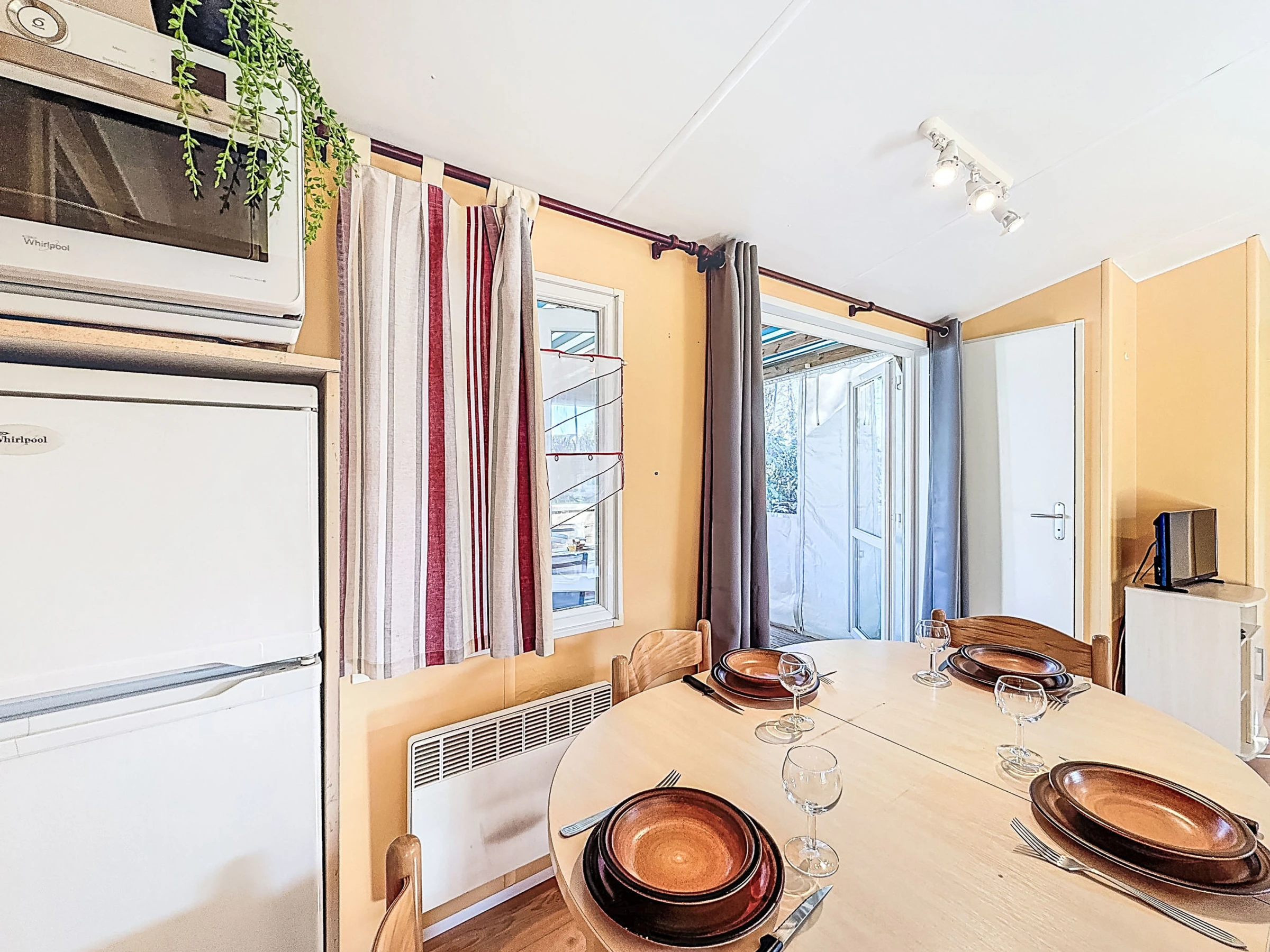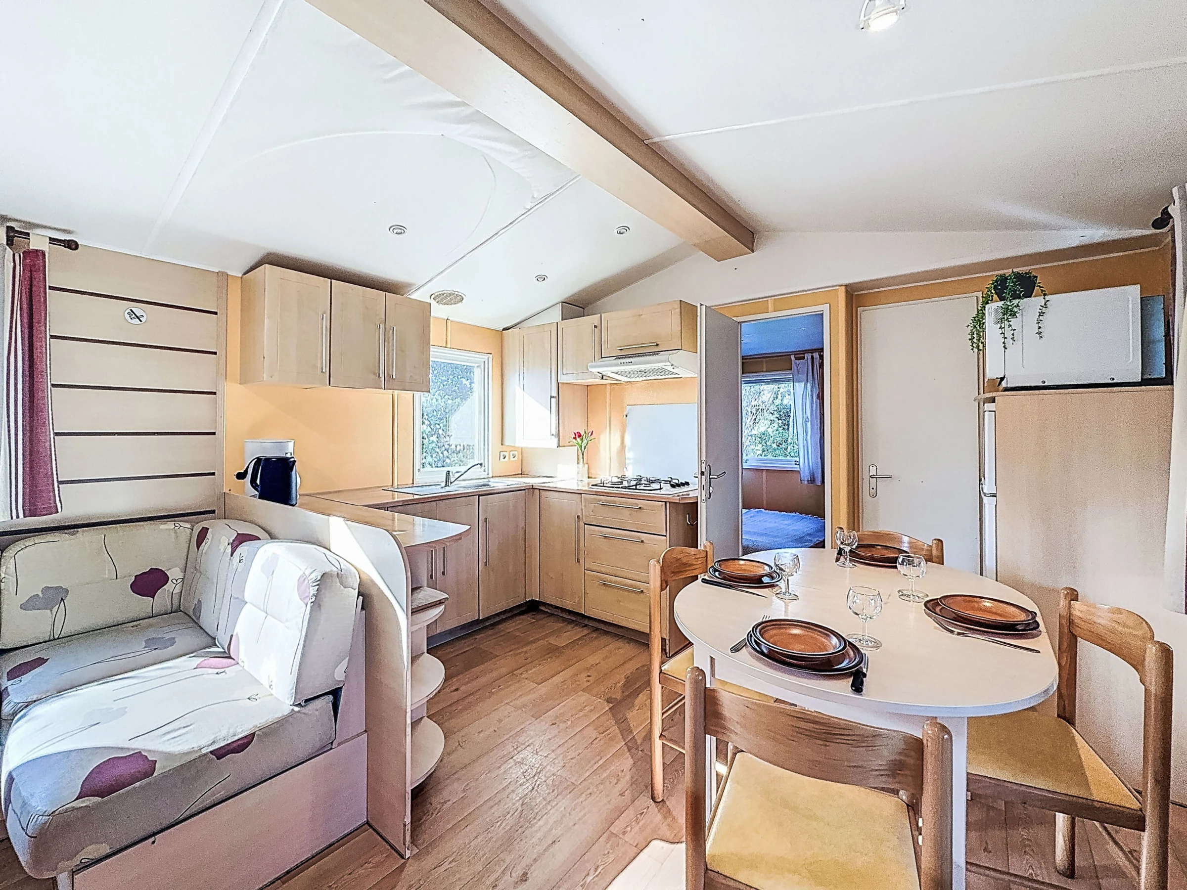 "L'échasse", 4-room mobile home 40 m2. Comfortable furnishings: living/dining room with TV (flat screen). Exit to the terrace. 1 room with 1 french bed (1 x 160 cm, length 190 cm). 1 room with 1 french bed (1 x 140 cm, length 190 cm). 1 room with 2 beds (80 cm, length 190 cm). Open kitchen (4 gas rings, toaster, kettle, microwave, electric coffee machine). Shower, sep. WC. Terrace 10 m2. Terrace furniture. Facilities: hair dryer. Internet (WiFi, free). Parking at the house. Please note: 1 pet/ dog allowed. Smoke alarm. Offer by a commercial proprietor according to Art. 155, IV, CGI