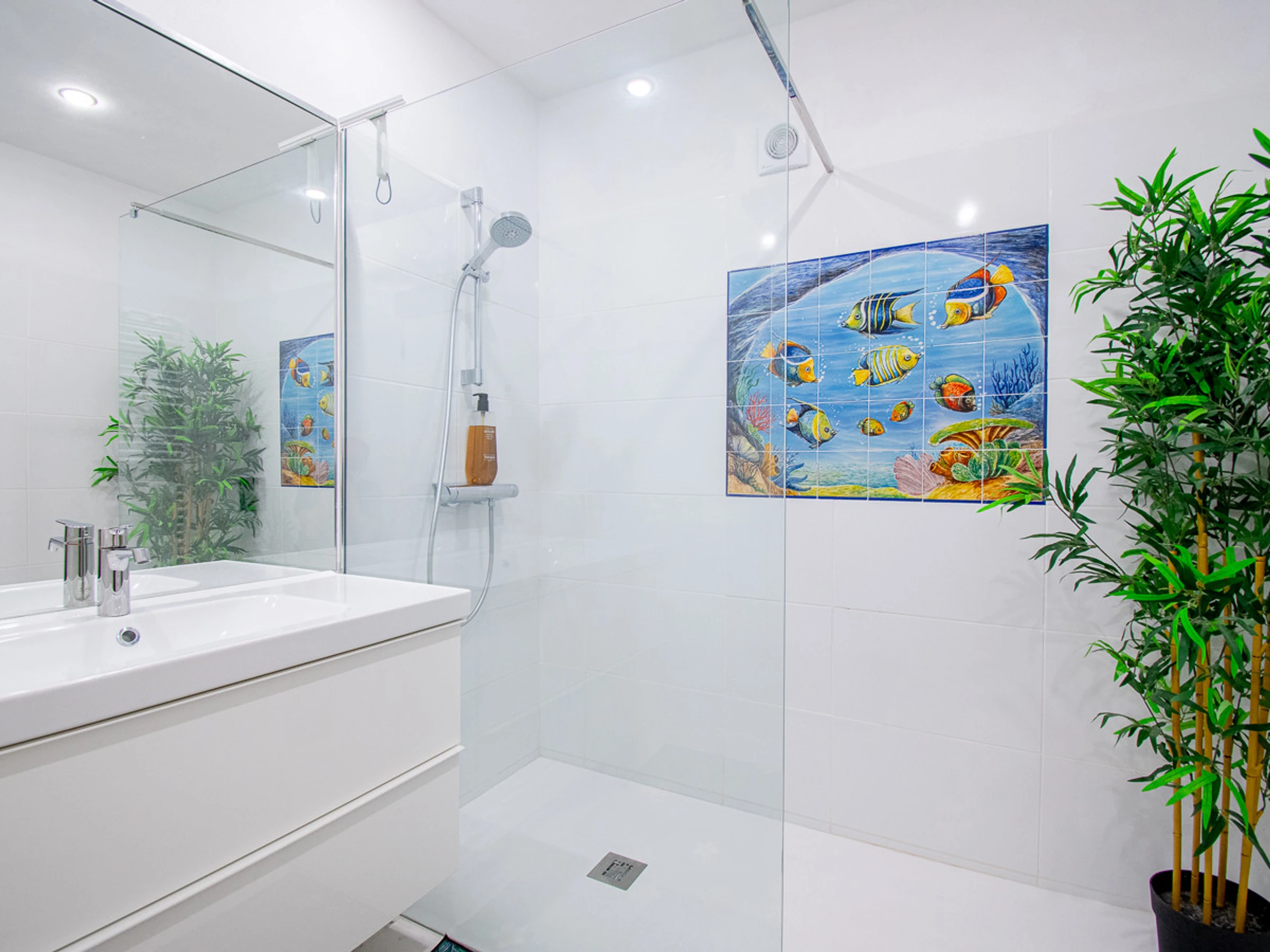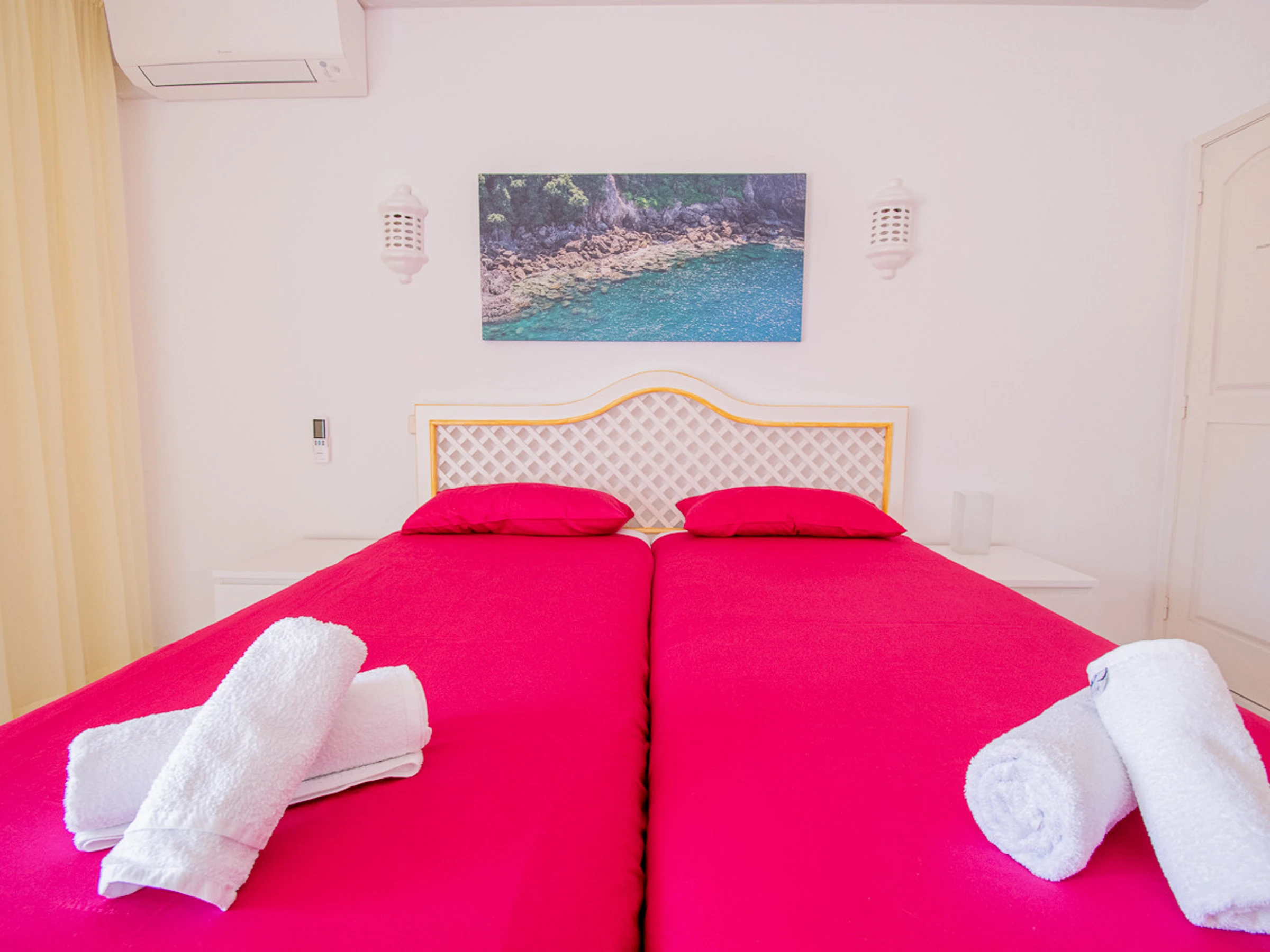This 3-room terraced house 125 m2 on 2 levels. Bright, renovated in 2019, tasteful furnishings: living/dining room with open-hearth fireplace, dining table, satellite TV, hi-fi system and DVD. Exit to the balcony. Kitchen (oven, dishwasher, 4 ceramic glass hob hotplates, toaster, kettle, microwave, freezer, electric coffee machine) with hatch. Shower/WC. On the lower ground floor: (spiral staircase), 2 rooms, each room with 1 double bed. Exit to the balcony. Bath/WC, double hand-basin. Electric heating, air-conditioning. 2 balconies. Balcony furniture, barbecue, deck chairs (2). Facilities: washing machine, iron. Internet (WiFi, free). Please note: non-smokers only. [hidden]