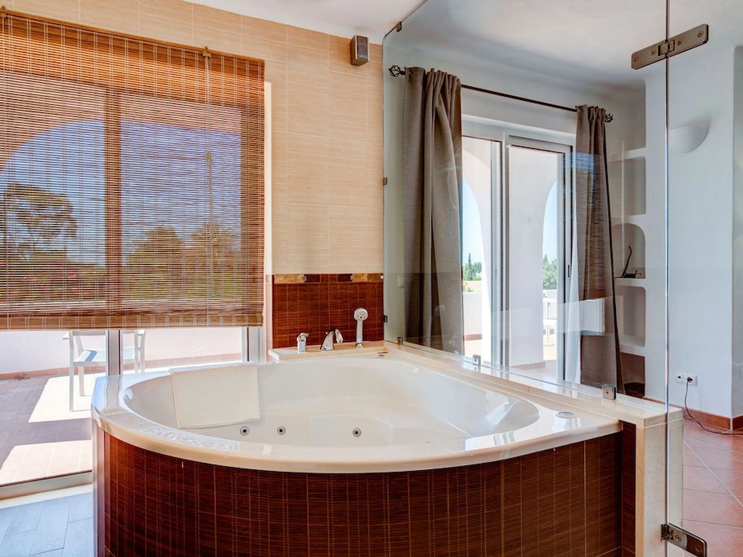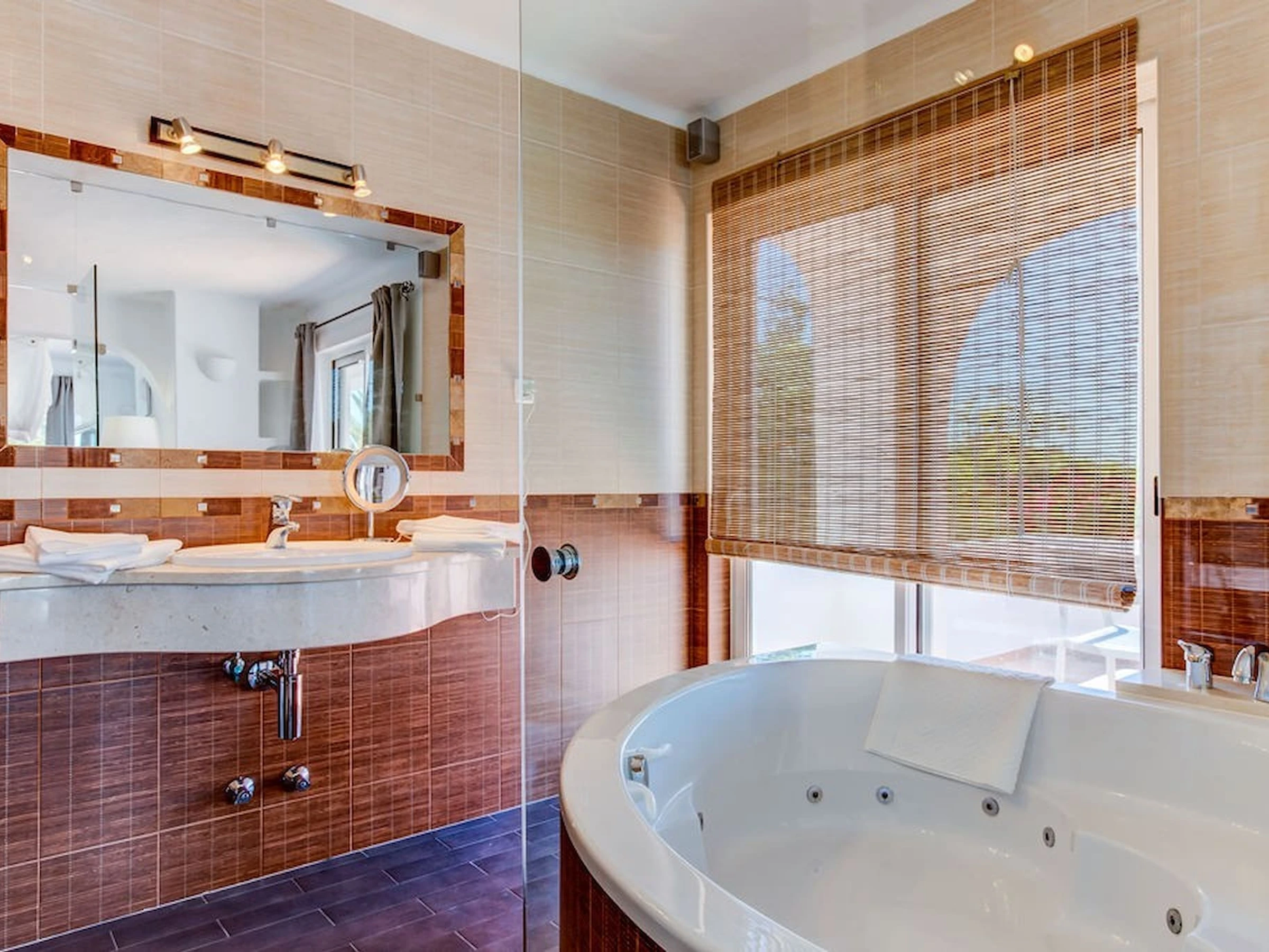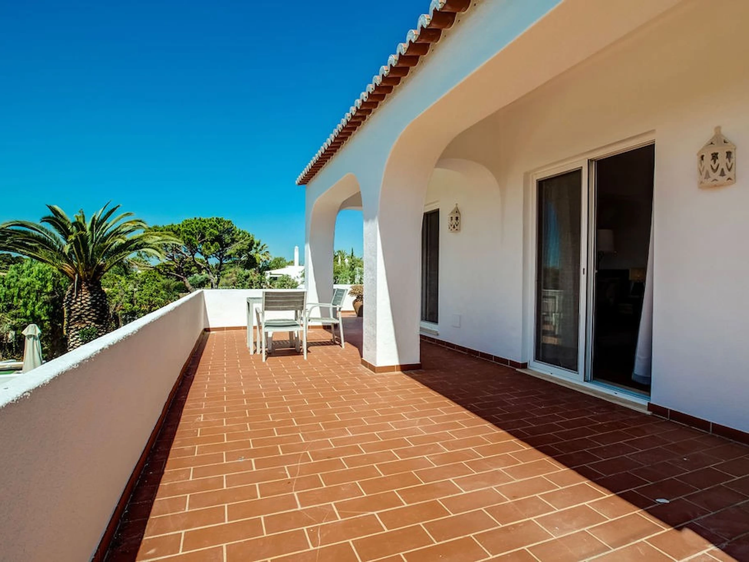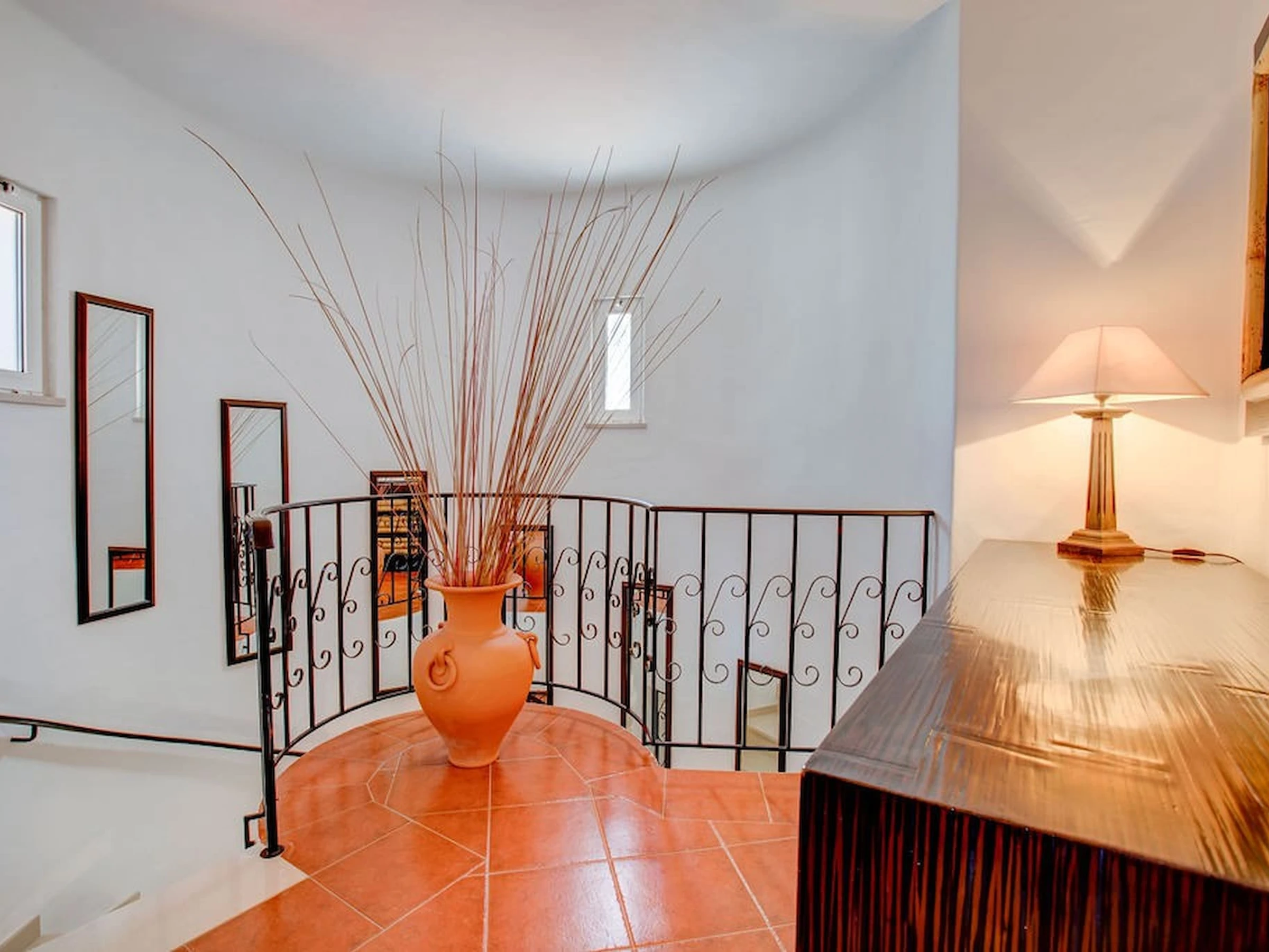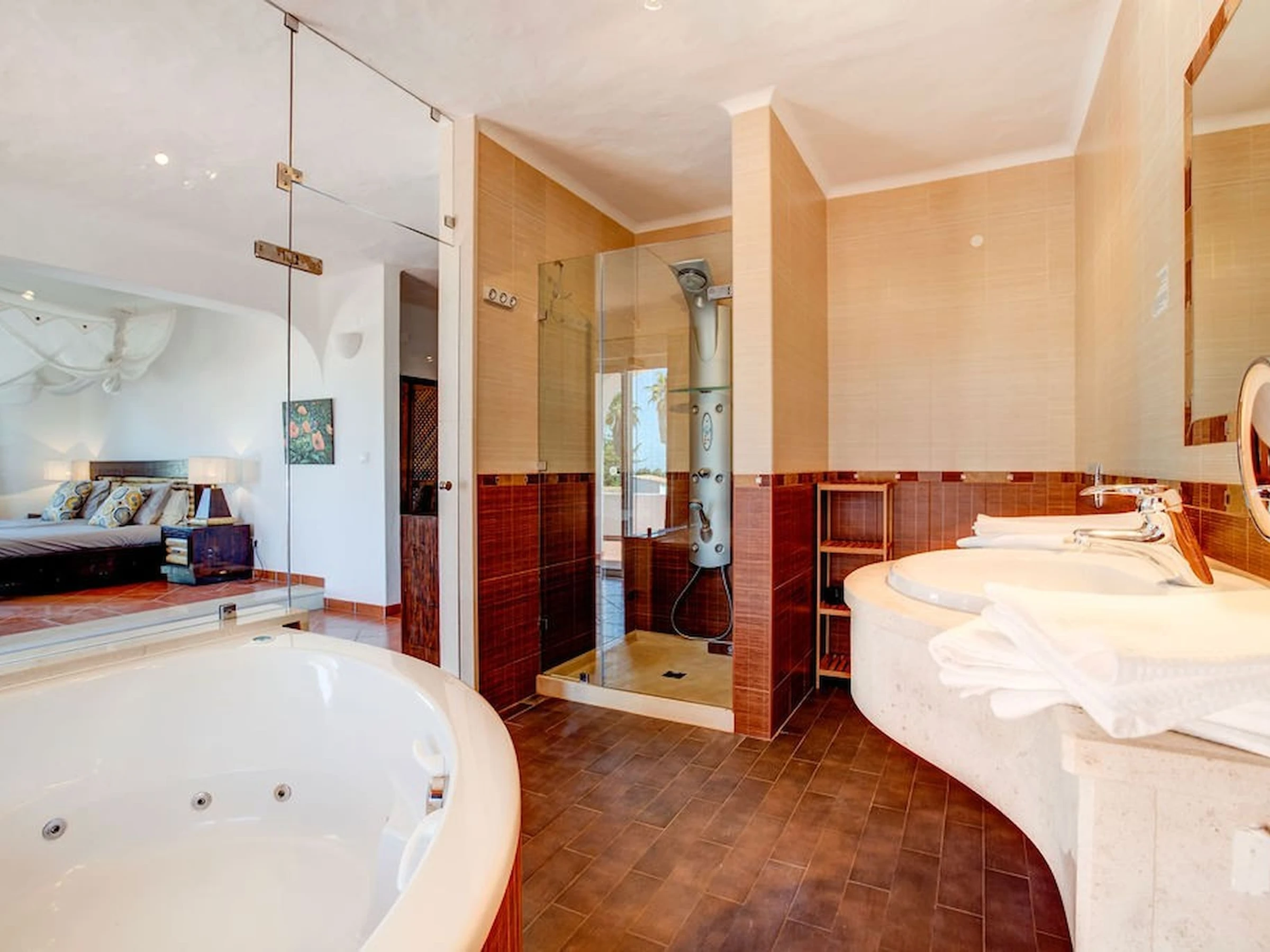 Located on a quiet cul-de-sac on Carvoeiro Clube, this five bedroom villa occupies a plot of over 3000 square meters of mature gardens. There is a gated driveway leading to the two storey villa. On entrance level there is a spacious hall way with attactive curved stair case leading to the master bedroom and en suite bathroom. There is a private terrace leading from the bedroom with fabulous views. The bathroom features a bath and walk in shower.