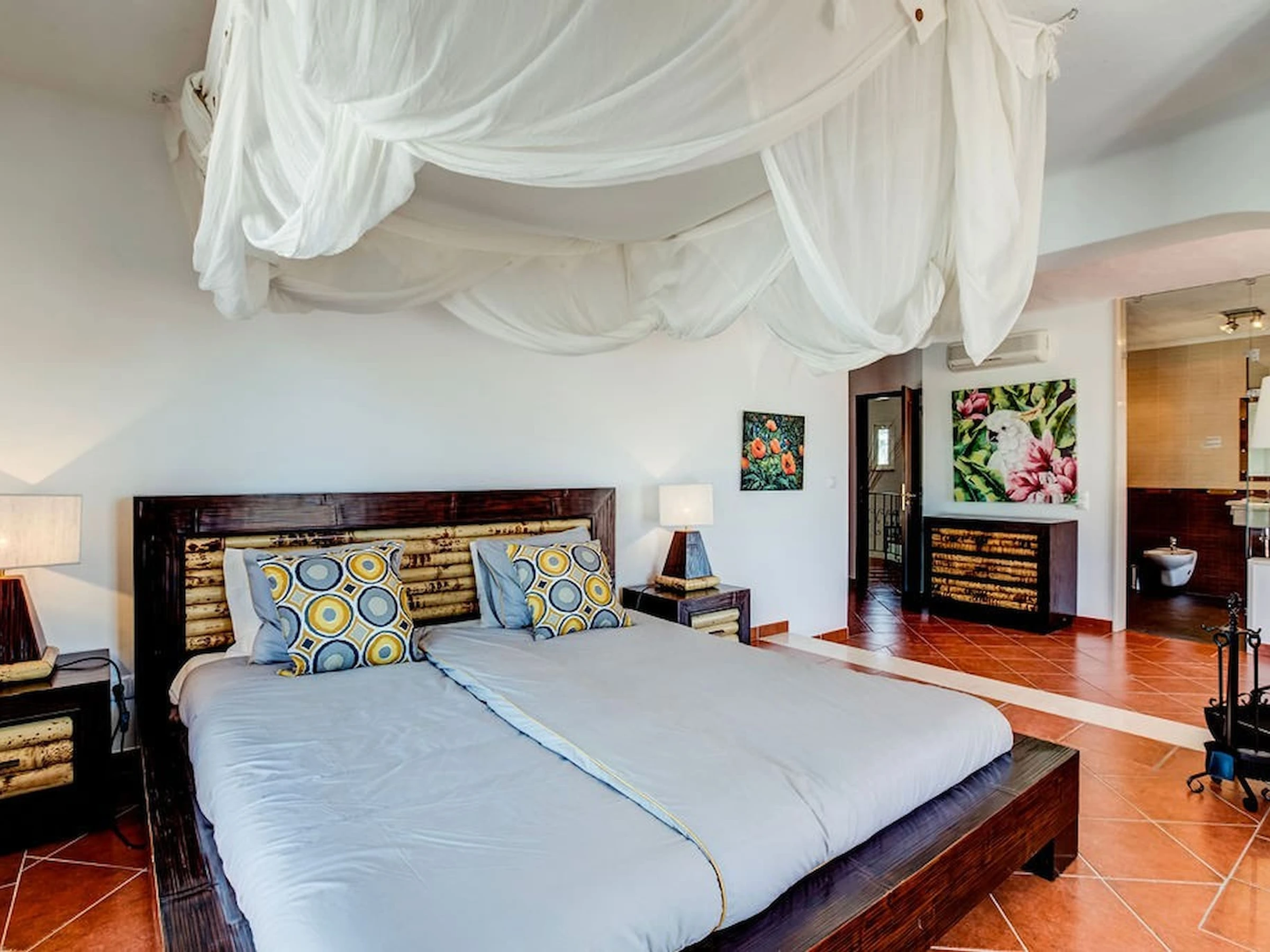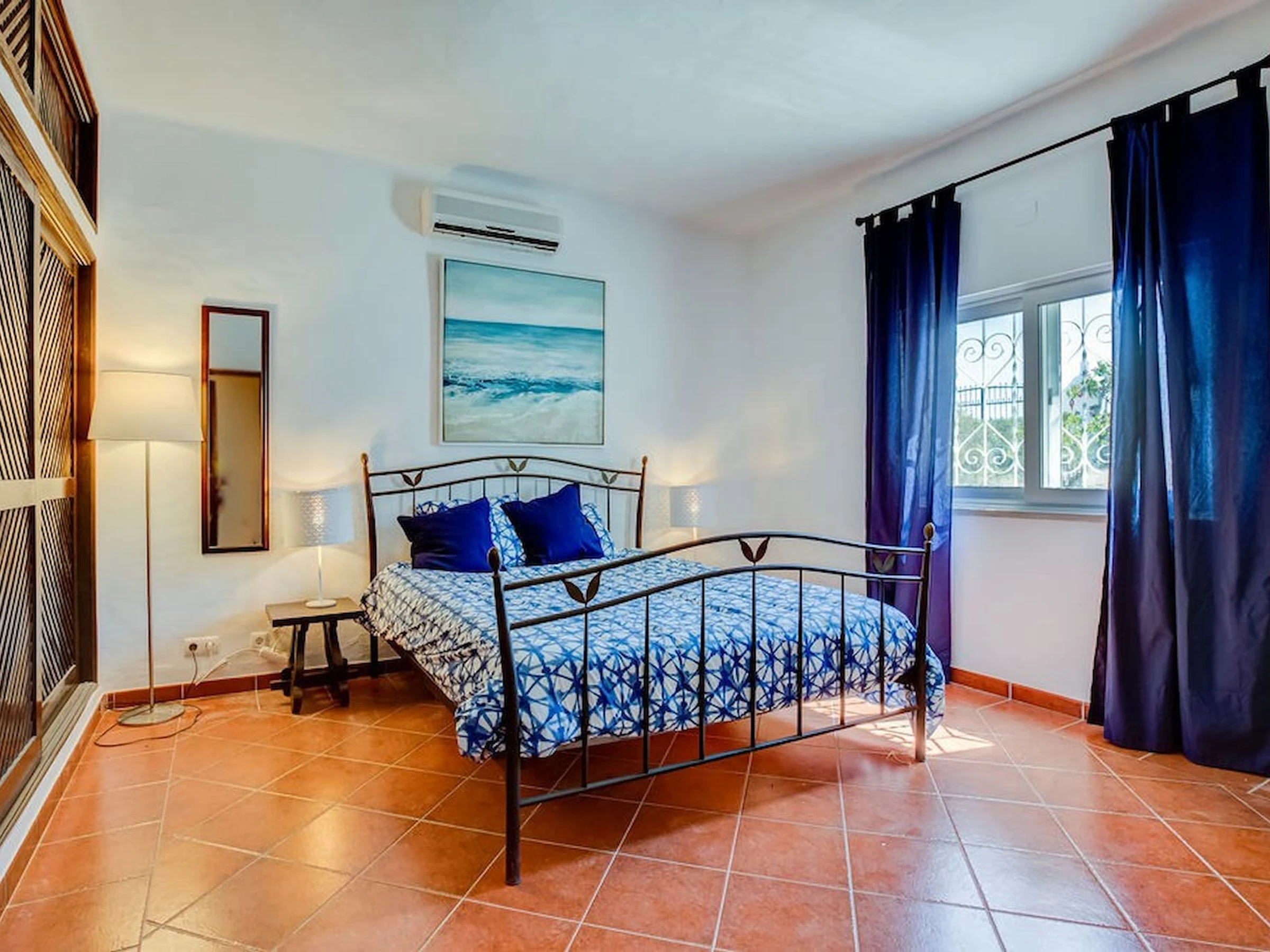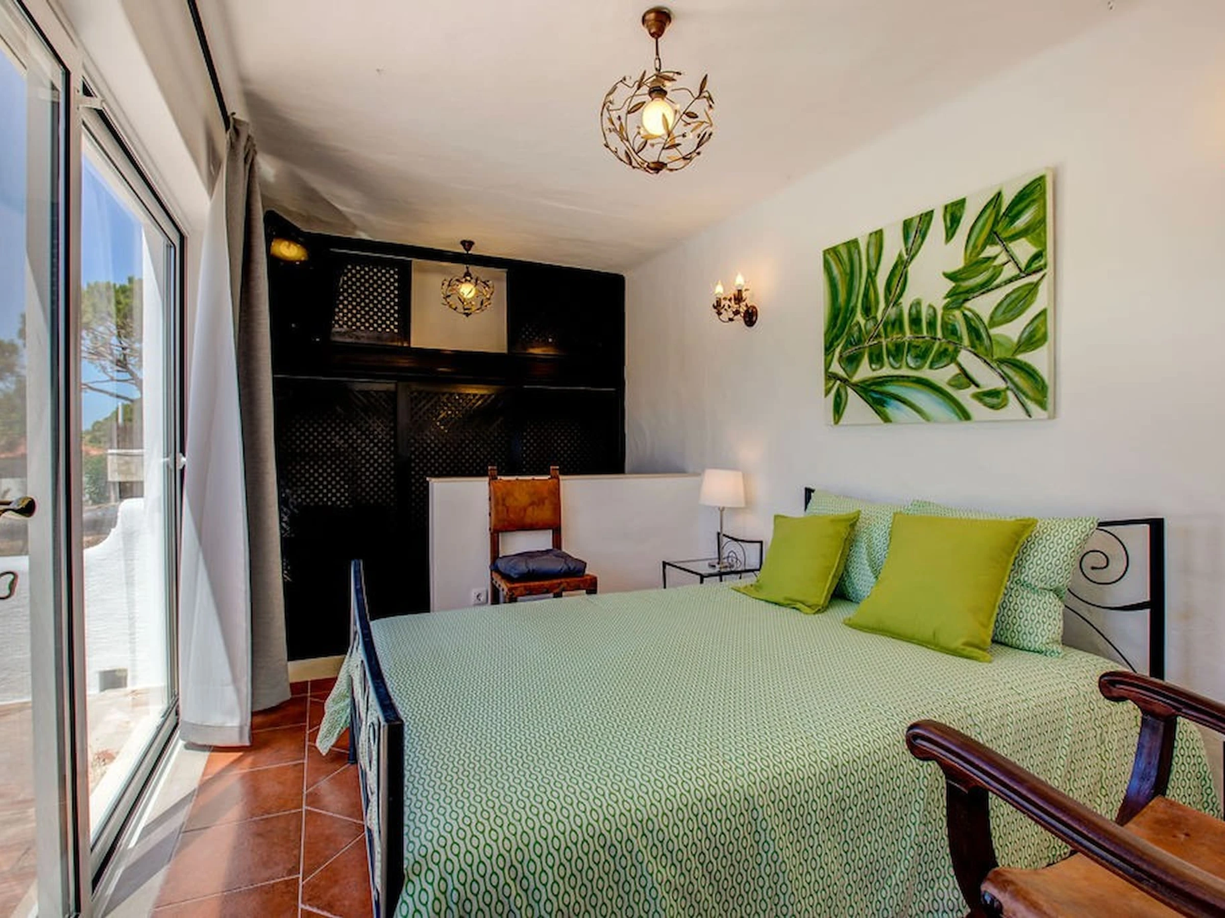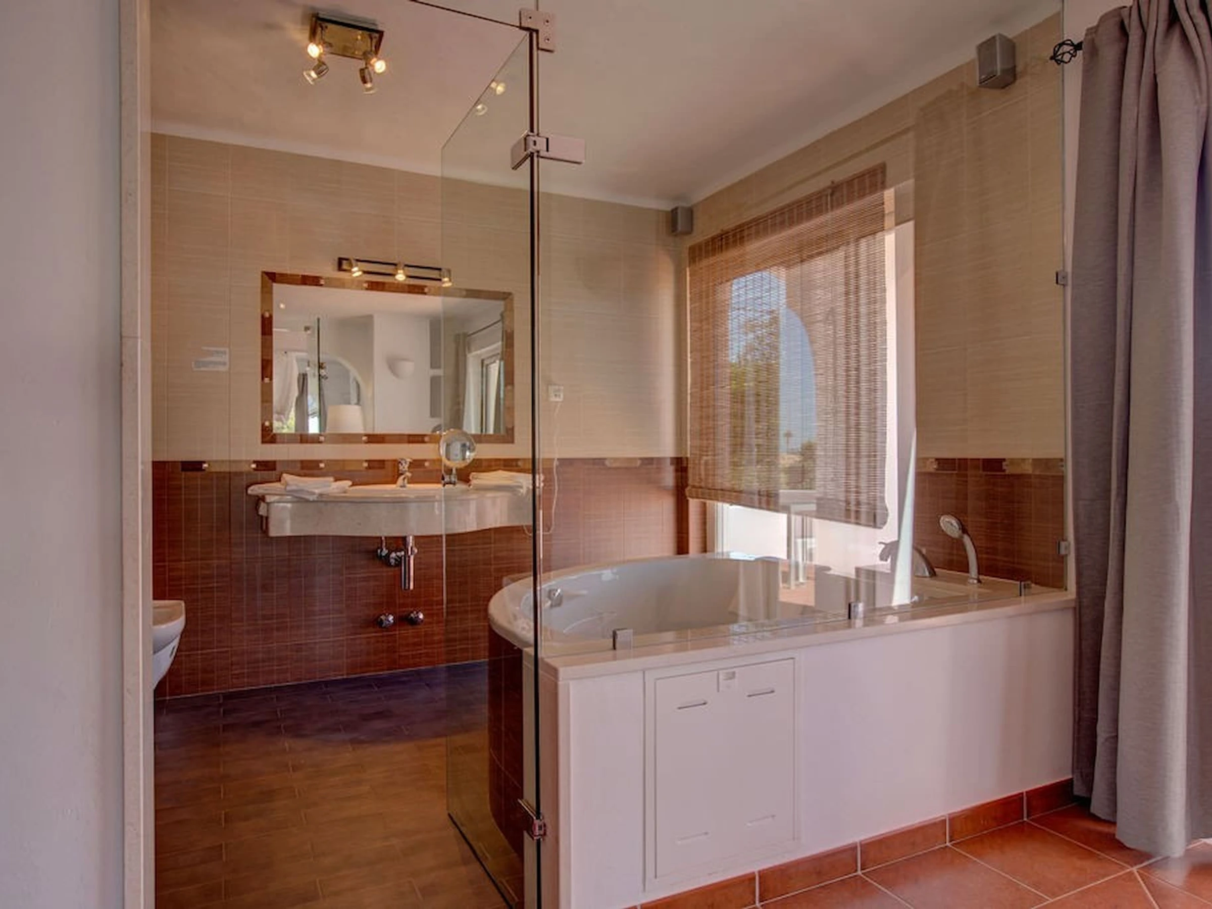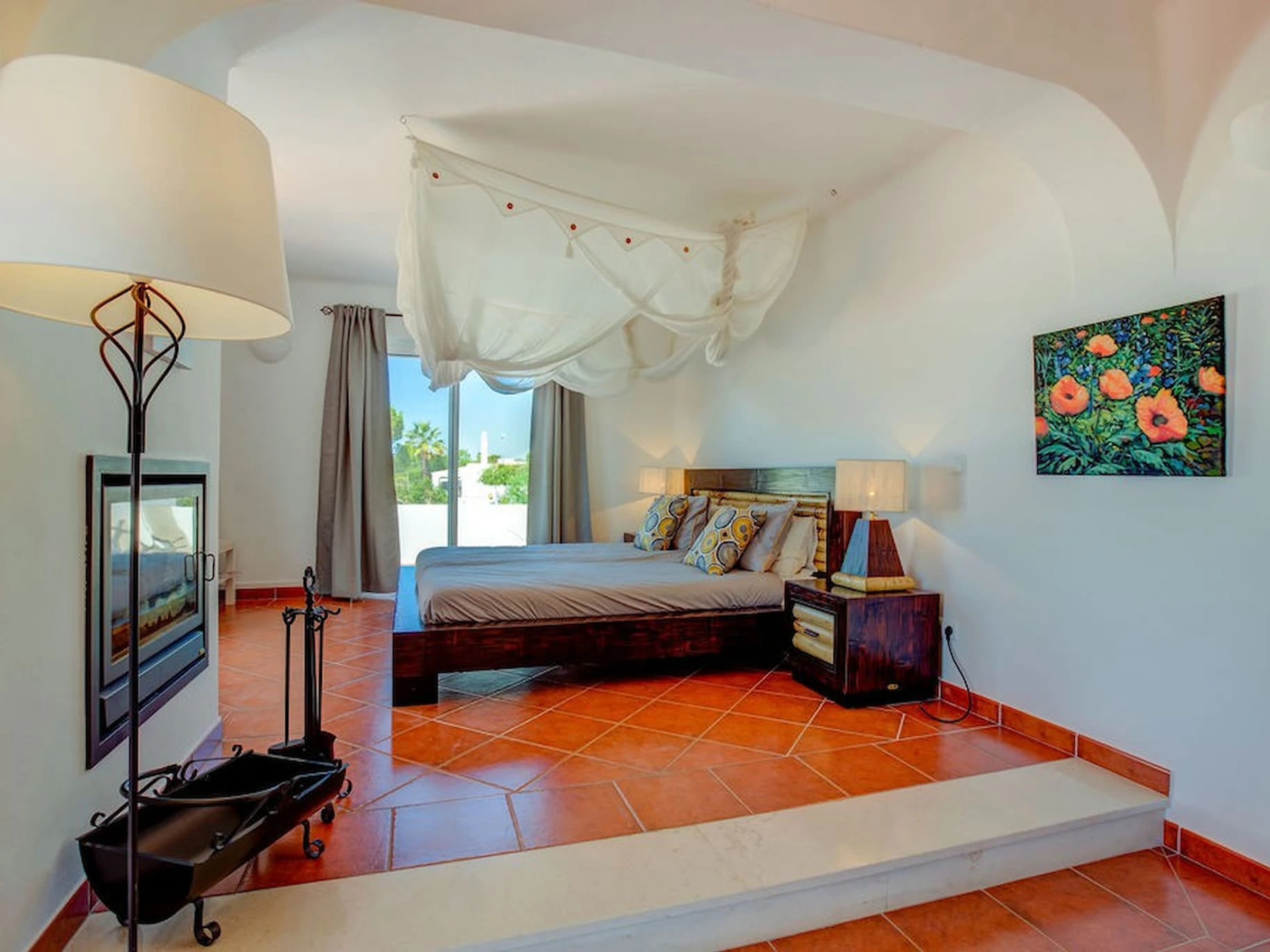 Located on a quiet cul-de-sac on Carvoeiro Clube, this five bedroom villa occupies a plot of over 3000 square meters of mature gardens. There is a gated driveway leading to the two storey villa. On entrance level there is a spacious hall way with attactive curved stair case leading to the master bedroom and en suite bathroom. There is a private terrace leading from the bedroom with fabulous views. The bathroom features a bath and walk in shower.