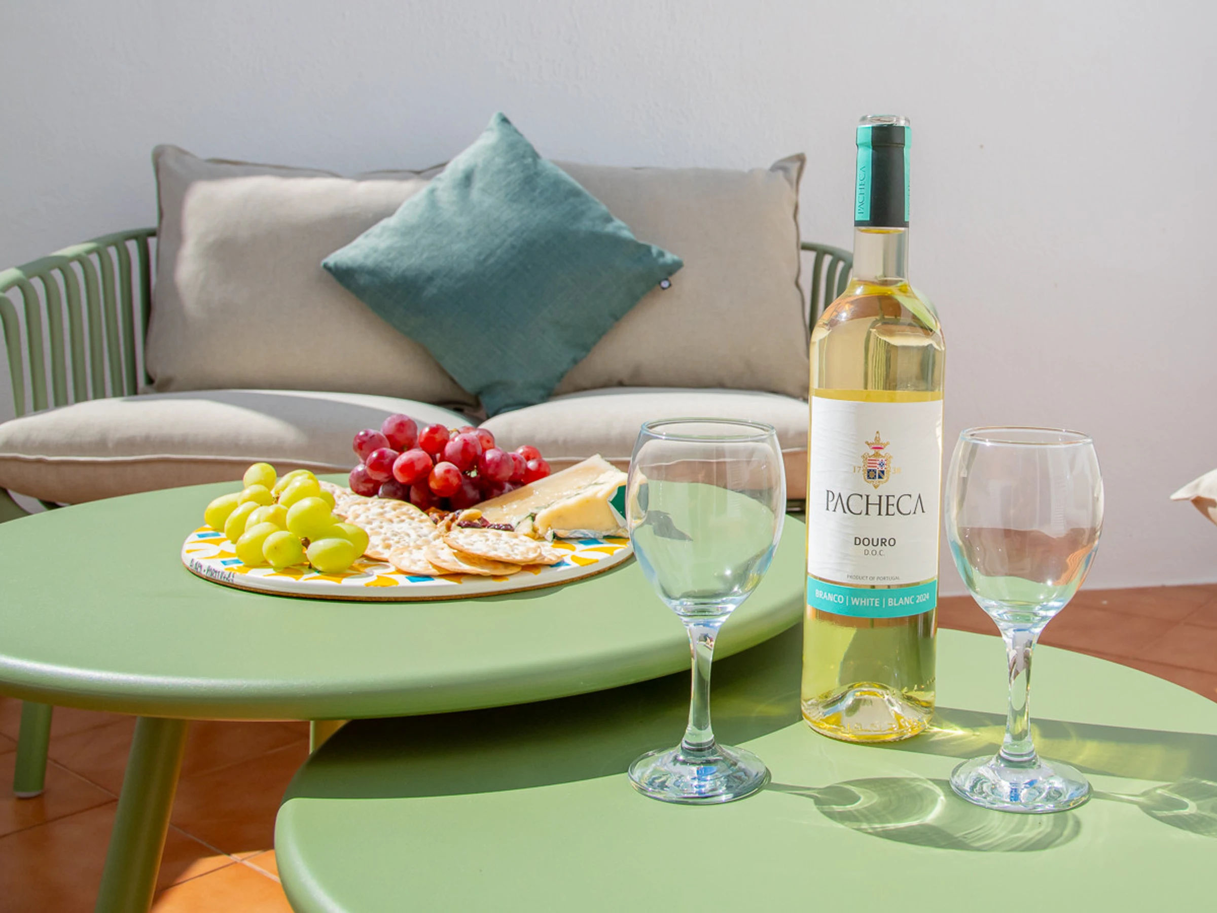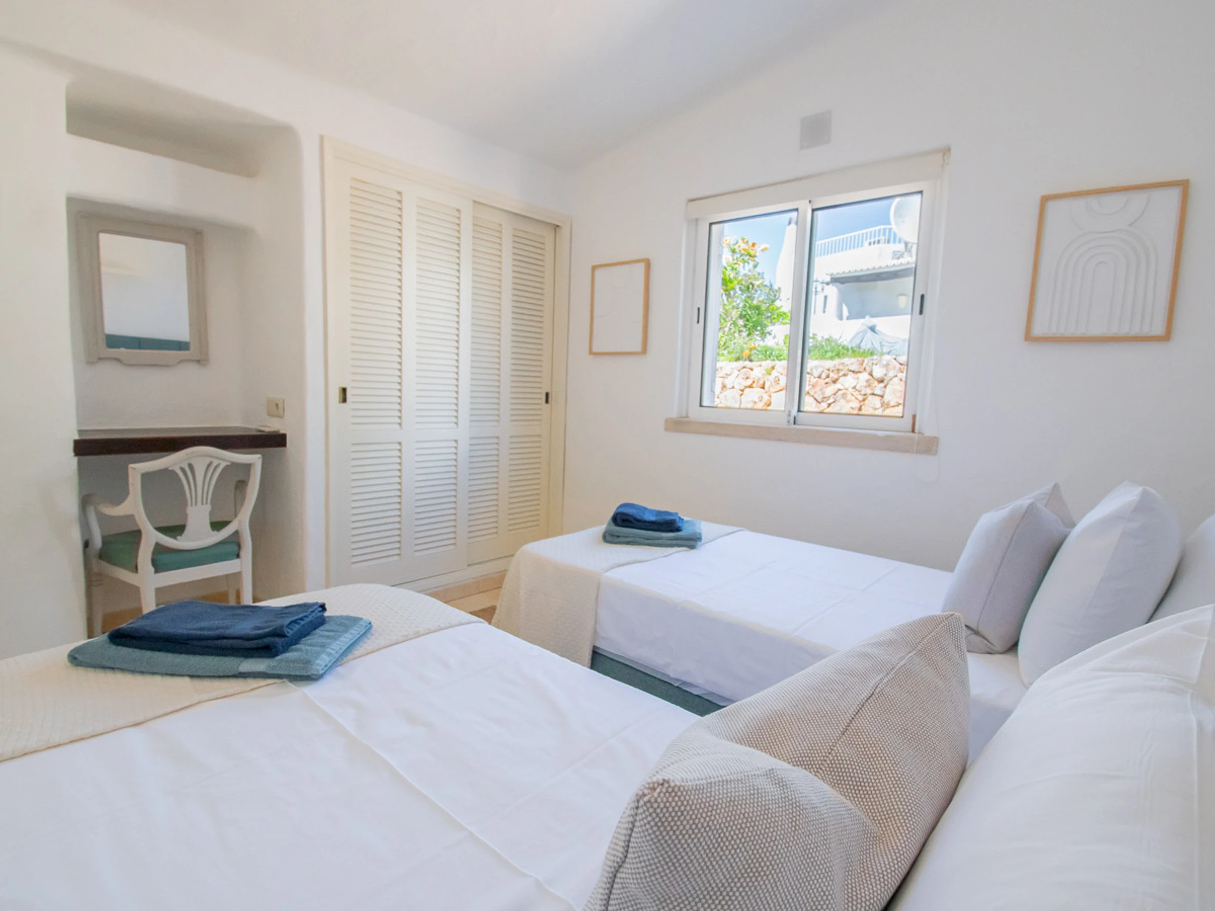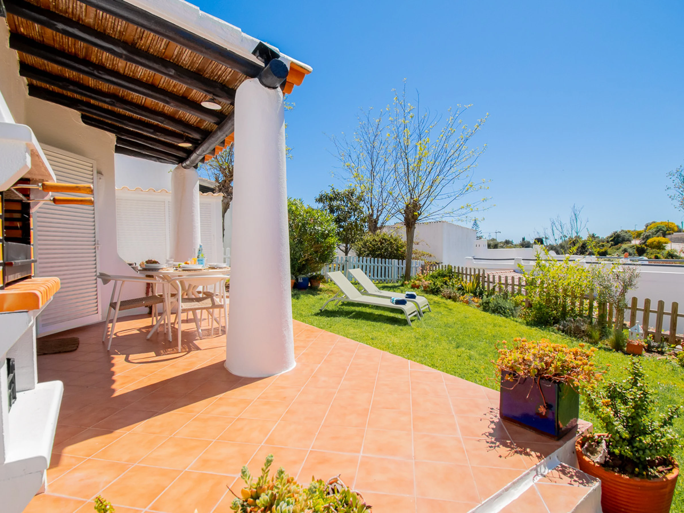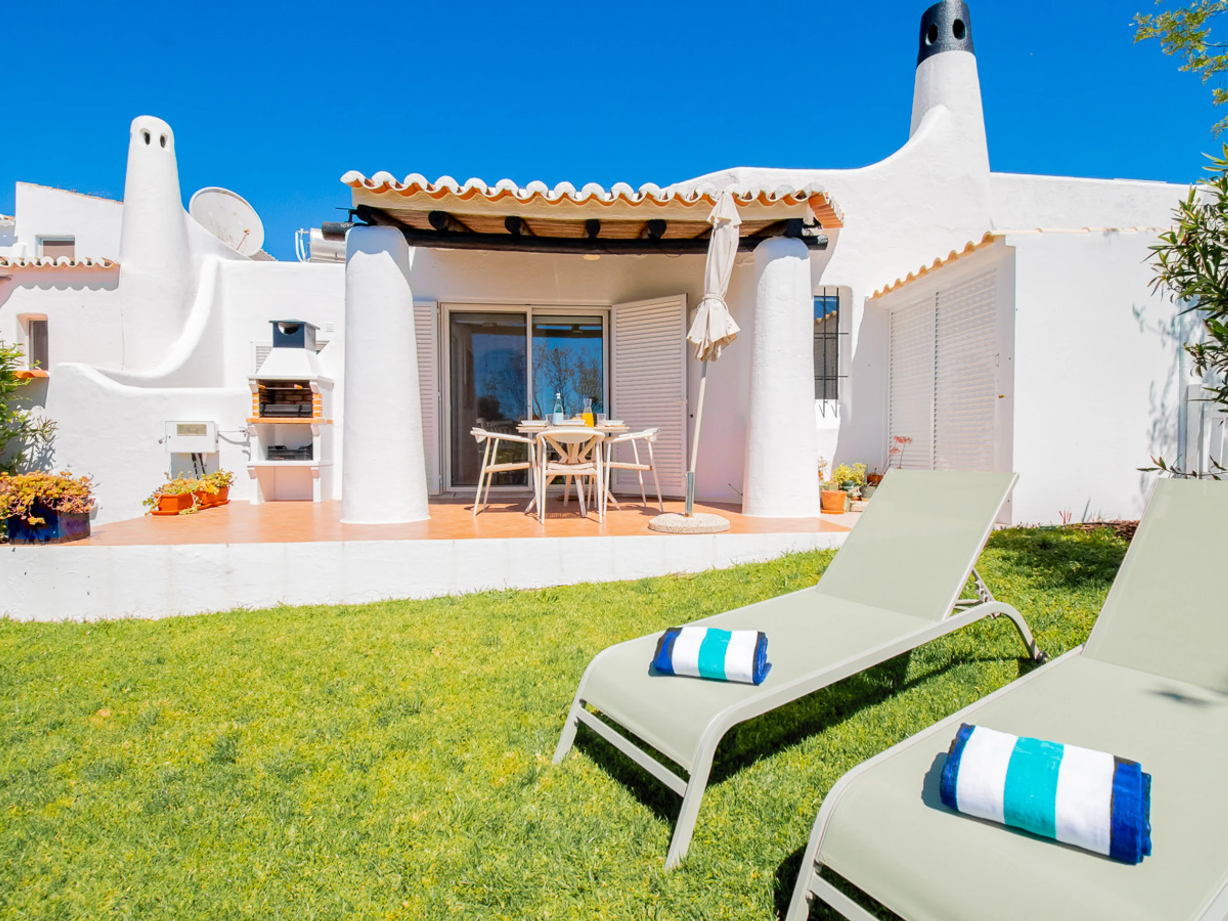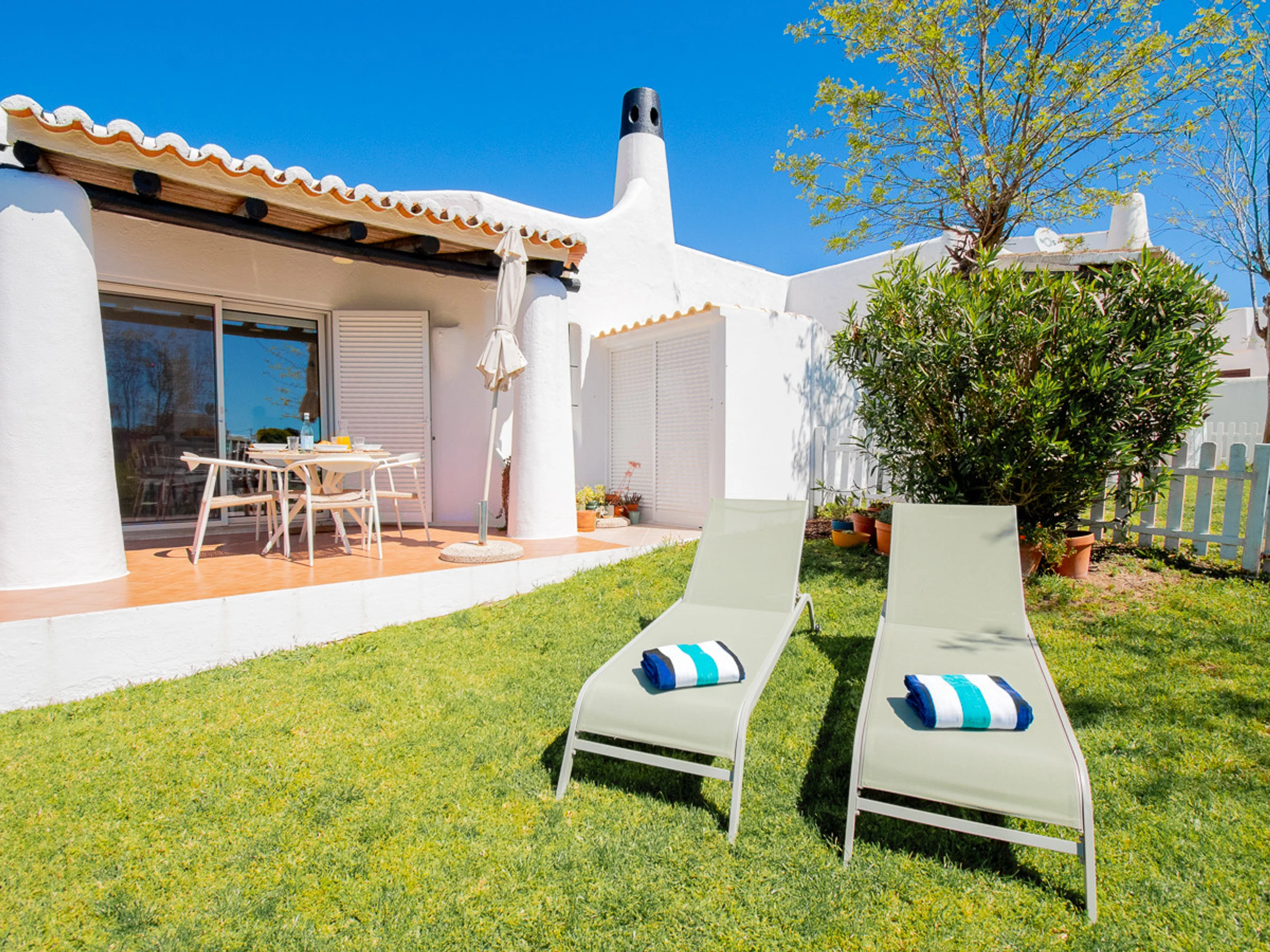 Superbly appointed and furnished bungalow with private garden, offering two air-conditioned bedrooms, one with a double bed and one with twin beds, which share the use of a bathroom with a walk-in shower. There is a fully fitted and equipped kitchen (with oven/hob, microwave, washing machine, and dishwasher). The lounge/dining area is cosy and comfortable with air conditioning and a smart TV. There are double aspect patio doors to the courtyard and the very private south facing terrace with BBQ and opening onto the private garden, an ideal spot for dining al fresco and also plenty of space for relaxing on sun loungers