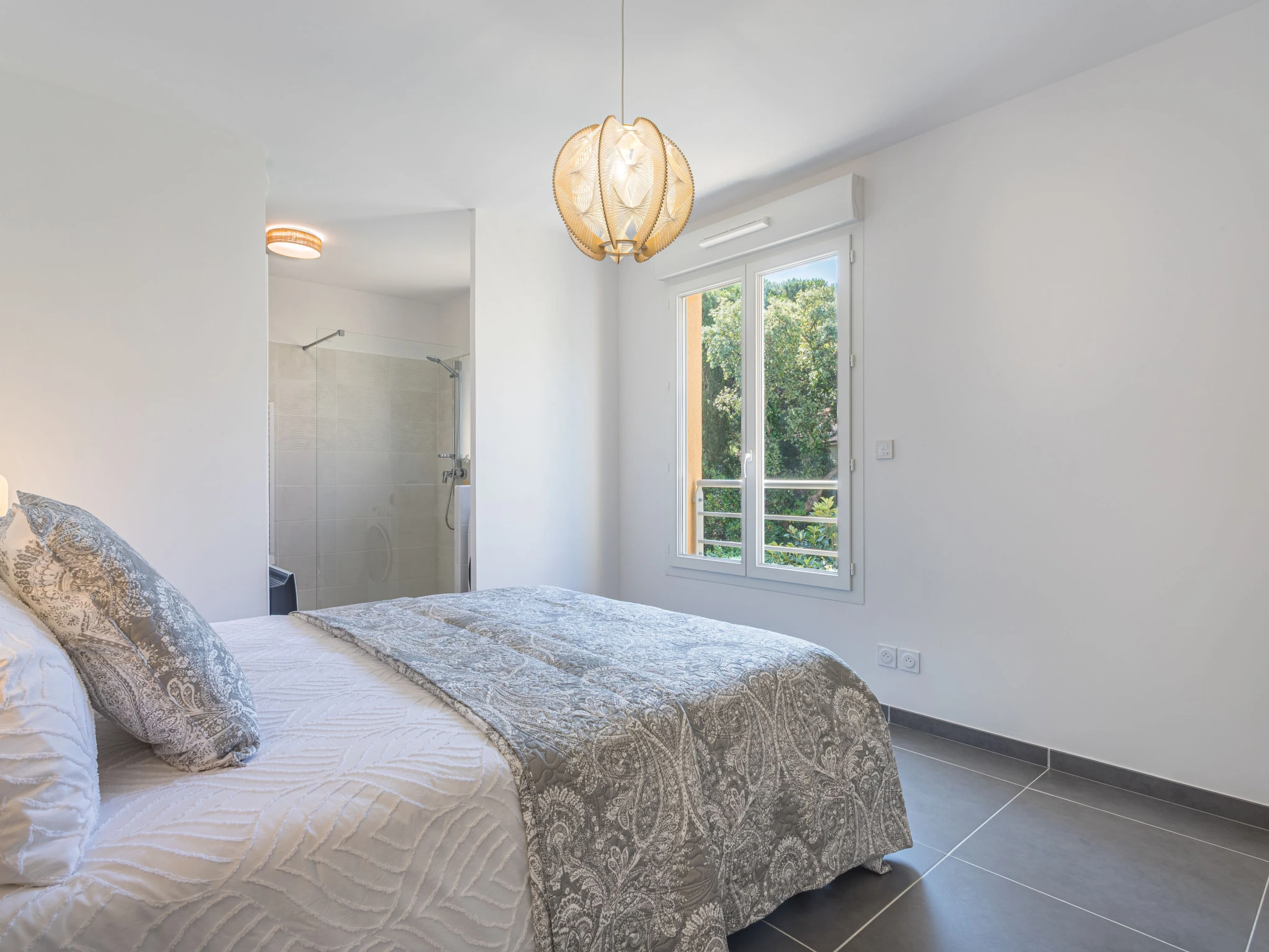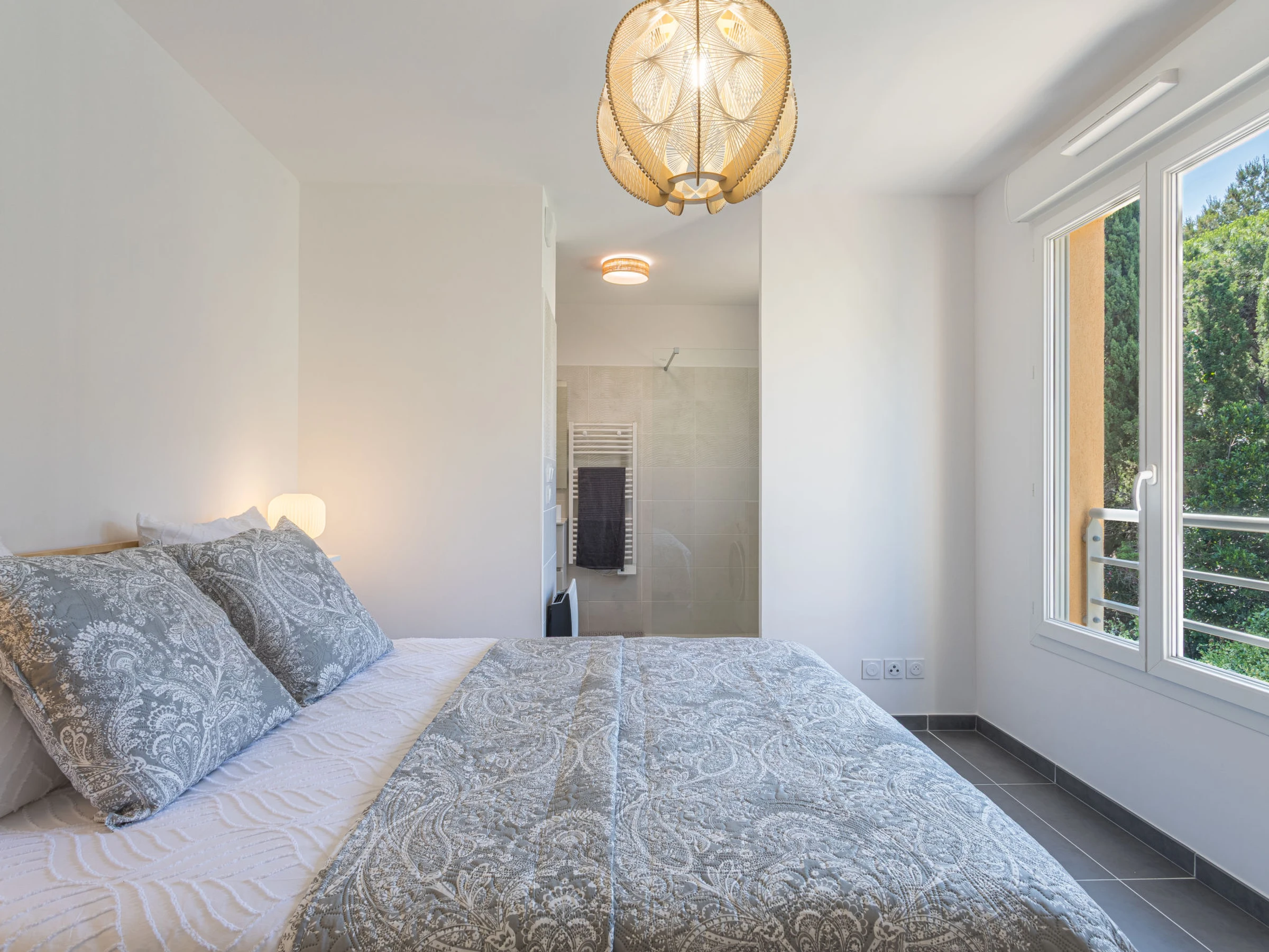 2-room apartment 42 m2 on 2nd floor. Bright, comfortable furnishings: living/dining room with TV (flat screen), air conditioning. Exit to the terrace. 1 room with Dressing room with 1 french bed (160 cm, length 190 cm), bathroom. Open kitchen (oven, dishwasher, 3 induction hot plates, toaster, kettle, microwave, electric coffee machine, Capsules for coffee machine (l'or) extra). Sep. WC. Electric heating. Terrace 8 m2, south-east facing position. Terrace furniture. Facilities: washing machine, iron, hair dryer. Internet (WiFi, free). Garage space n 1 (2 cars), height 194 cm, width 280 cm. Please note: non-smokers only. Smoke alarm. Offer by a commercial proprietor according to Art. 155, IV, CGI