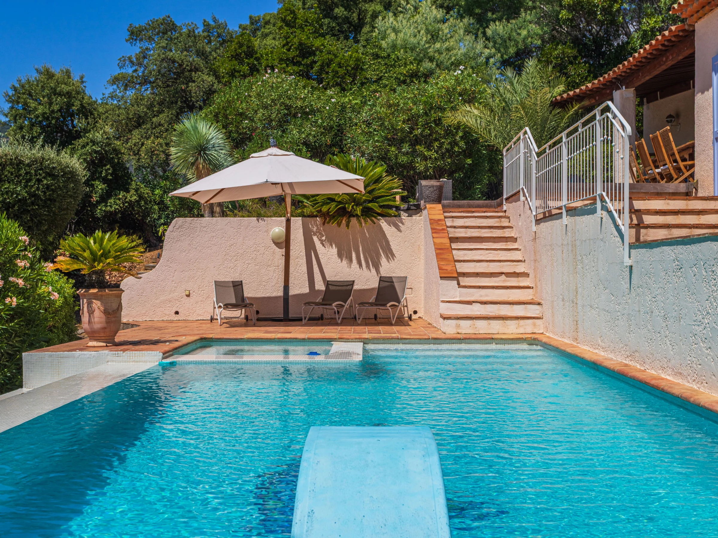 Villa "Manureva". On the outskirts, 2 km from the centre of cavalaire sur Mer, 1.6 km from the sea, 1.6 km from the beach, in a cul-de-sac, south-west facing position. Private: well-kept garden, swimming pool (9 x 5 m, depth 155 - 210 cm, seasonal availability: [hidden] - [hidden] Steep motor access. (10 steps). Shop 2 km, grocery 1 km, supermarket 3 km, shopping centre 10 km, restaurant 1 km, bar 1 km, bakery 1 km, bus stop "Du parc" 1.6 km, sandy beach "Terre de sable" 1.6 km, park "Aqualand" 24 km, diving center 2 km. Minigolf 12 km, cycle lane 650 m. Nearby attractions: Azur Park, Paint-ball 12 km, Bowling à Port-Grimaud 13 km, St-Tropez 17 km, Ste-Maxime 24 km. Hiking paths: Sentier du Fenouillet 4.5 km, Sentier du littoral 6.3 km, Toulon 60 km. The keys‘ handover takes place by the agency in Cavalaire.