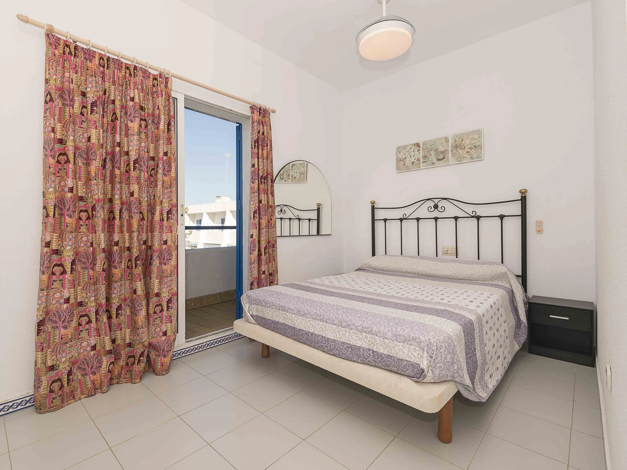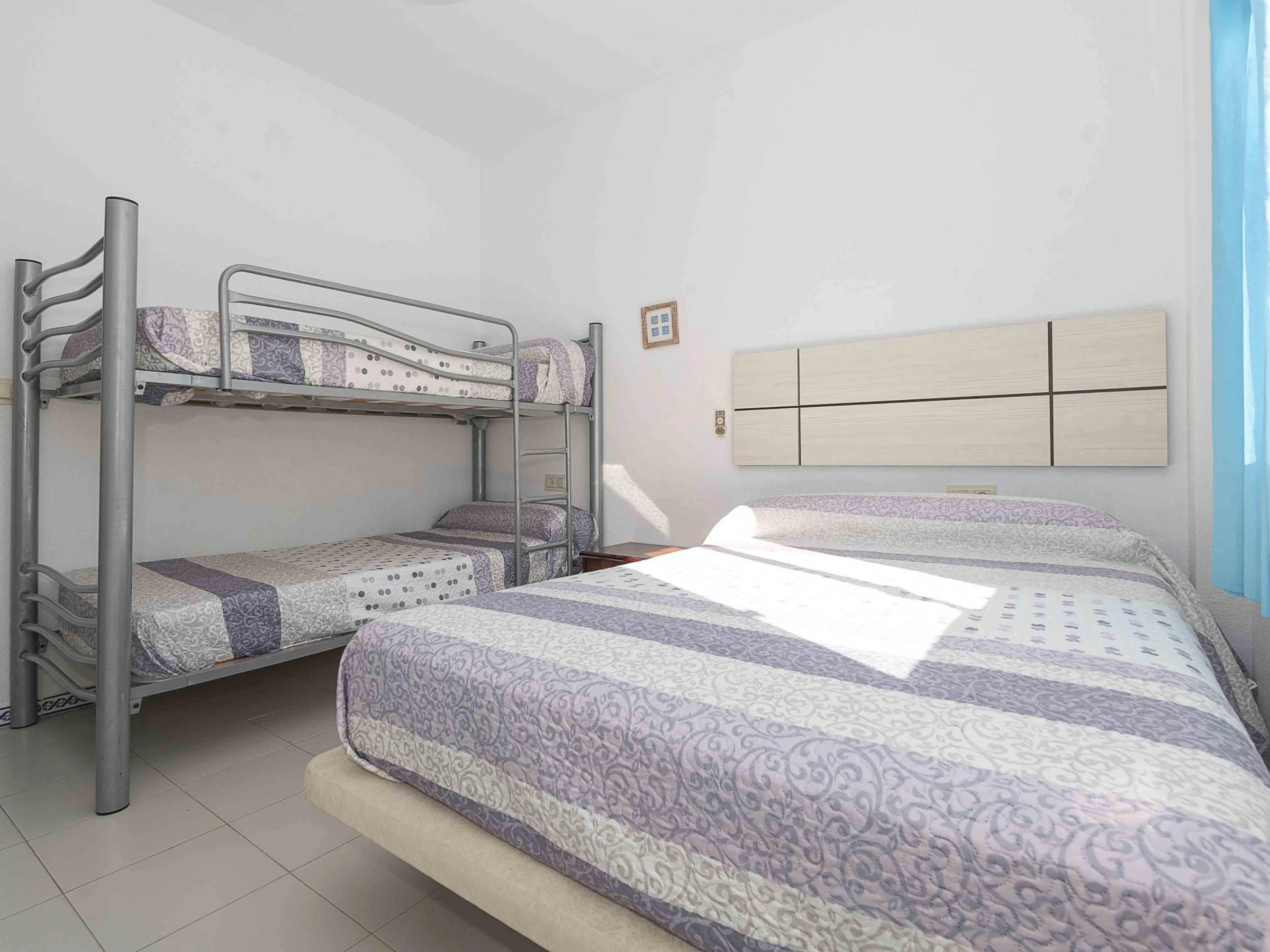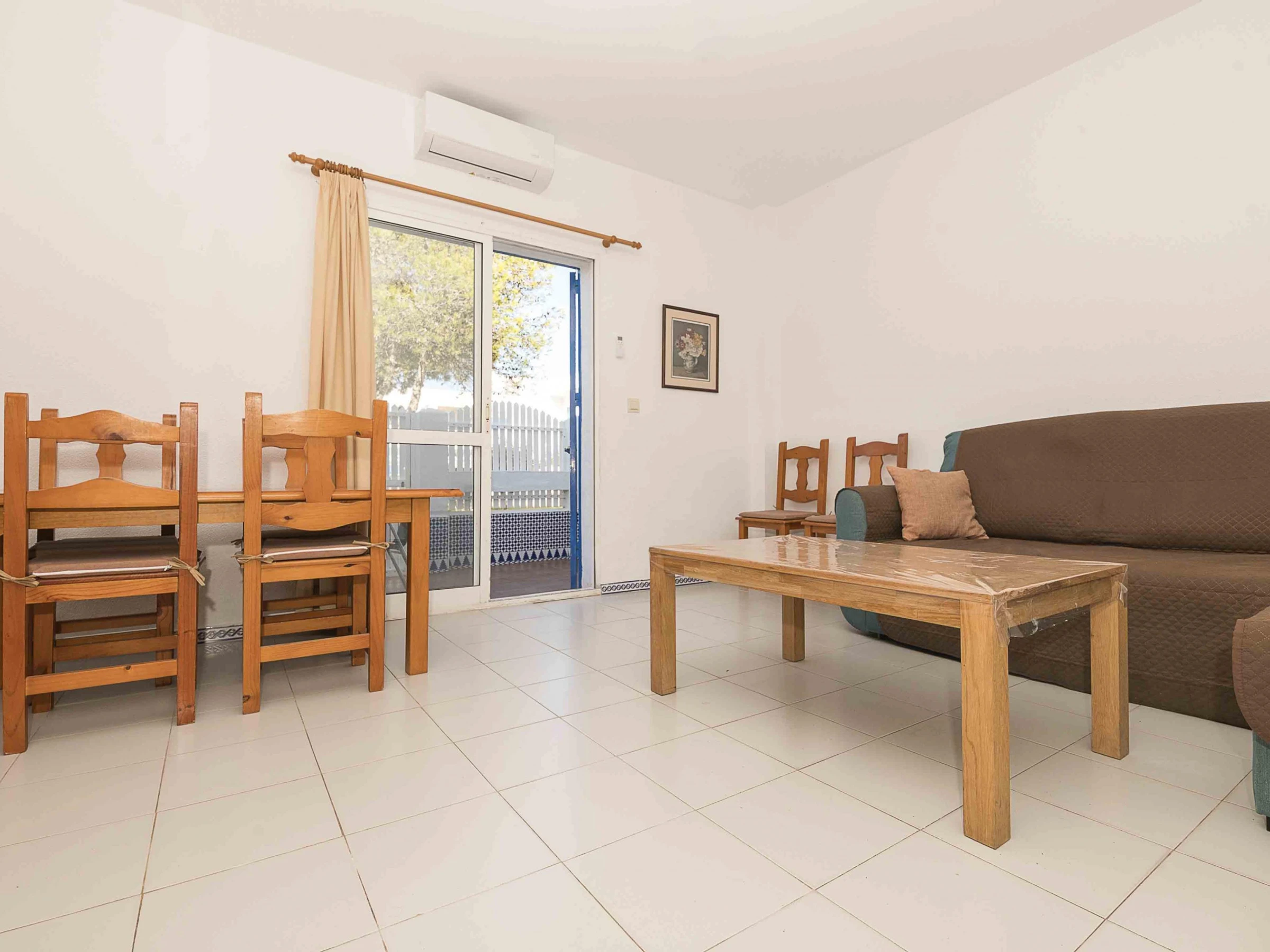 The interior is laid out over two floors. On the ground floor, you will find the living-dining room with air conditioning, providing a bright and comfortable space that connects to the gas kitchen and the laundry area equipped with a washing machine, iron and ironing board. There is also a guest toilet. On the upper floor, you will find two bedrooms and a full bathroom with a bathtub. The main bedroom has a double bed, a ceiling fan and access to a small balcony; the second bedroom, with a double bed and a bunk bed with two single beds, is also equipped with a fan and spacious wardrobes.