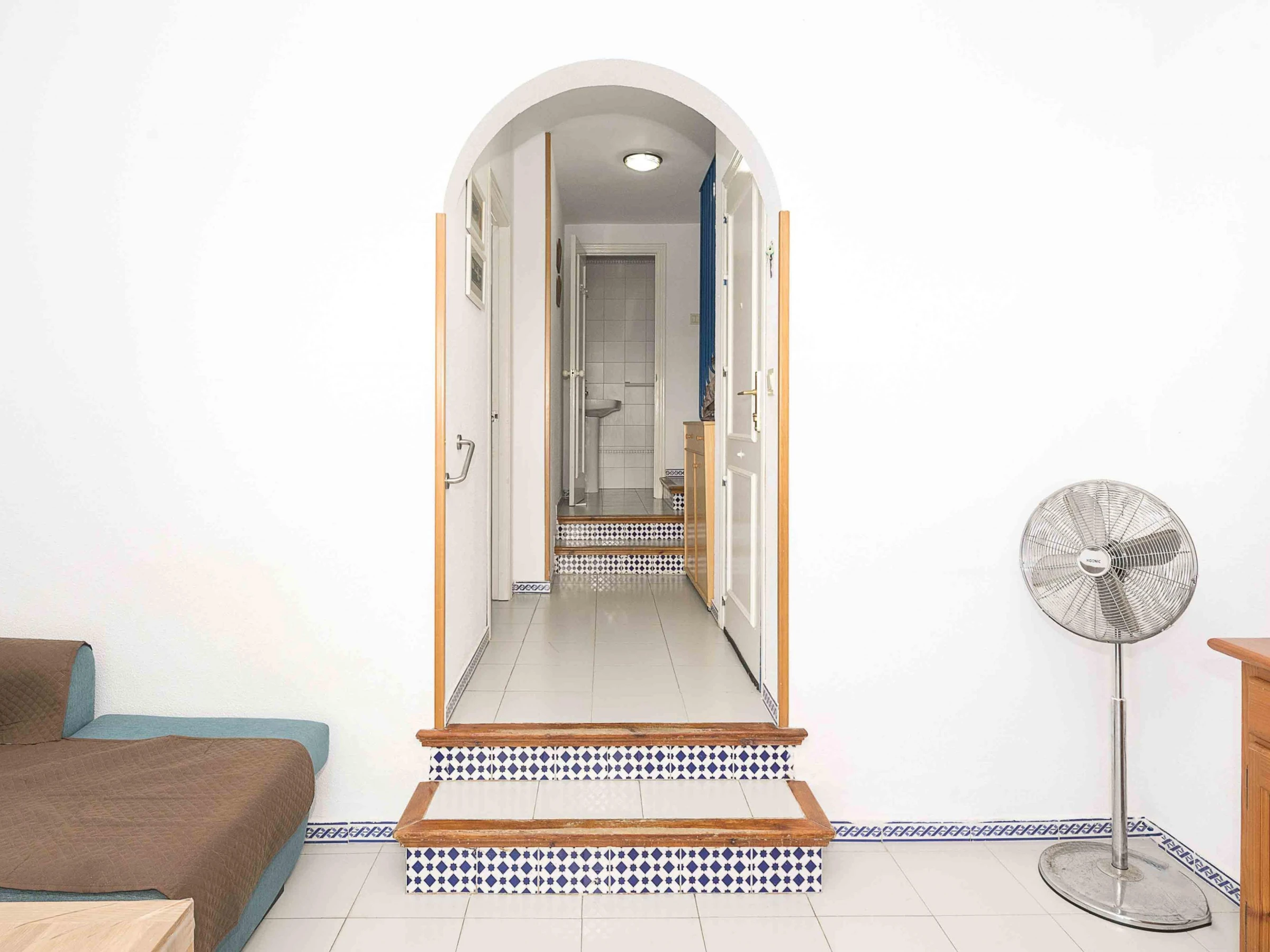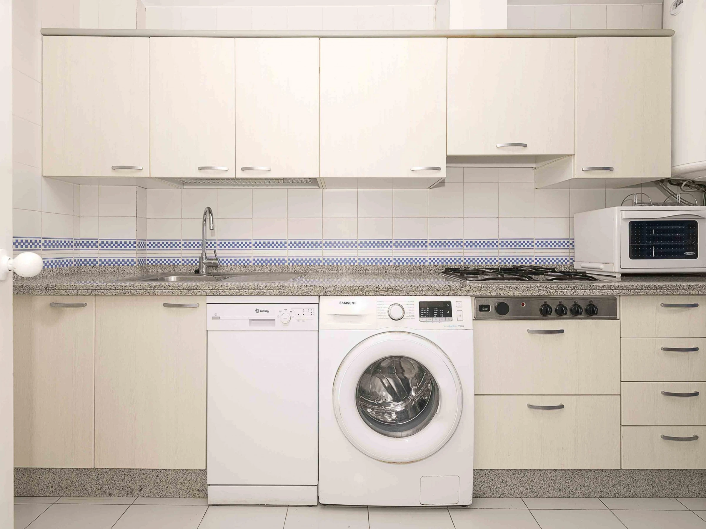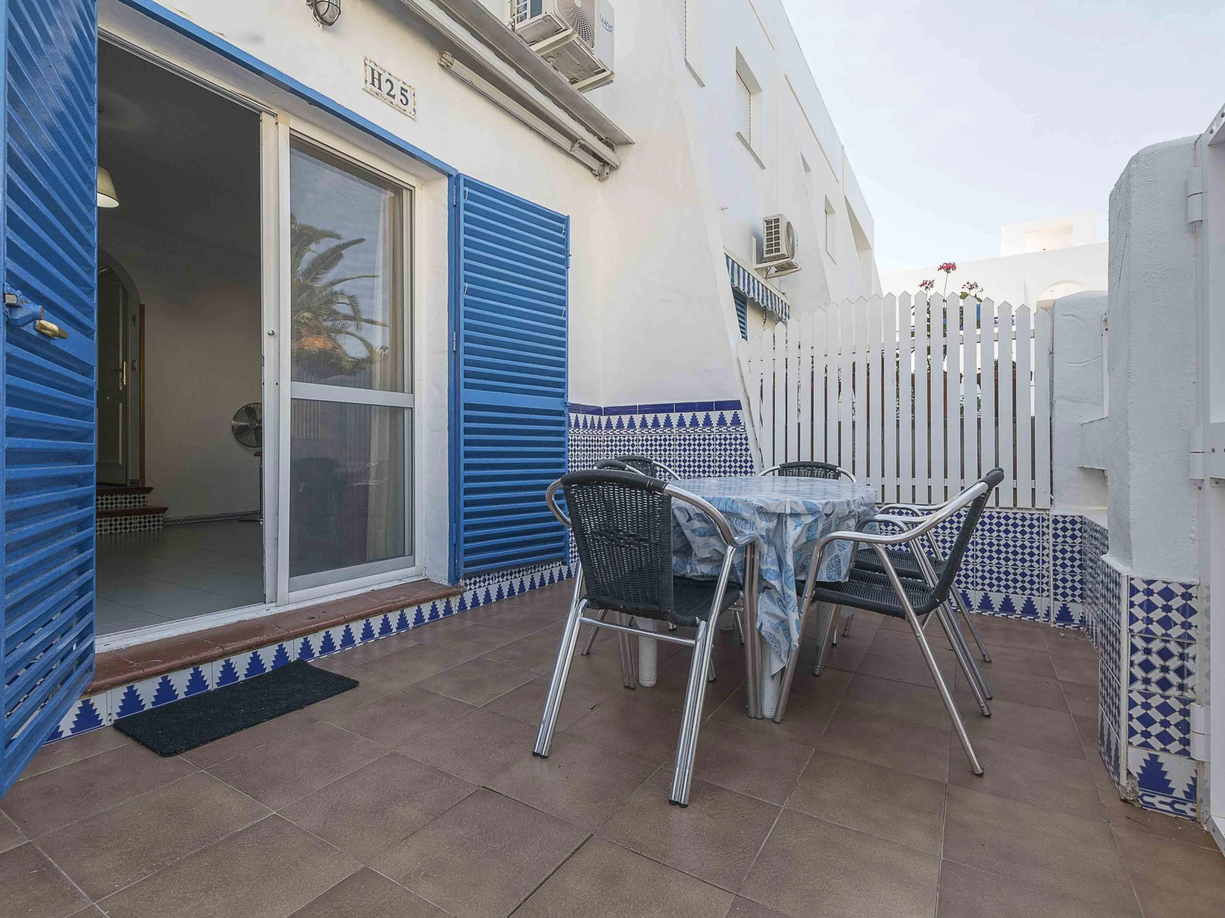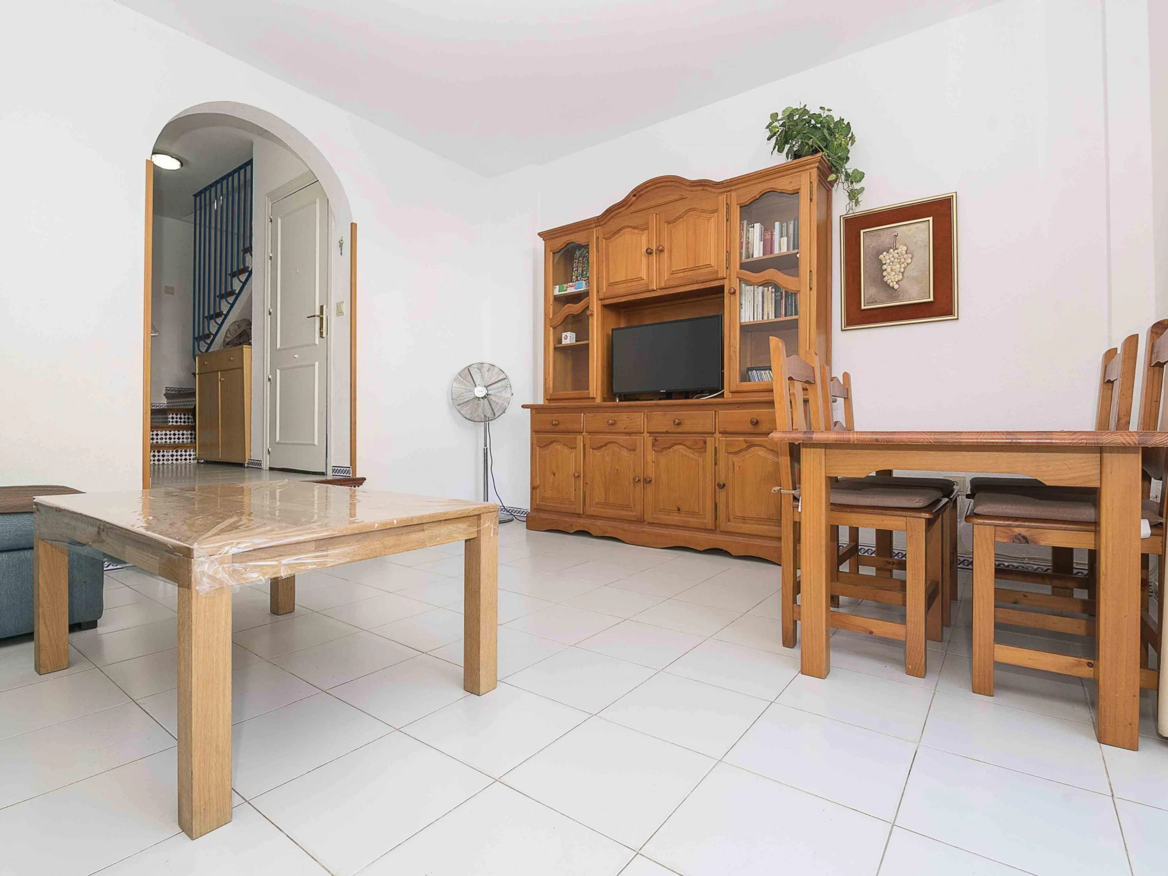 The interior is laid out over two floors. On the ground floor, you will find the living-dining room with air conditioning, providing a bright and comfortable space that connects to the gas kitchen and the laundry area equipped with a washing machine, iron and ironing board. There is also a guest toilet. On the upper floor, you will find two bedrooms and a full bathroom with a bathtub. The main bedroom has a double bed, a ceiling fan and access to a small balcony; the second bedroom, with a double bed and a bunk bed with two single beds, is also equipped with a fan and spacious wardrobes.