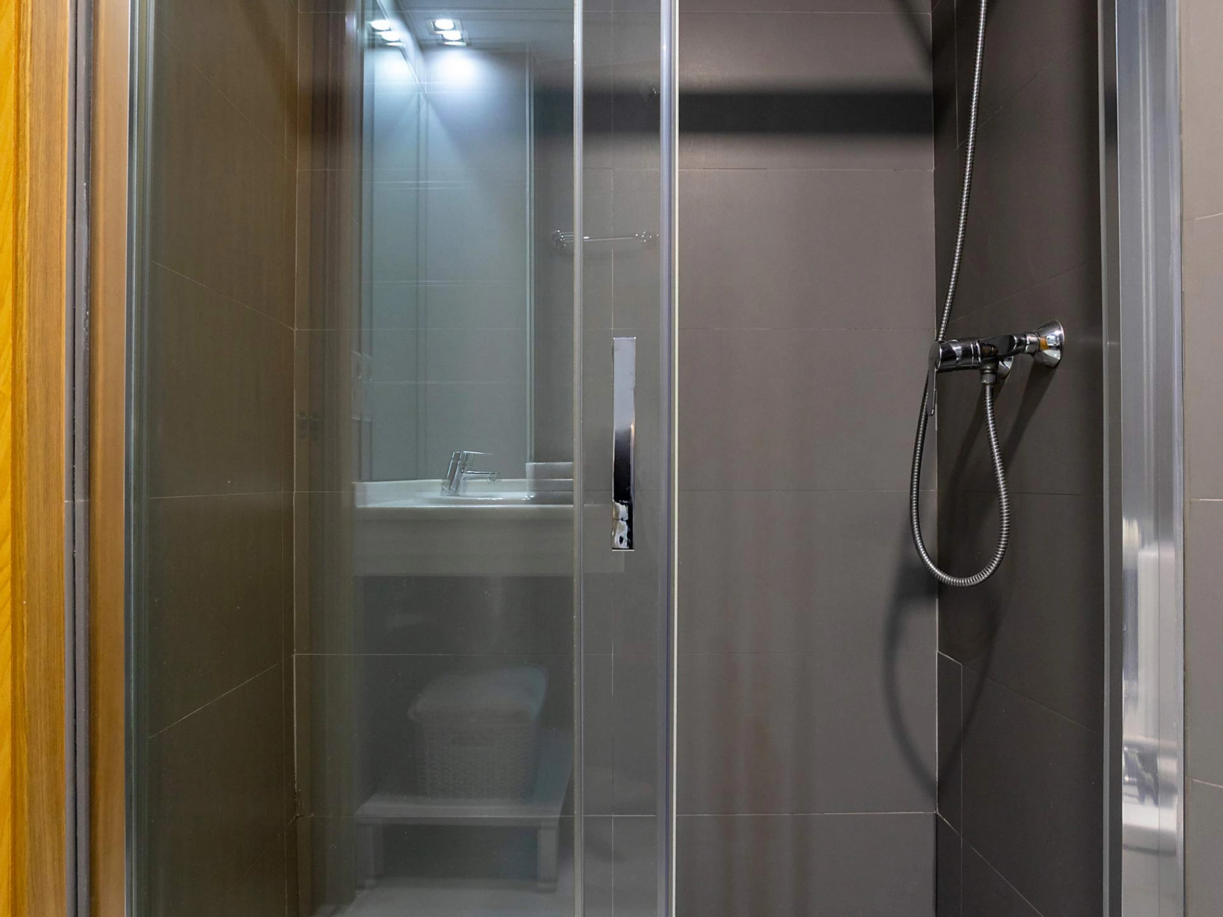Upon entering, a welcoming hallway leads to the first bedroom with a single bed (105x190 cm), while directly opposite is a modern bathroom with walk-in shower. At the end of the hallway is the second bedroom, furnished with two single beds (90x190 cm), a built-in wardrobe, and large windows that flood the room with natural light.