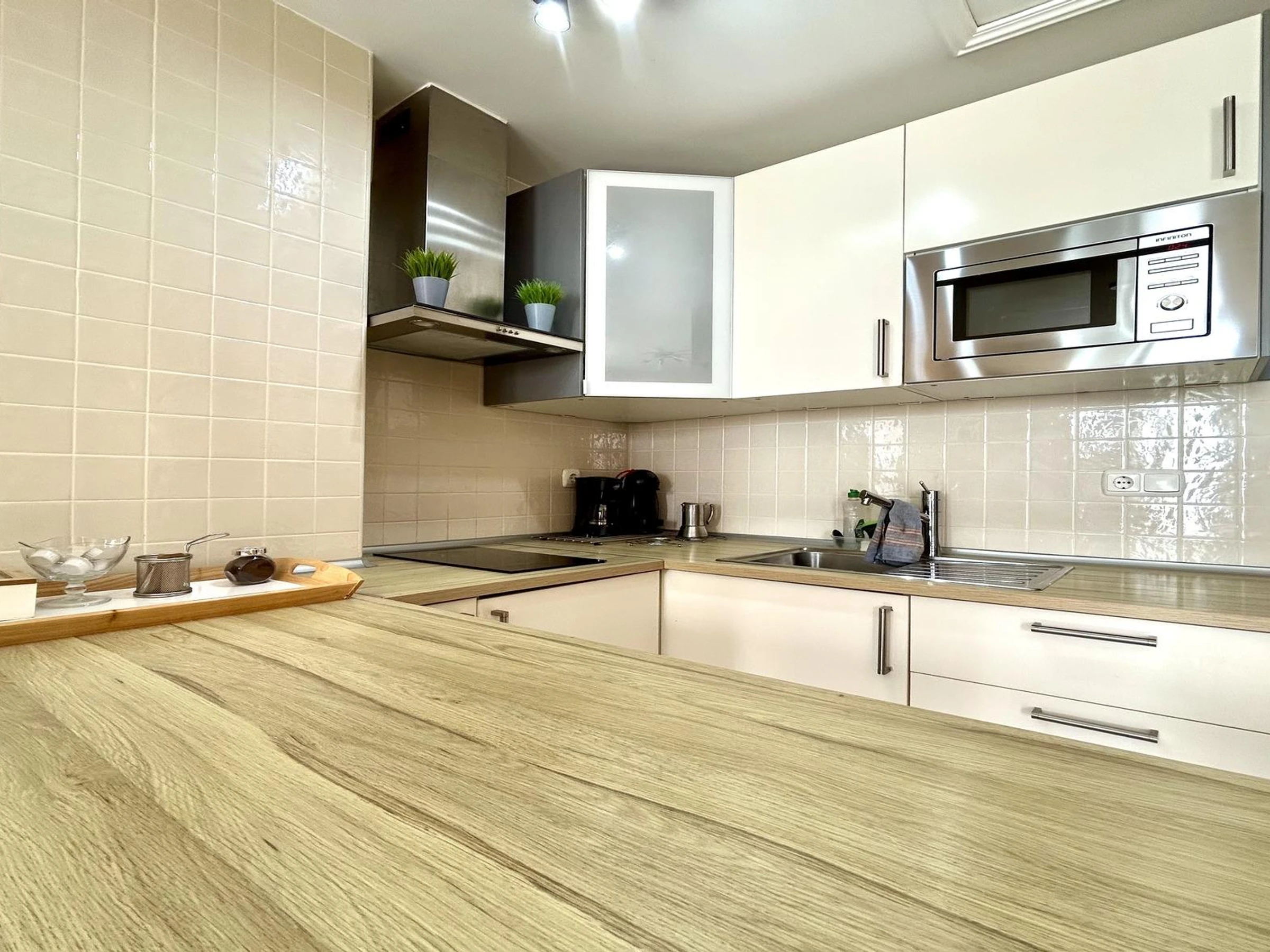 Fully equipped kitchen with microwave, fridge, and kitchen utensils.