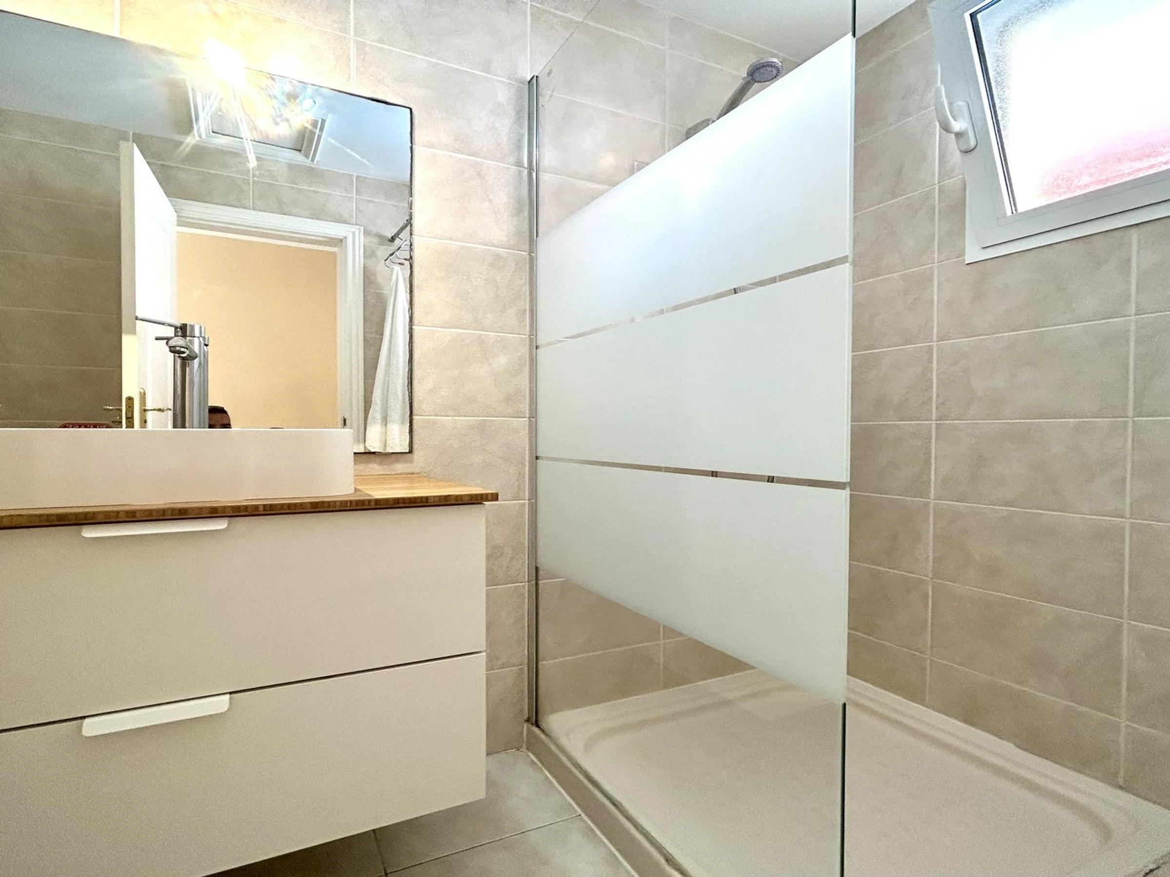 Bathroom with shower, hairdryer, and towels included.
