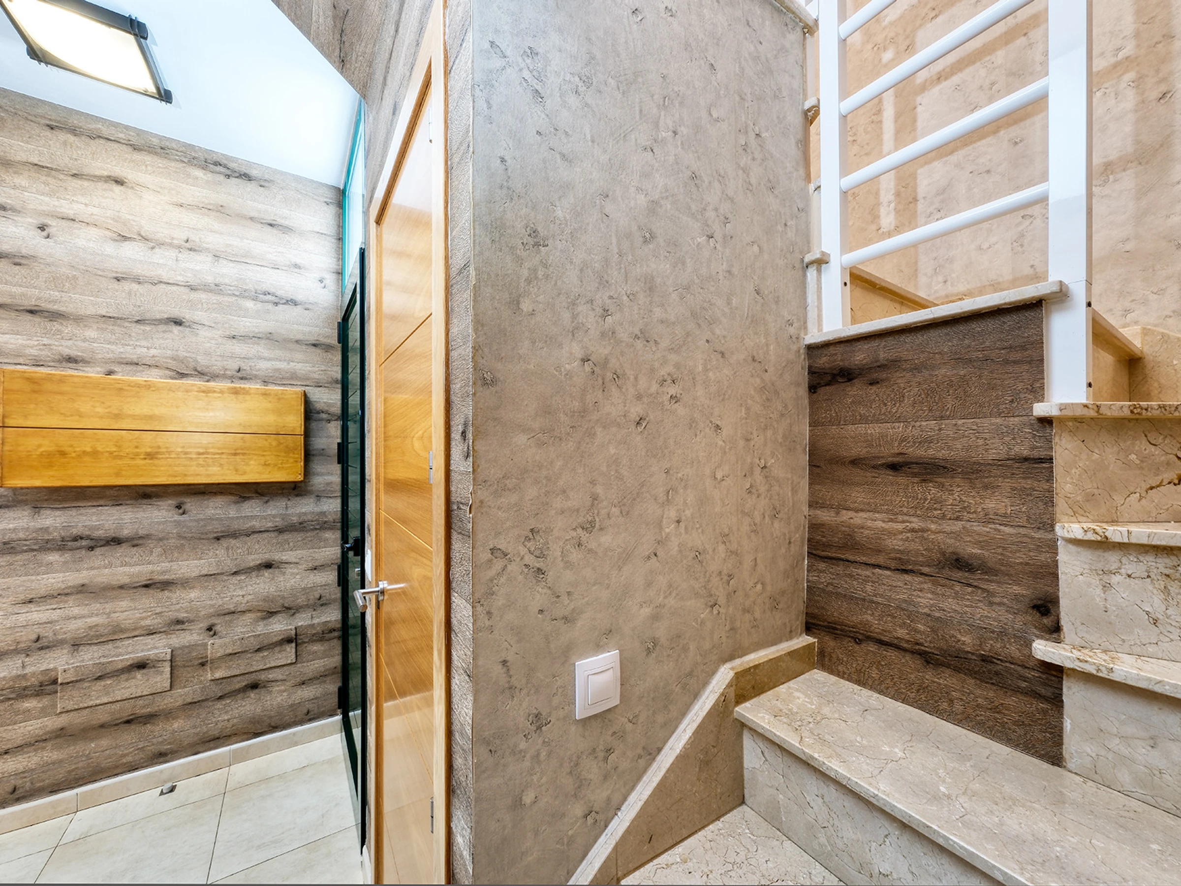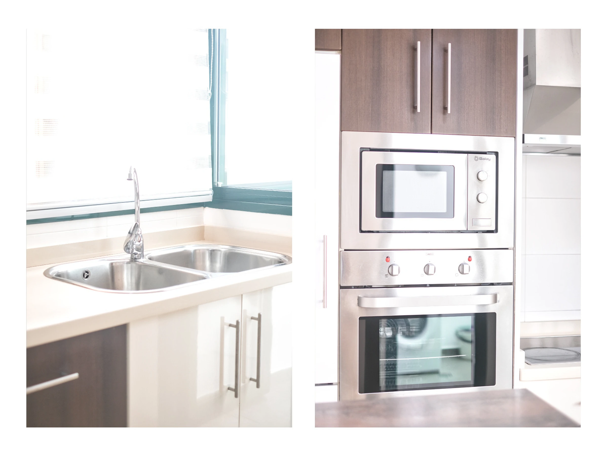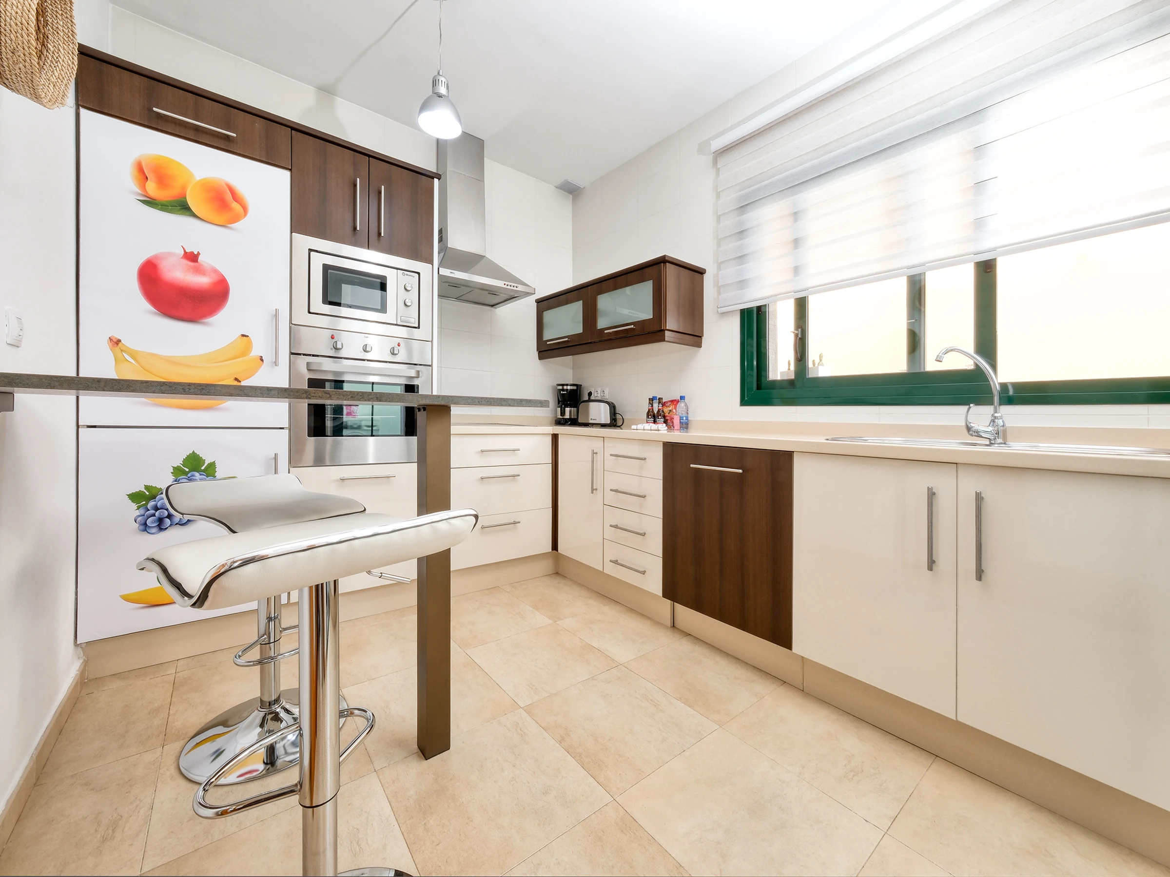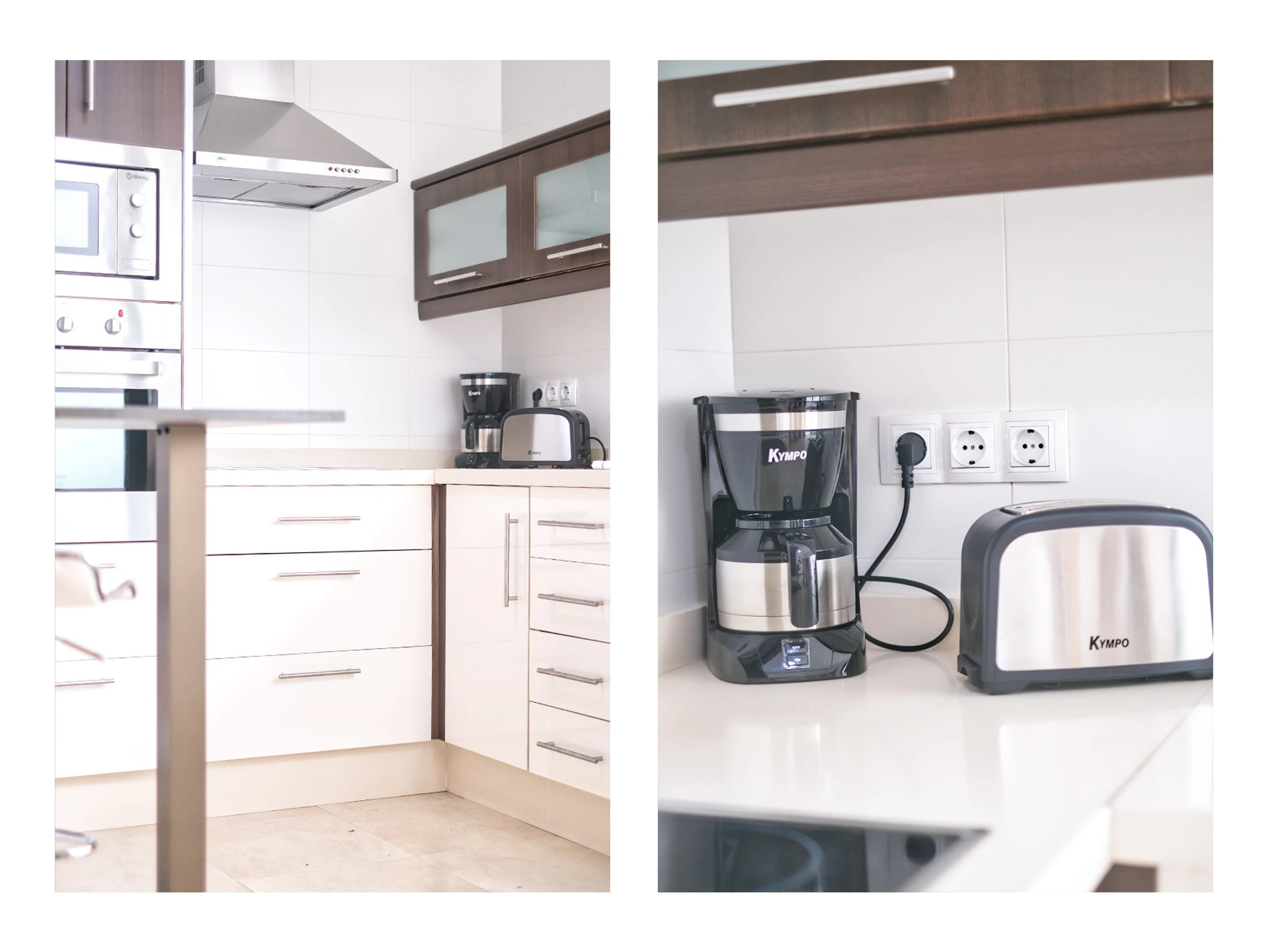 The kitchen, fully equipped with an oven, microwave, dishwasher, ceramic hob, fridge and all the utensils you might need, as well as a coffee maker and kettle, allows you to prepare everything from a relaxed breakfast to delicious dinners as if you were at home.