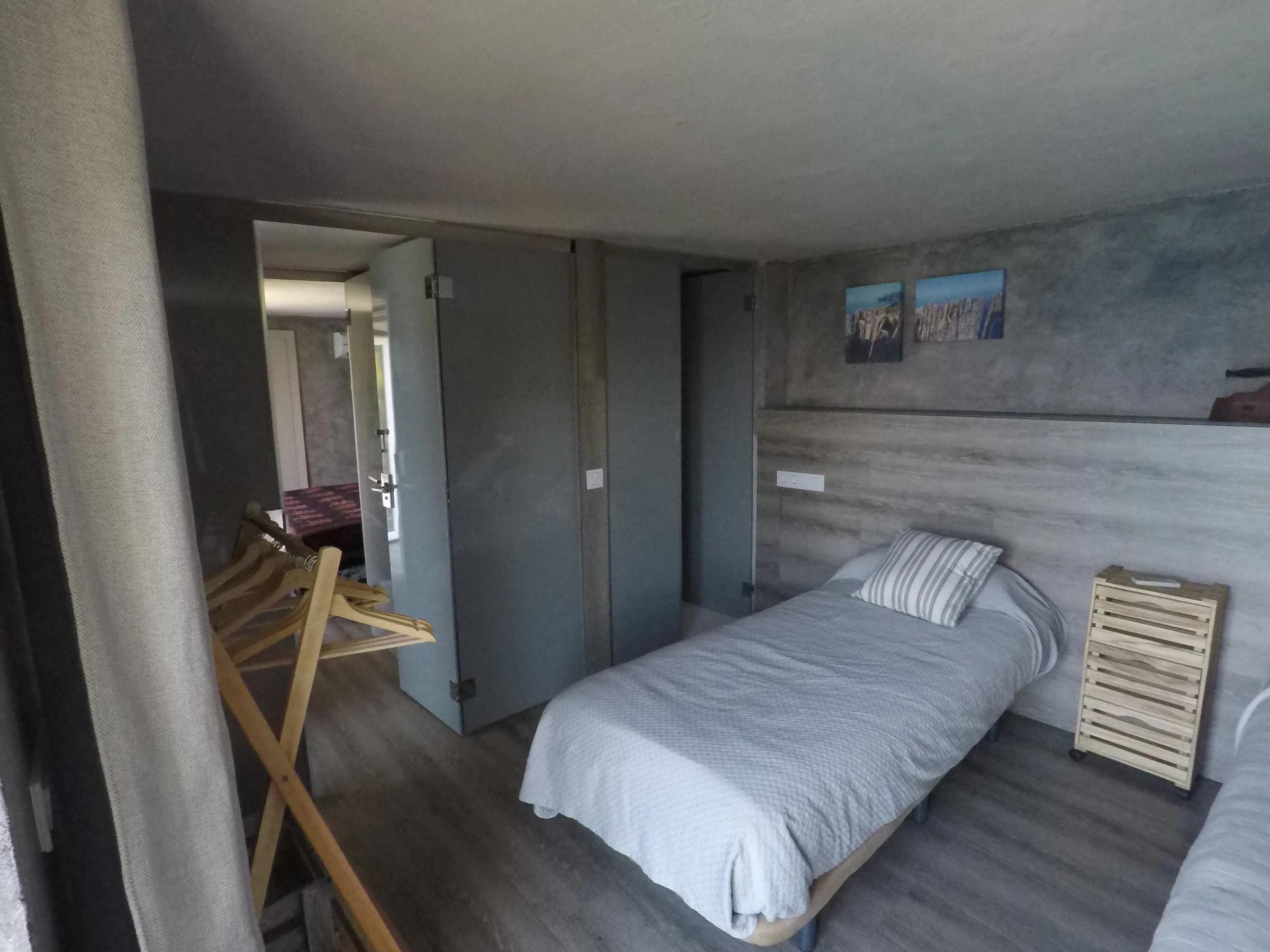 Upper floor: two bedrooms, a bathroom with shower, living room and open kitchen.