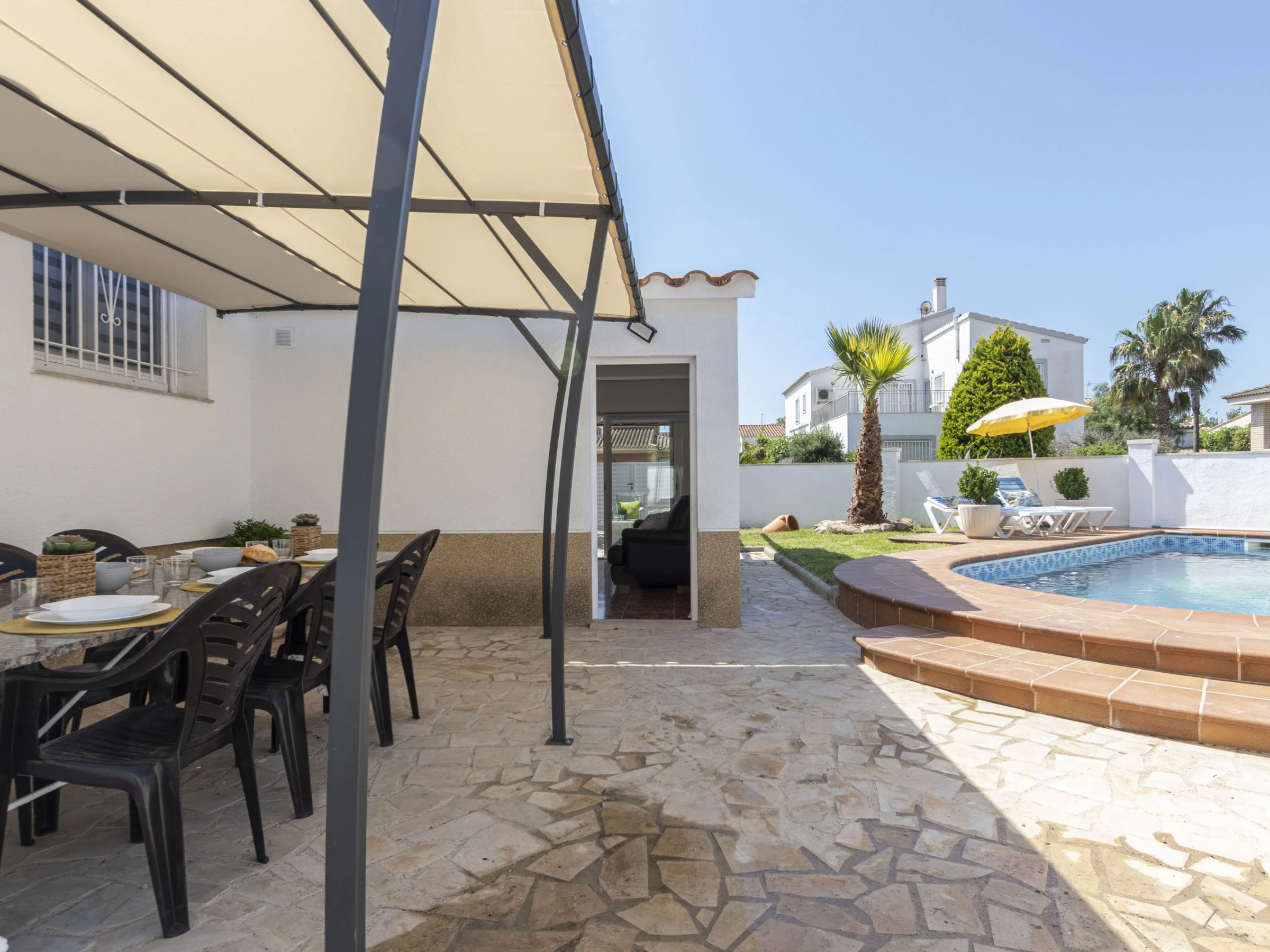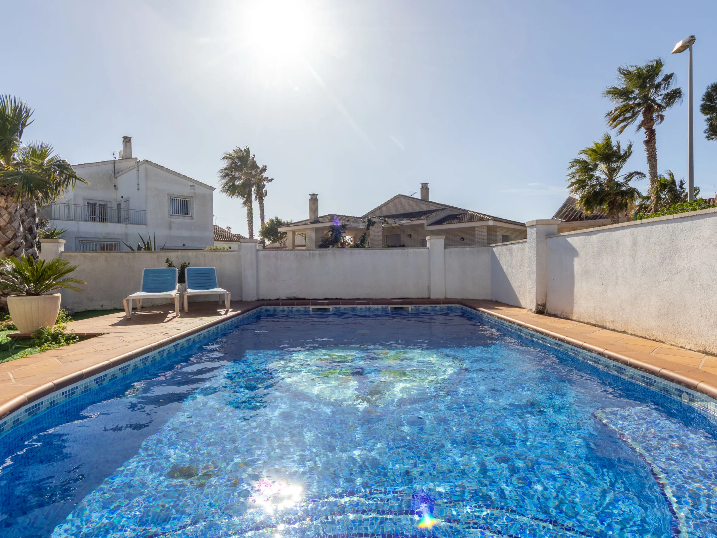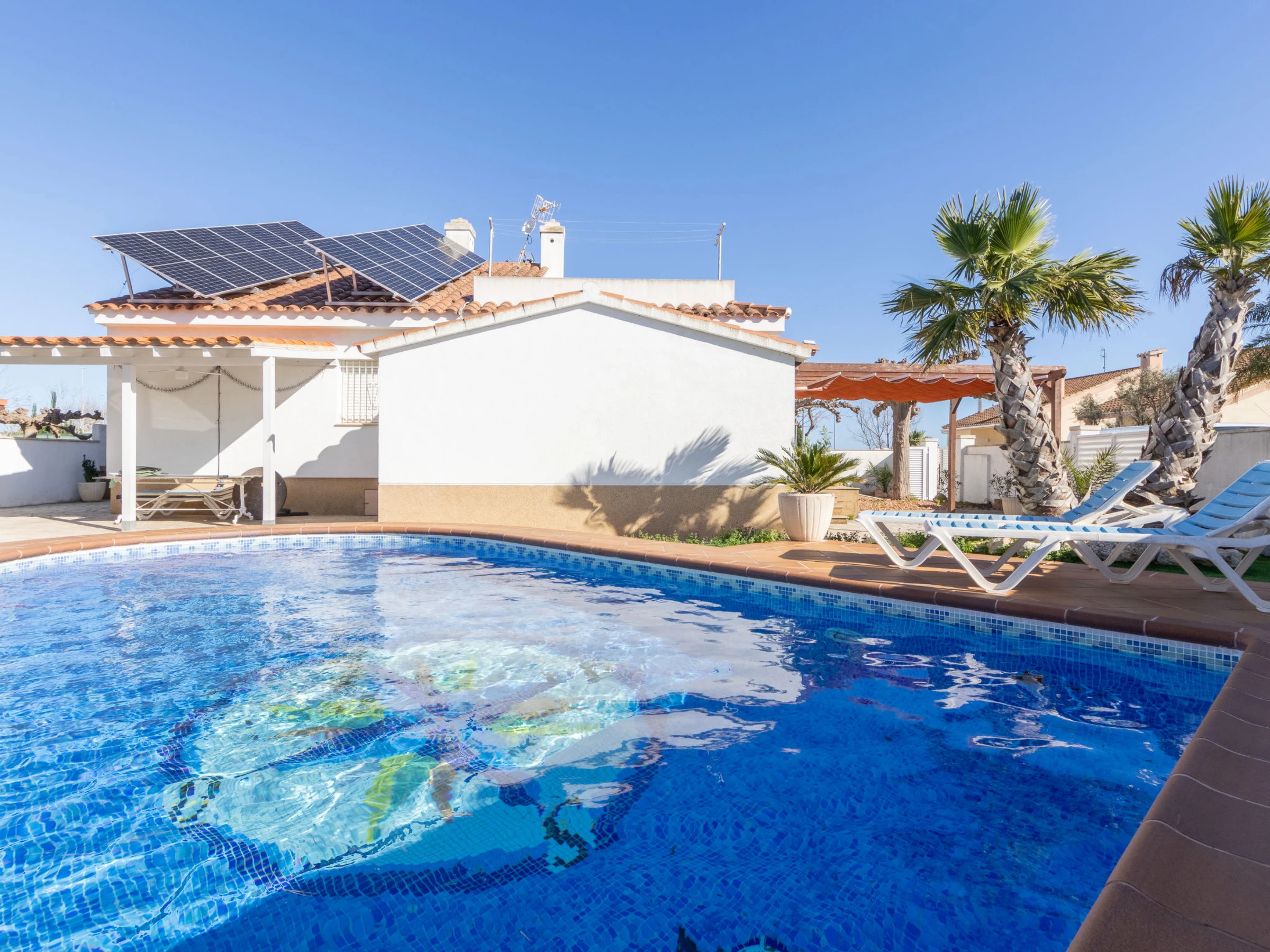 Riumar 11 km from Deltebre: Large, cosy, comfortable house "Estrella", 2 storeys, renovated in 2020. In the district Riumar Delta del Ebro, in a quiet, sunny position residential area (villas), 100 m from the sea, 100 m from the beach. Private: property (fenced), swimming pool angular (8 x 4 m, depth 100 - 170 cm, seasonal availability: [hidden] - [hidden] with internal staircase. Outdoor shower, hot tub, patio, pergola, garden furniture, barbecue. In the house: WiFi, air conditioning, washing machine. Parking (for 2 cars) at the house. Shop, supermarket, restaurant, bar, bakery 100 m, 5 minute walk to the centre, bus stop "Riumar" 300 m, railway station "Aldea- Amposta" 25 km, sandy beach "Riumar" 100 m. Sports harbour 1 km, golf course (18 hole) 15 km, cycle lane 50 m. Nearby attractions: Parque natural Delta del Ebro 10 m, Port Aventura 65 km, Parque Acuatico 65 km, Barcelona 190 km, Tortosa 35 km. Hiking paths: Parque natural Puerto Tortosa Beseit 25 km, GR 92 15 km. Please note: car recommended. Suitable for families. Groups of teenagers on request only.