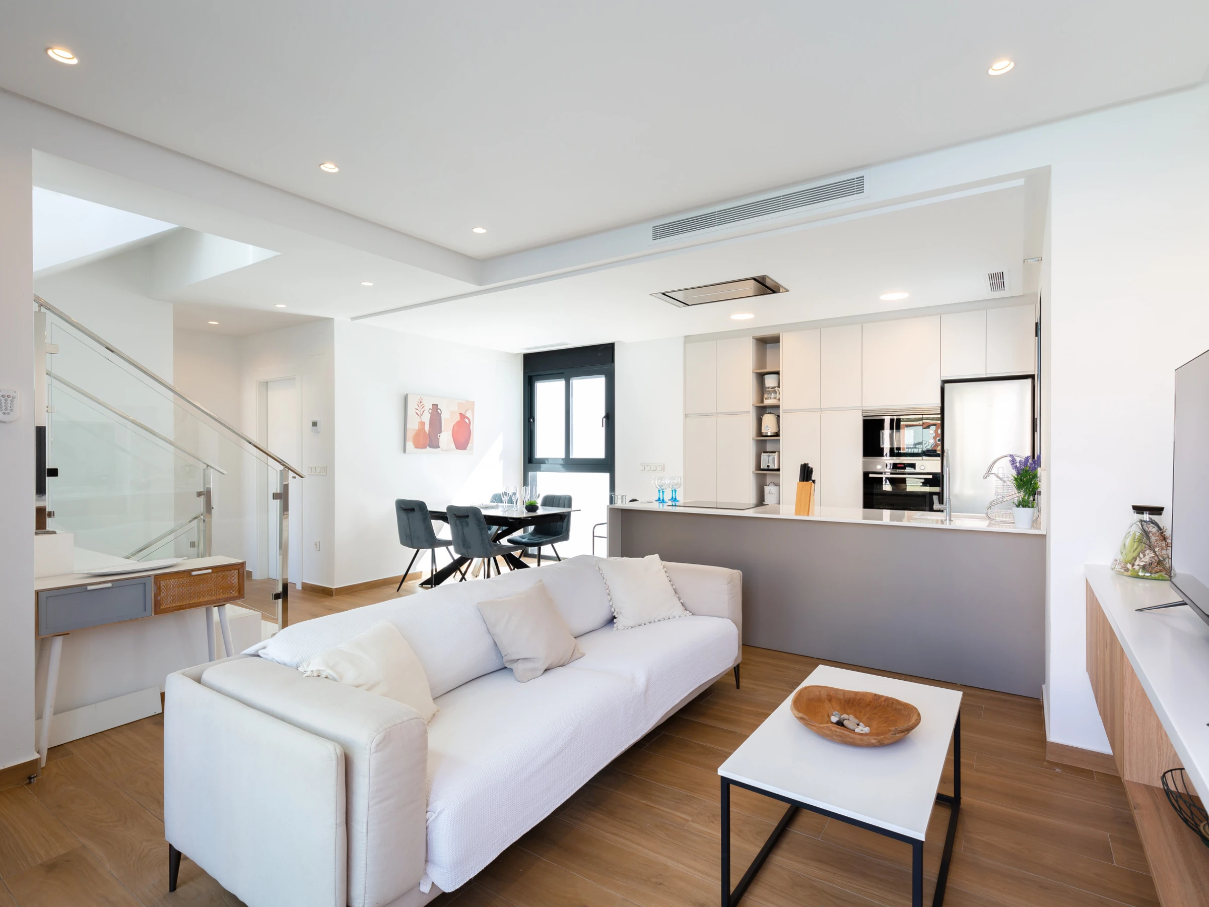 As soon as you step foot in this stunning multi-floor villa, you're greeted by one of the spacious yet highly comfortable living areas this villa has to offer. Decorated elegantly, the interior design of this brand-new villa beautifully complements the picturesque coastal El Campello location.