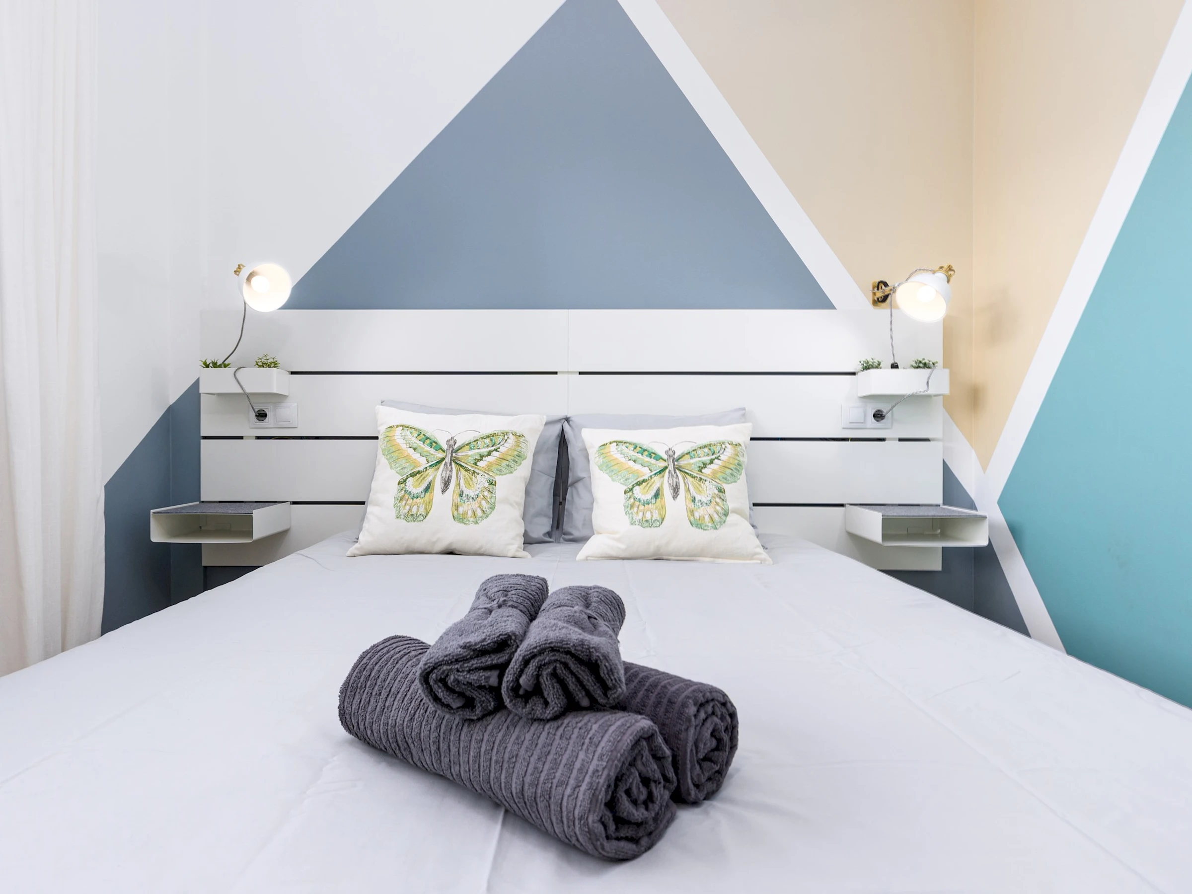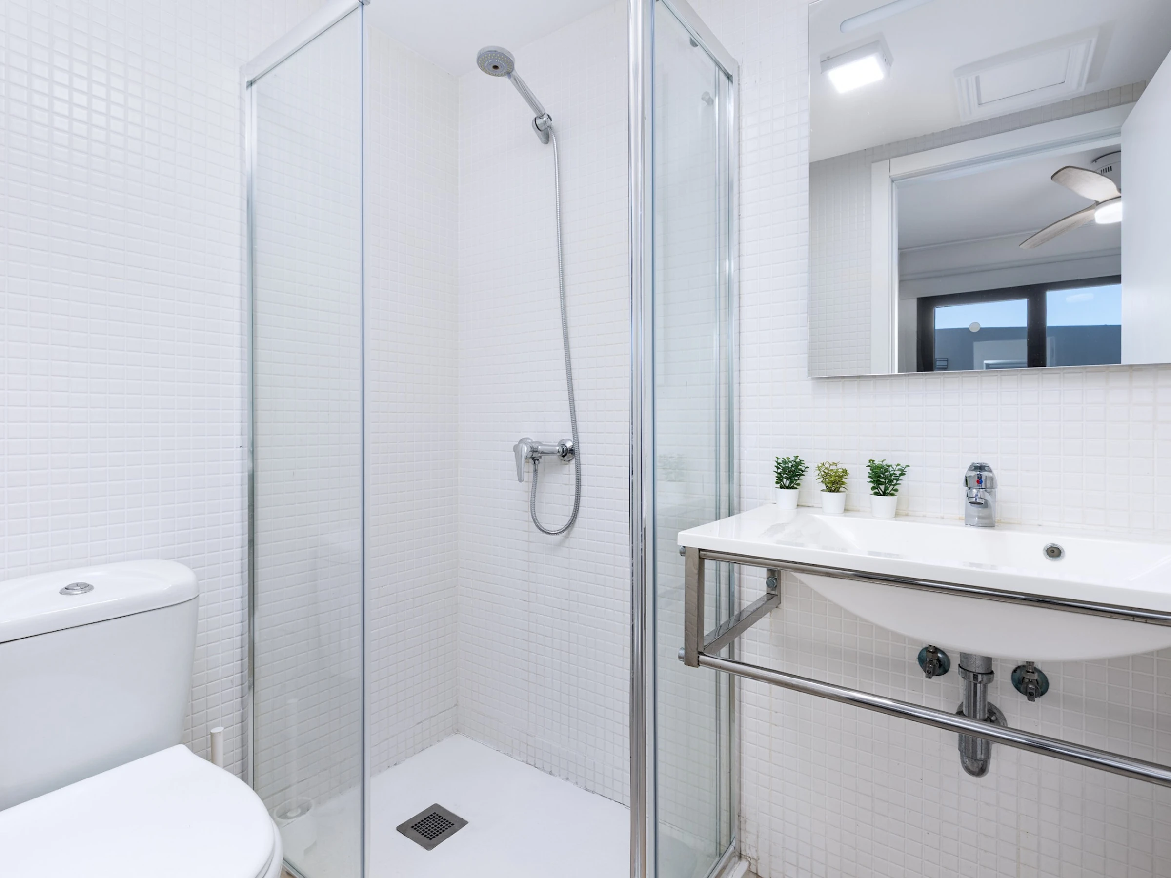 The main bedroom is designed for rest, with a comfortable double bed, spacious wardrobes and décor in soft tones. The bathroom, practical and bright, features a spacious shower and clean lines that enhance the sense of calm.