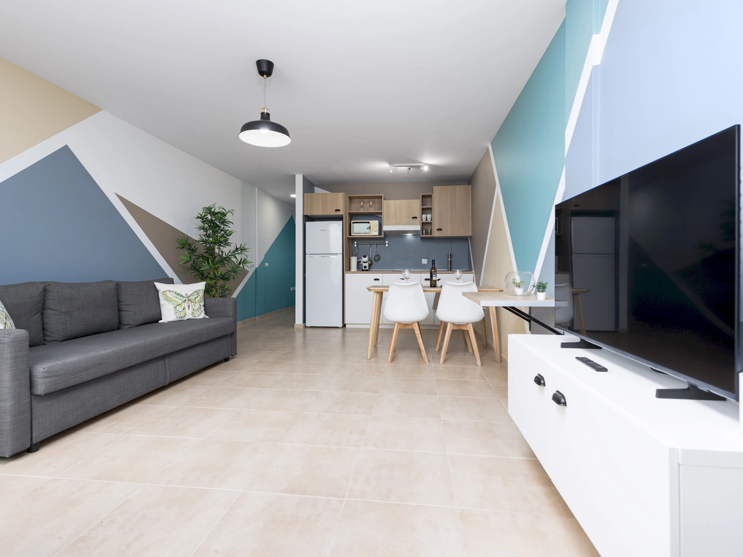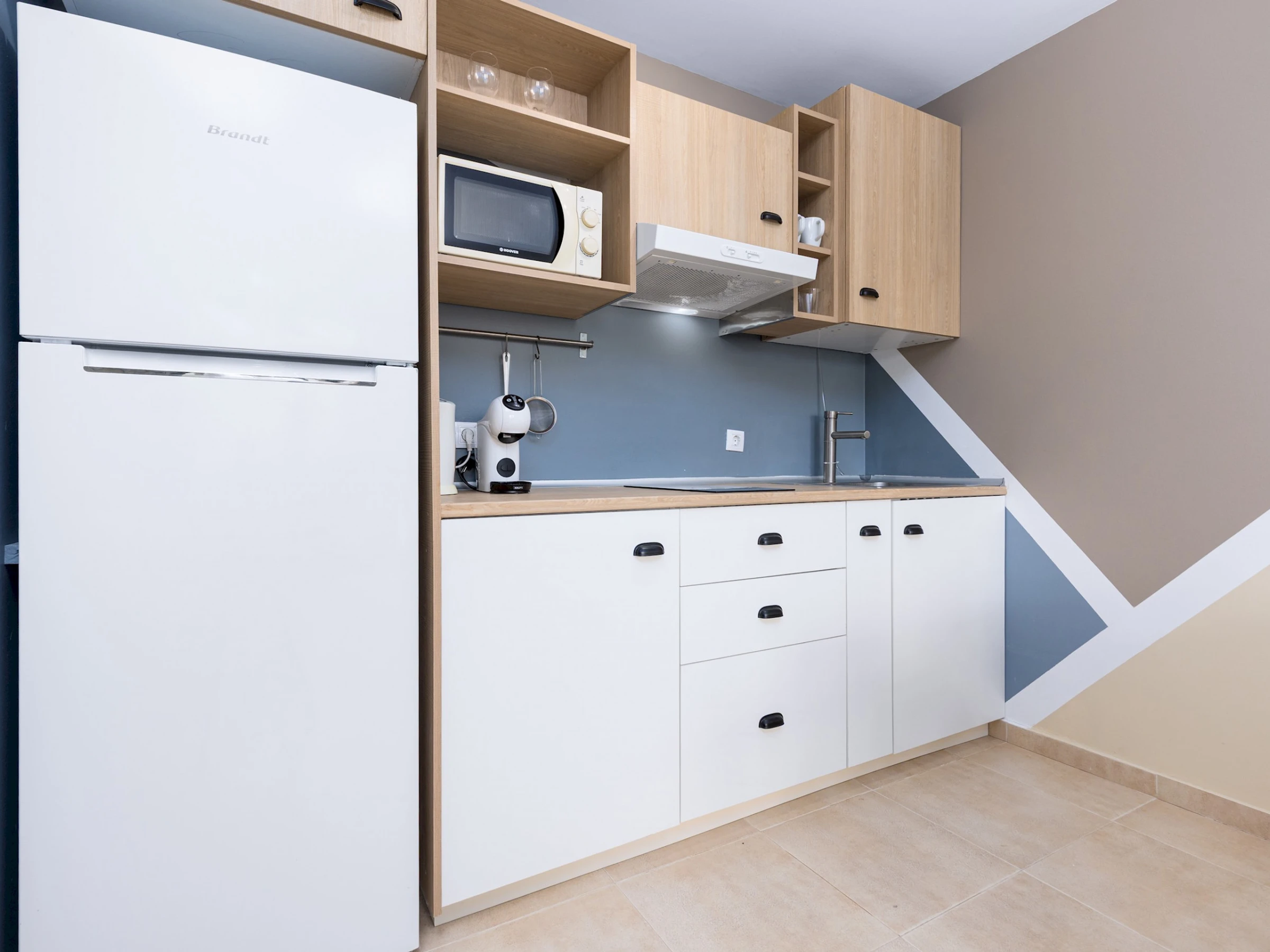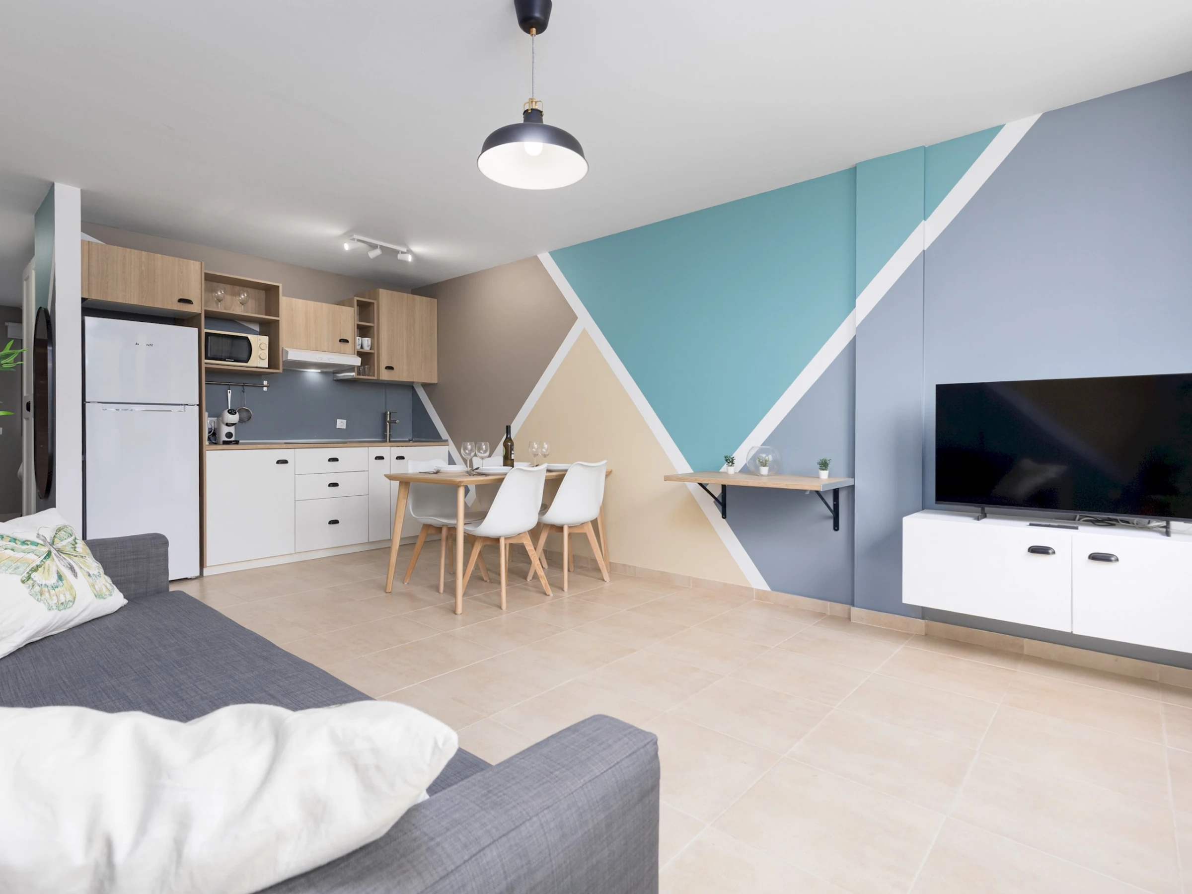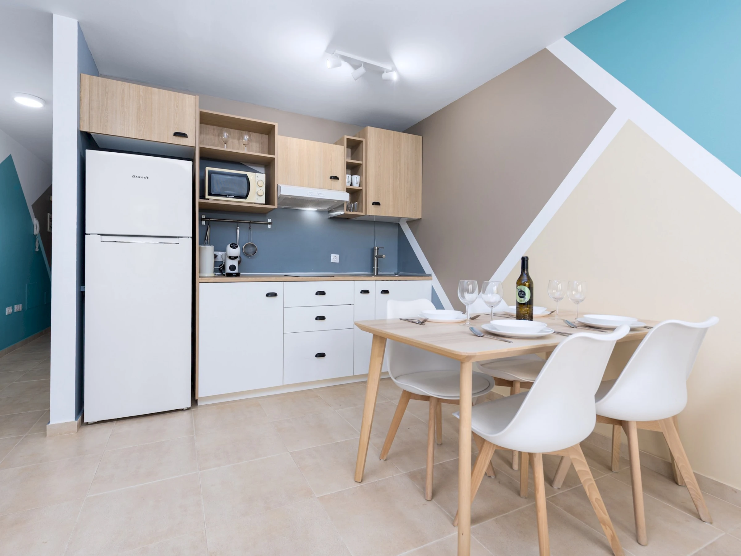 Upon entering, the apartment reveals a calm atmosphere that invites you to stay. The living and dining area, filled with natural light, provides a pleasant setting to relax, watch a film, or simply enjoy the quiet after a day at the beach. The open, modern and functional kitchen allows you to prepare simple meals while staying connected to the rest of the space.