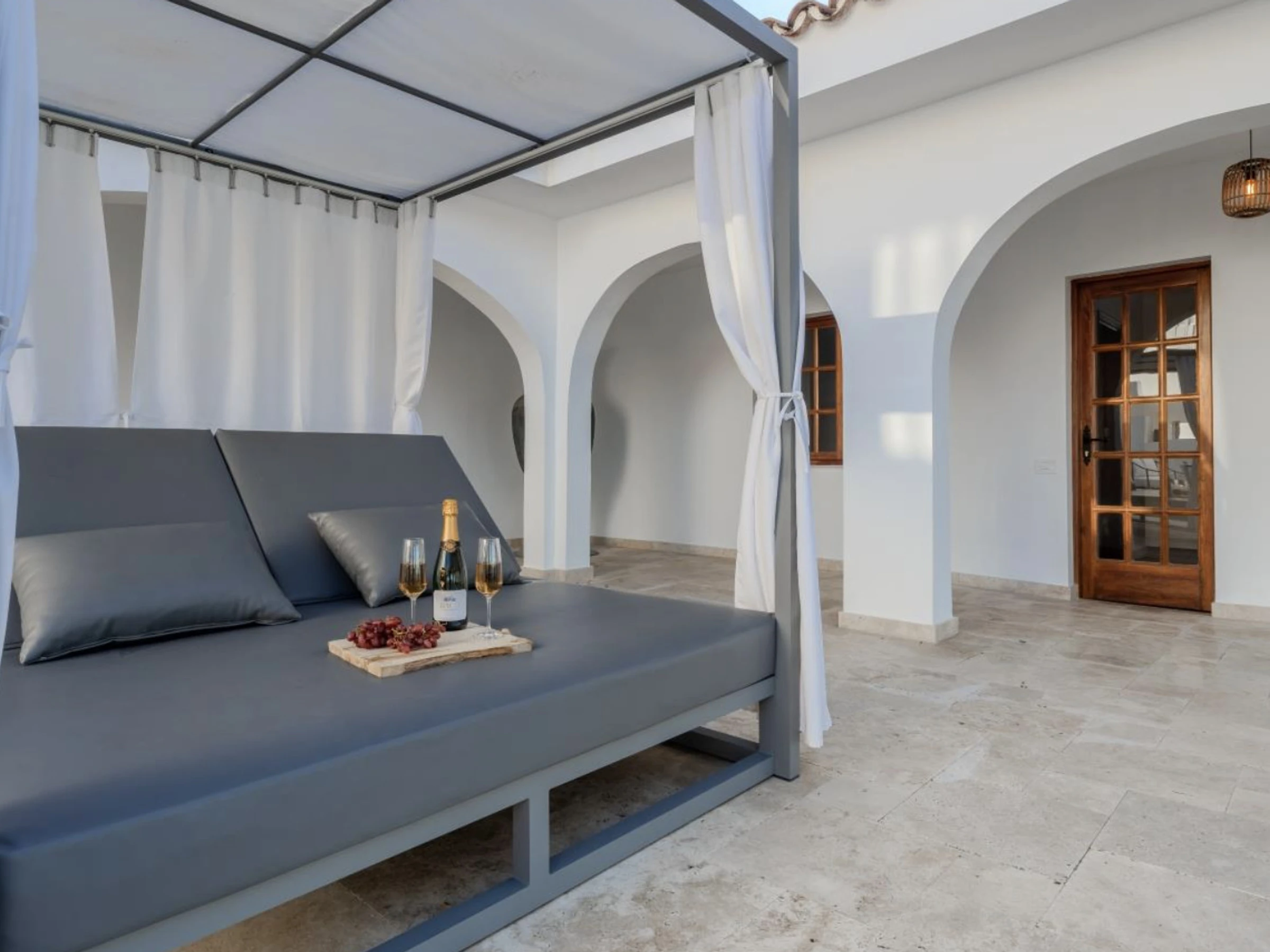 The villa is organized into two wings, connected by a charming central courtyard that invites relaxation or celebration under the sun. In the main wing are the kitchen and living-dining room, both designed to maximize natural light and panoramic sea views.