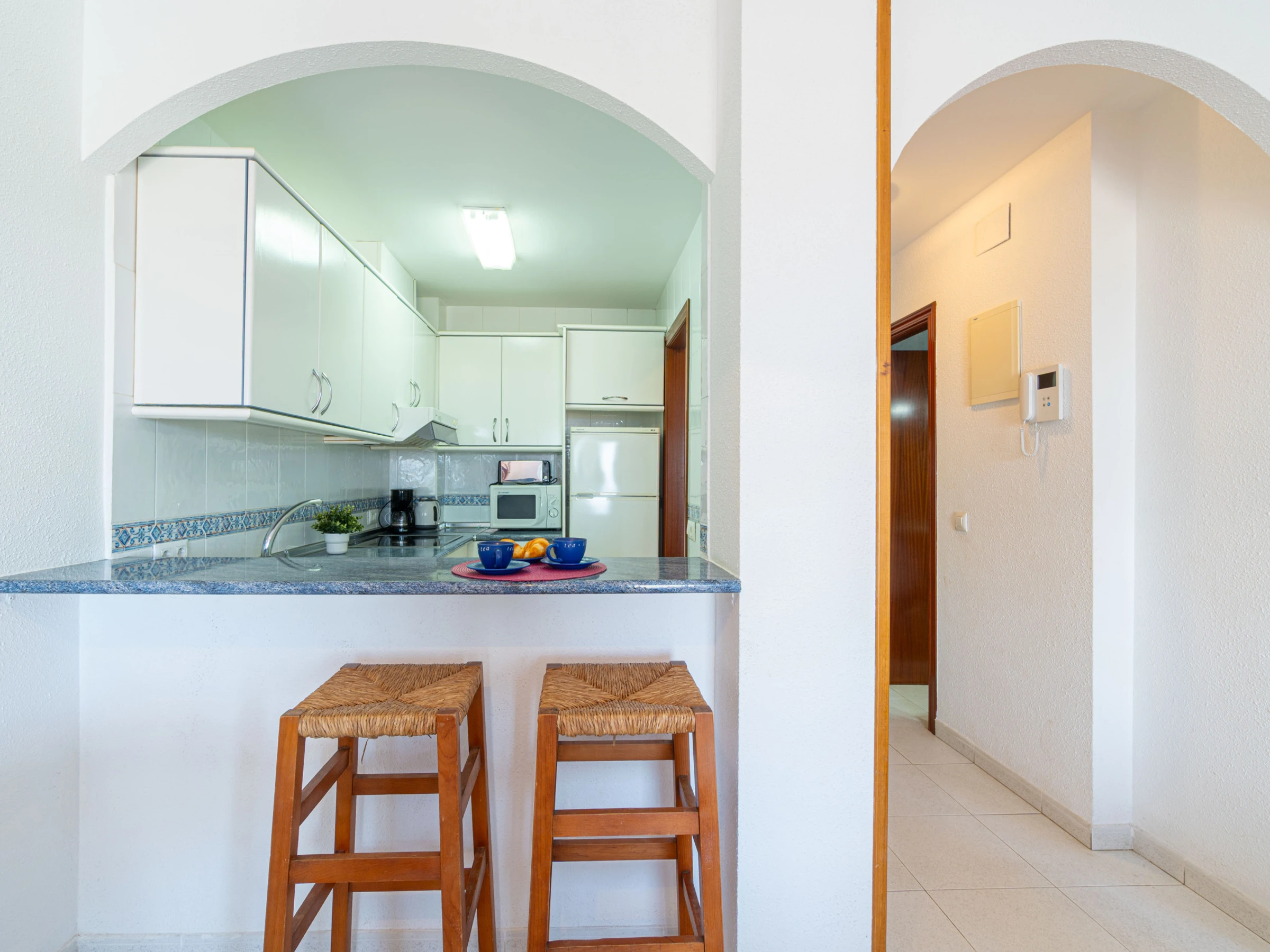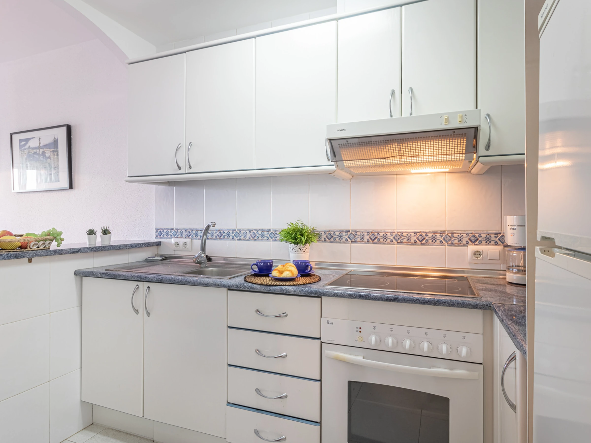 The open-plan ceramic hob kitchen is equipped with refrigerator, microwave, oven, dishes/cutlery, kitchen utensils, coffee machine, toaster and kettle.