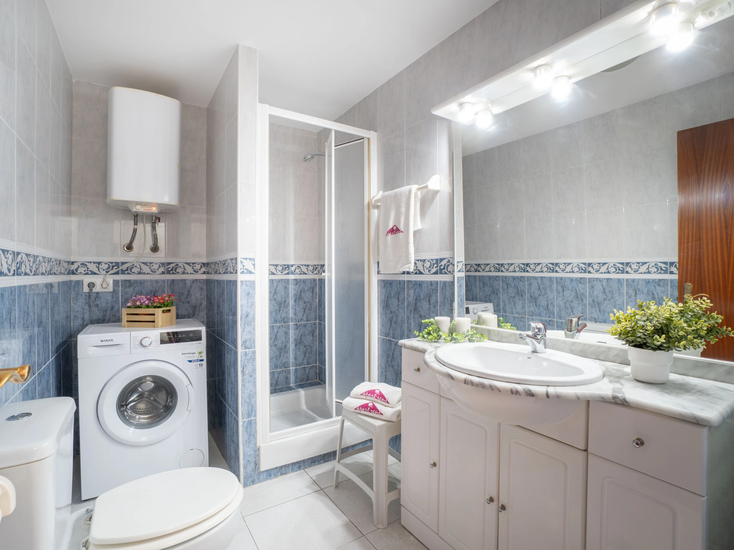 It features a lift, garden furniture, terrace, washing machine, internet access (wifi), air conditioning only in the living room, communal swimming pool and television.