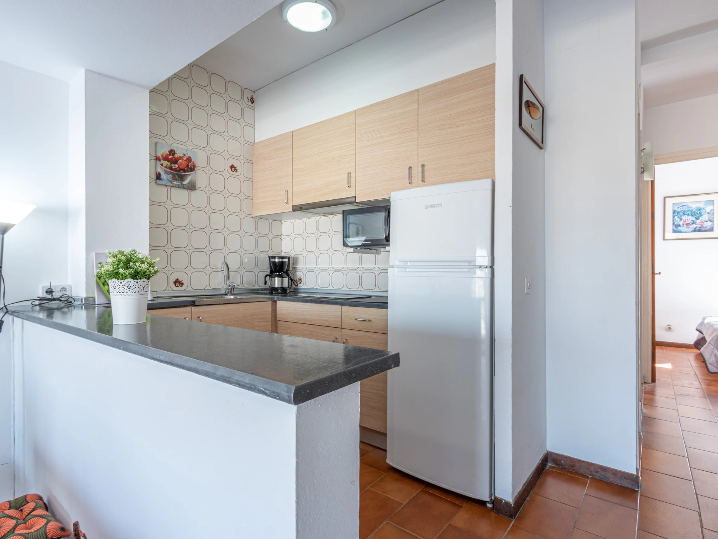 The open-plan ceramic hob kitchen is equipped with refrigerator, microwave, dishes/cutlery, kitchen utensils, coffee machine and toaster.