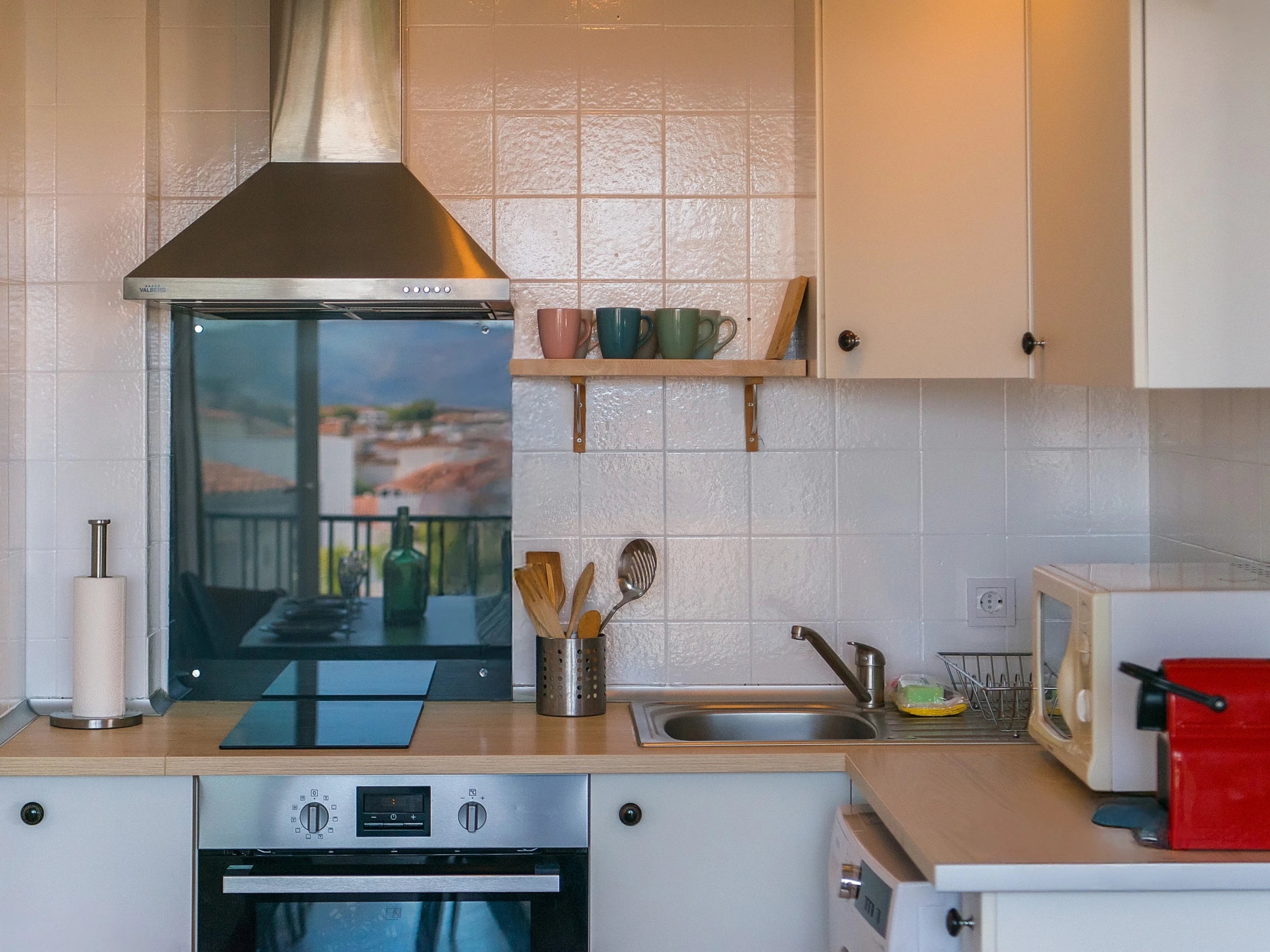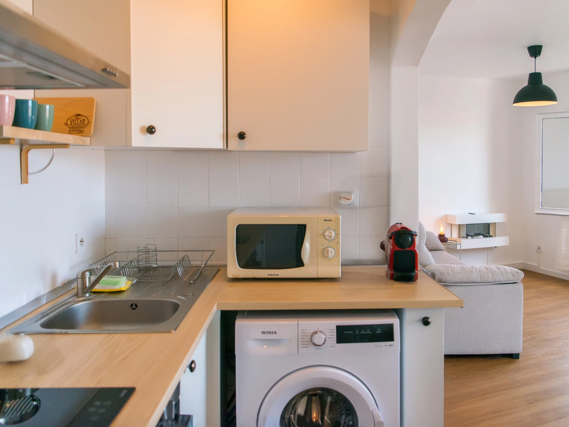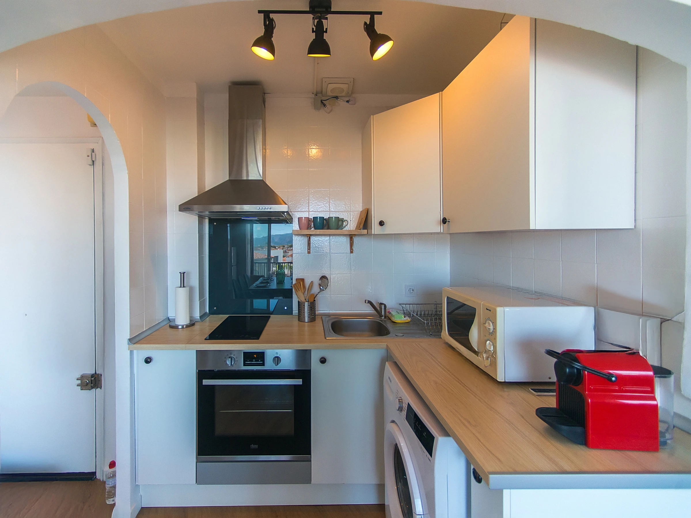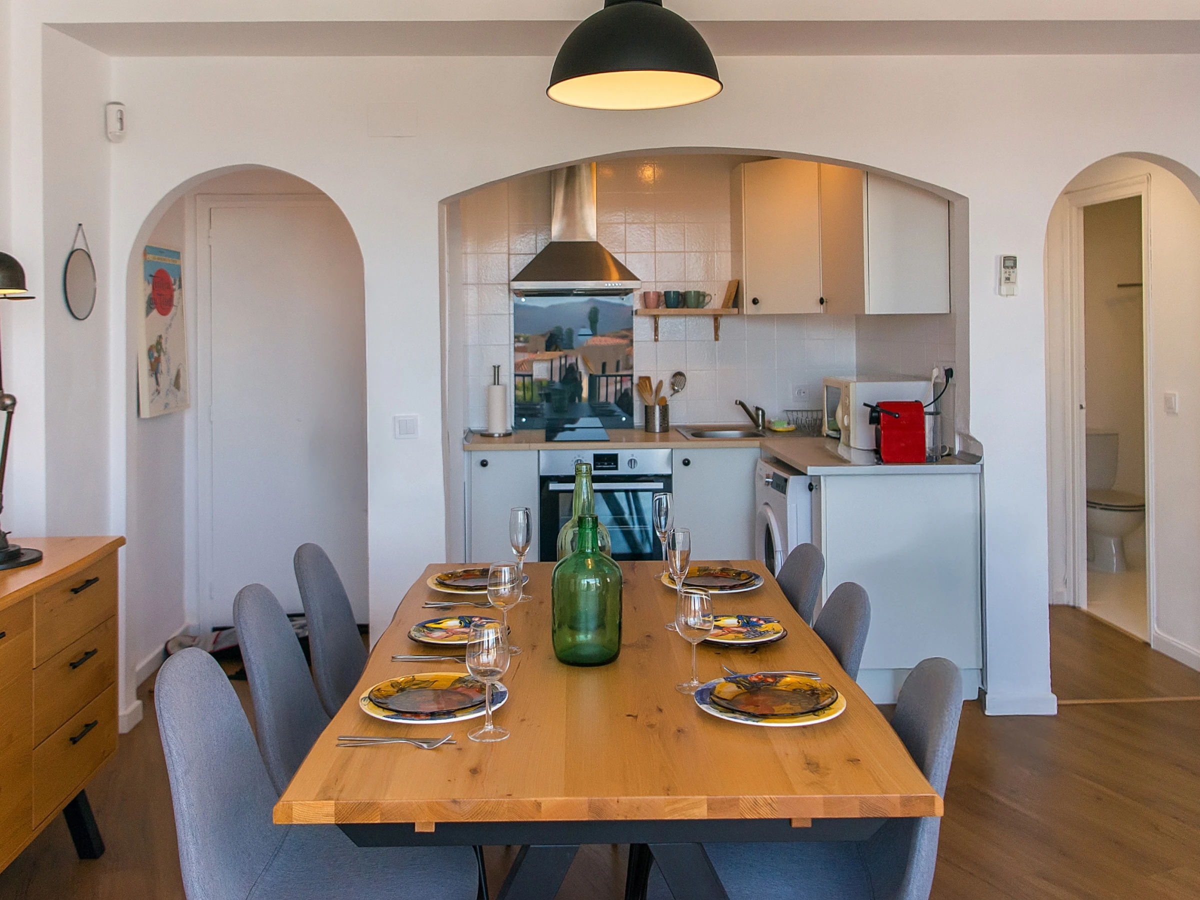 The American kitchen, with a ceramic hob, is fully equipped with everything necessary for your stay: fridge, oven, microwave, freezer, coffee maker, toaster, kettle, crockery and kitchen utensils. In addition, it has a washing machine, iron and hairdryer for greater comfort.