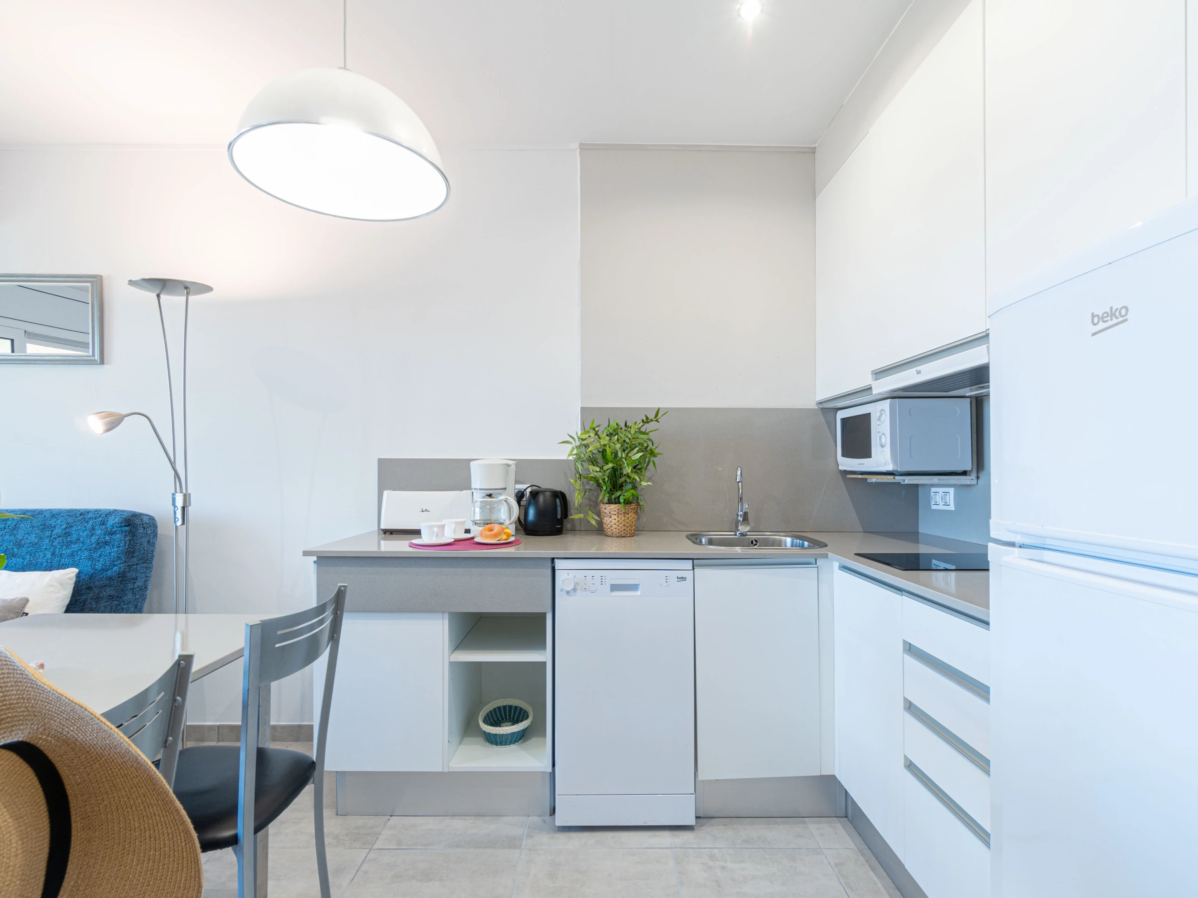 The open-plan kitchen with ceramic hob is fully equipped with fridge, microwave, freezer, washing machine, dishwasher, crockery, cutlery, kitchen utensils, coffee maker and toaster, offering everything needed for a relaxing stay.