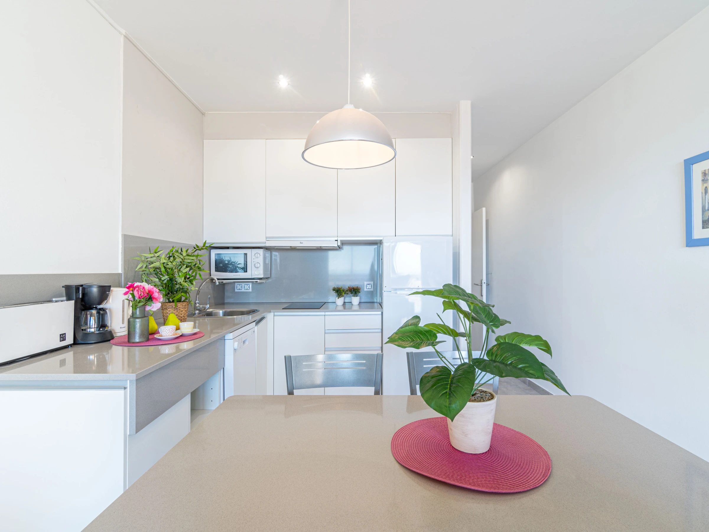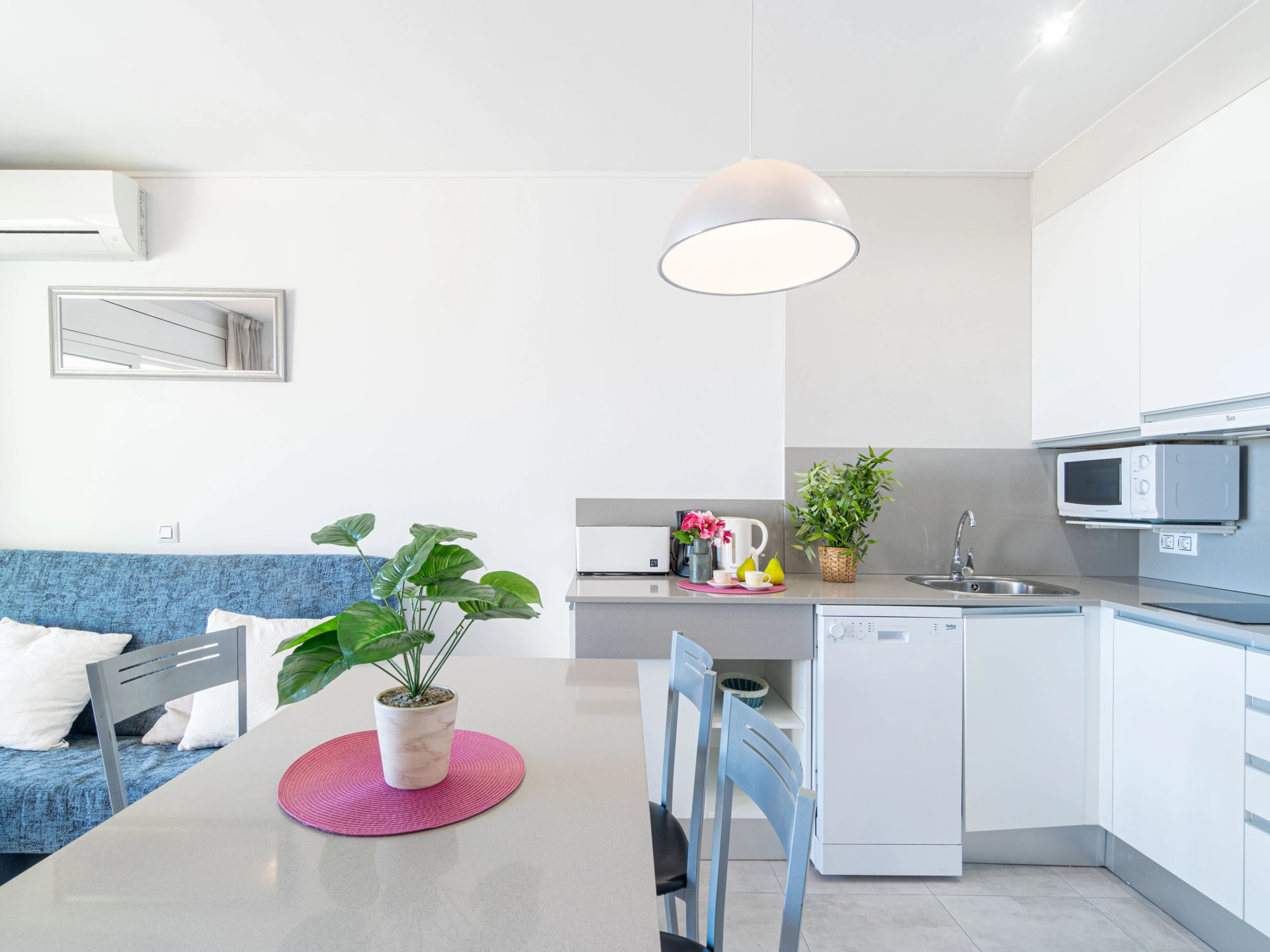 The open-plan kitchen, equipped with ceramic hob, includes fridge, microwave, freezer, dishwasher, tableware, cutlery, kitchen utensils, coffee maker, toaster, and kettle, providing everything needed for a practical and comfortable stay.
