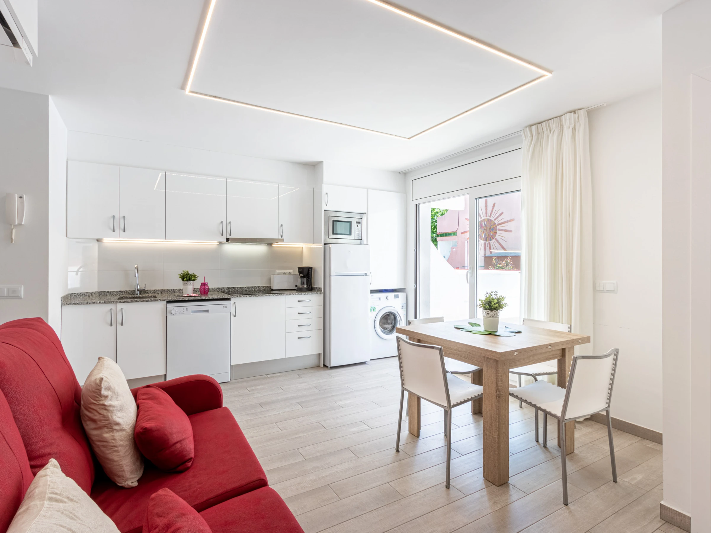 The open-plan ceramic hob kitchen is equipped with refrigerator, microwave, washing machine, dishwasher, dishes/cutlery, kitchen utensils, coffee machine and toaster.