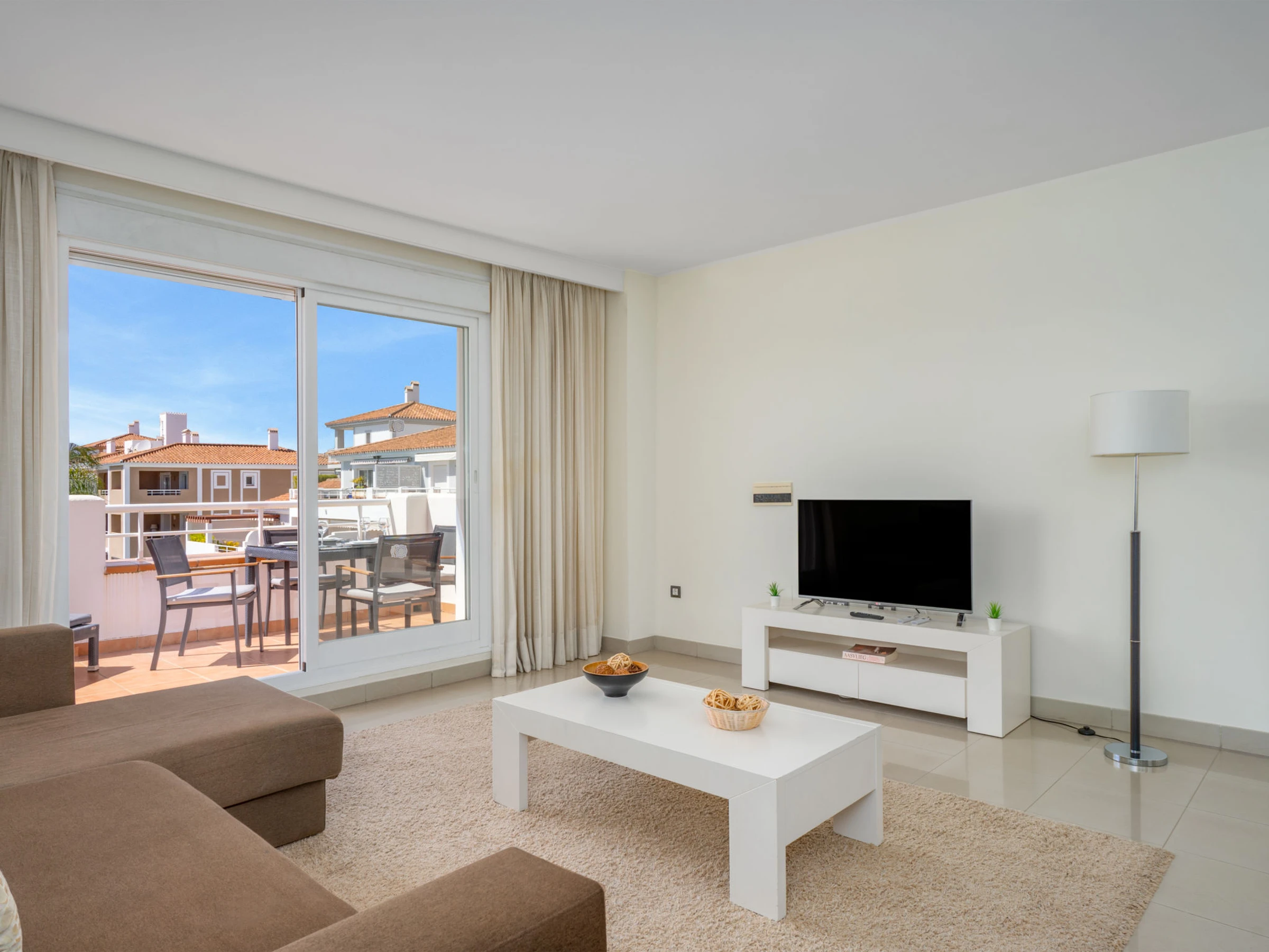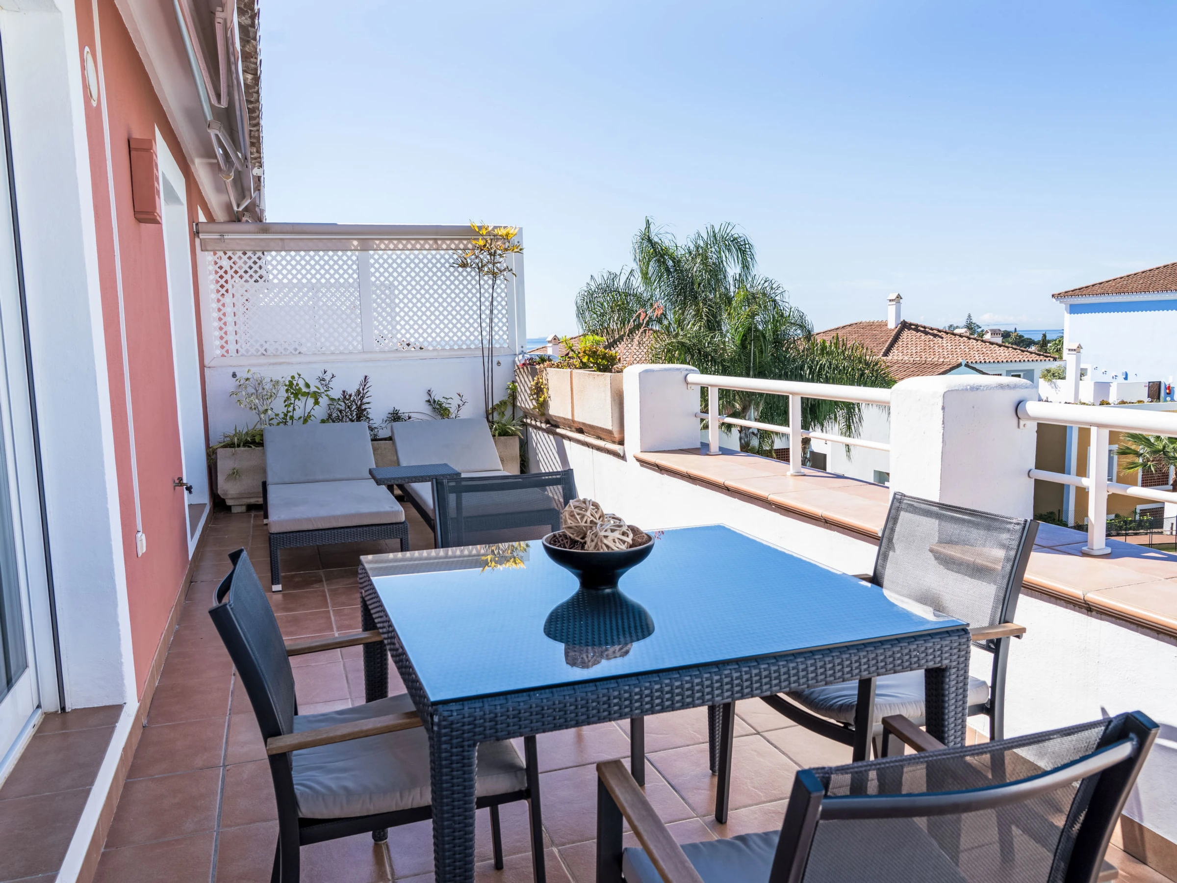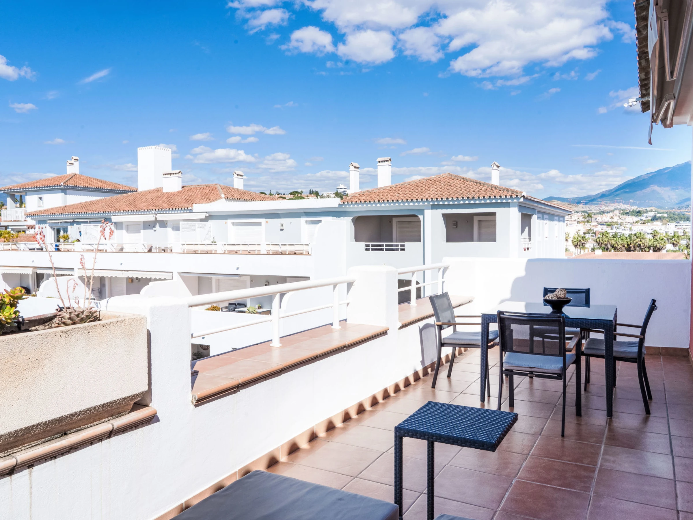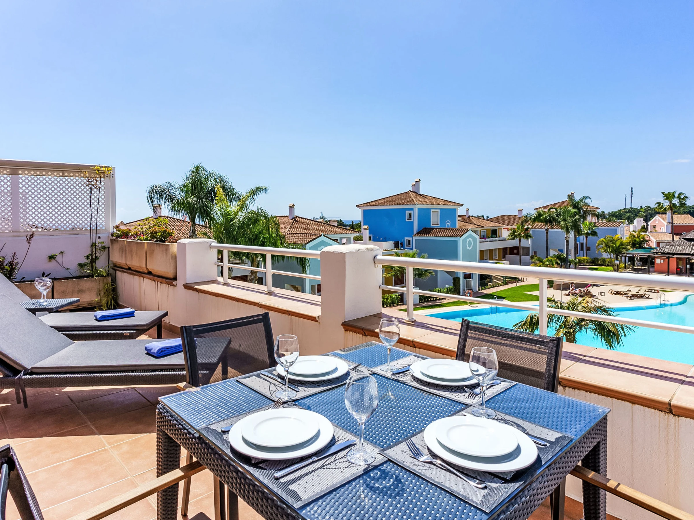 Very beautiful, cosy, very comfortable resort "Cortijo del Mar", built in 2011, surrounded by trees. 5 km from the centre of San Pedro de Alcantara, 14 km from the centre of Estepona, outside the resort, 16 km from the centre of Marbella, in the district El Paraiso, in a quiet, sunny position, traffic calmed area, 1.6 km from the sea, 2.6 km from the beach. For shared use: garden with lawn, natural garden, lawn for sunbathing, swimming pool kidney-shaped (43 x 23 m, depth 100 - 210 cm, seasonal availability: [hidden] - [hidden] pool opening hours: 11:00-18:00 and 11:00-20:00). Shower/WC in the pool area, children's pool, outdoor shower. Shop, supermarket, restaurant 500 m, bus stop "El Pilar" 800 m, sandy beach "Playa Salduna" 2.6 km. Sports harbour 9 km, marina 9 km, golf course (18 hole) 2.4 km. The owner does not accept any youth groups. Please note: guarded residence. Additional accommodations can be booked.