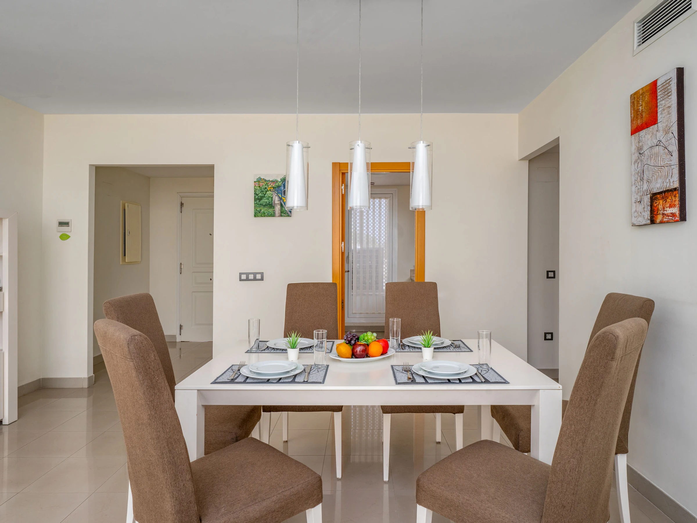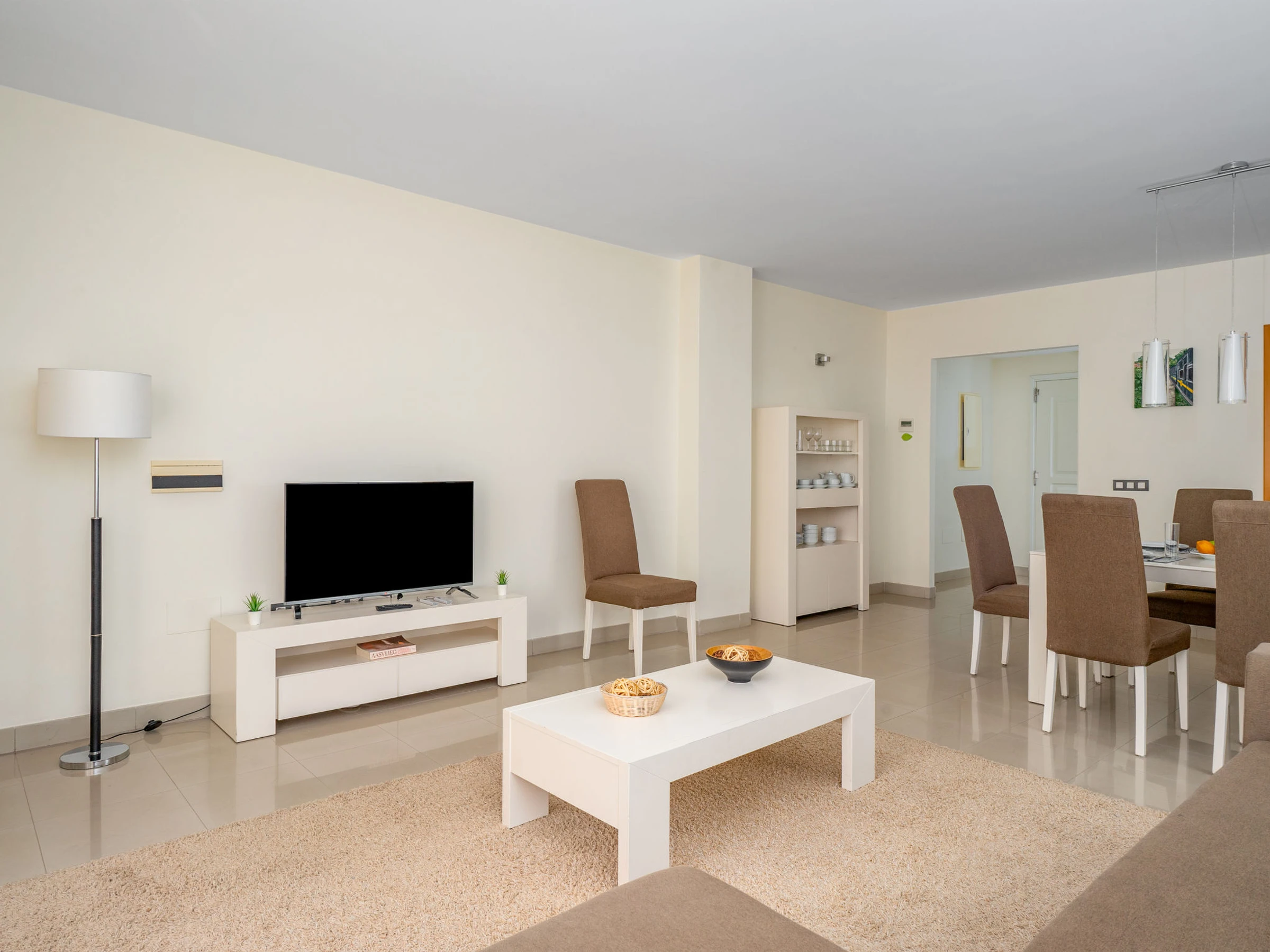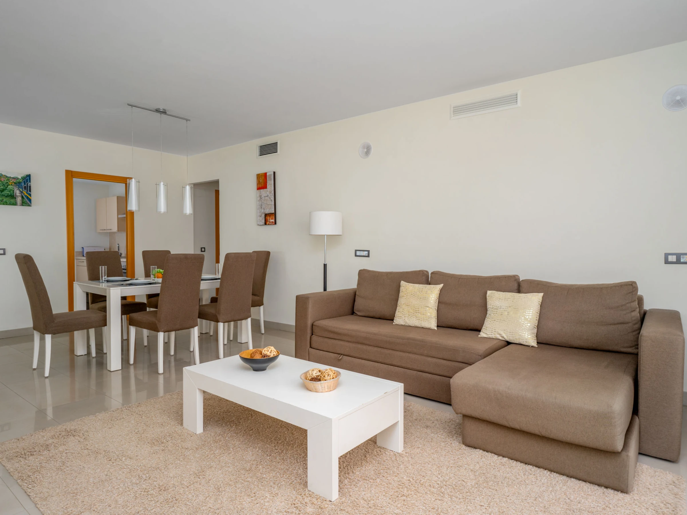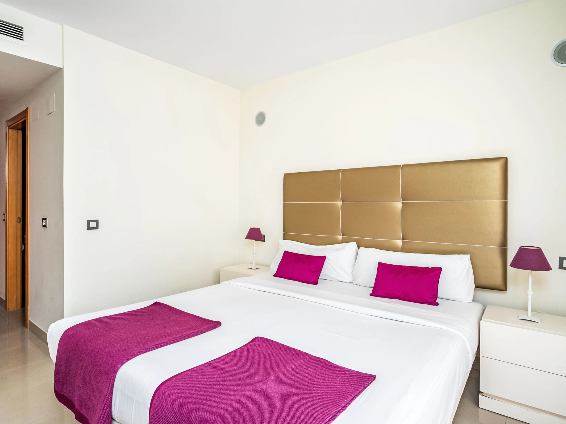"Cortijo mar azul", 3-room apartment 106 m2, south facing position. Bright, very comfortable and beautiful furnishings: living/dining room with digital TV, air conditioning and forced-air heating. Exit to the terrace. 1 room with 1 french bed (180 cm, length 200 cm), shower/WC, double hand-basin and hydro massage shower (private) air conditioning and electric shutters. Exit to the terrace. 1 room with 2 beds (105 cm, length 200 cm), air conditioning and forced-air heating. Kitchen (oven, dishwasher, 4 ceramic glass hob hotplates, toaster, kettle, microwave, freezer, electric coffee machine). Bath/WC. Terrace. Terrace furniture. View of the swimming pool and the garden. Facilities: washing machine, iron, children's high chair, baby cot, hair dryer. Internet (WiFi, free). Garage space n 63. [hidden] // Reg. Nr.: ESFCTU0000290370004872840000000000000000[hidden]8