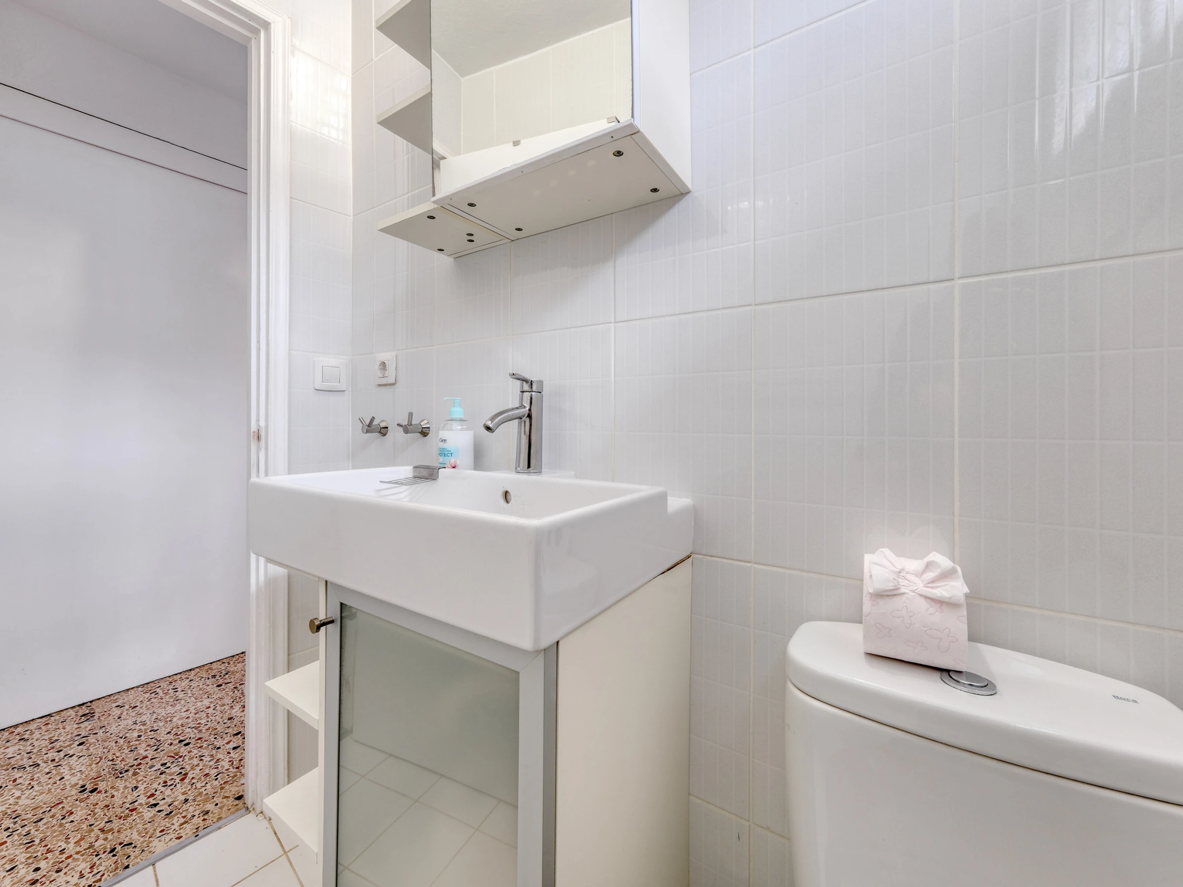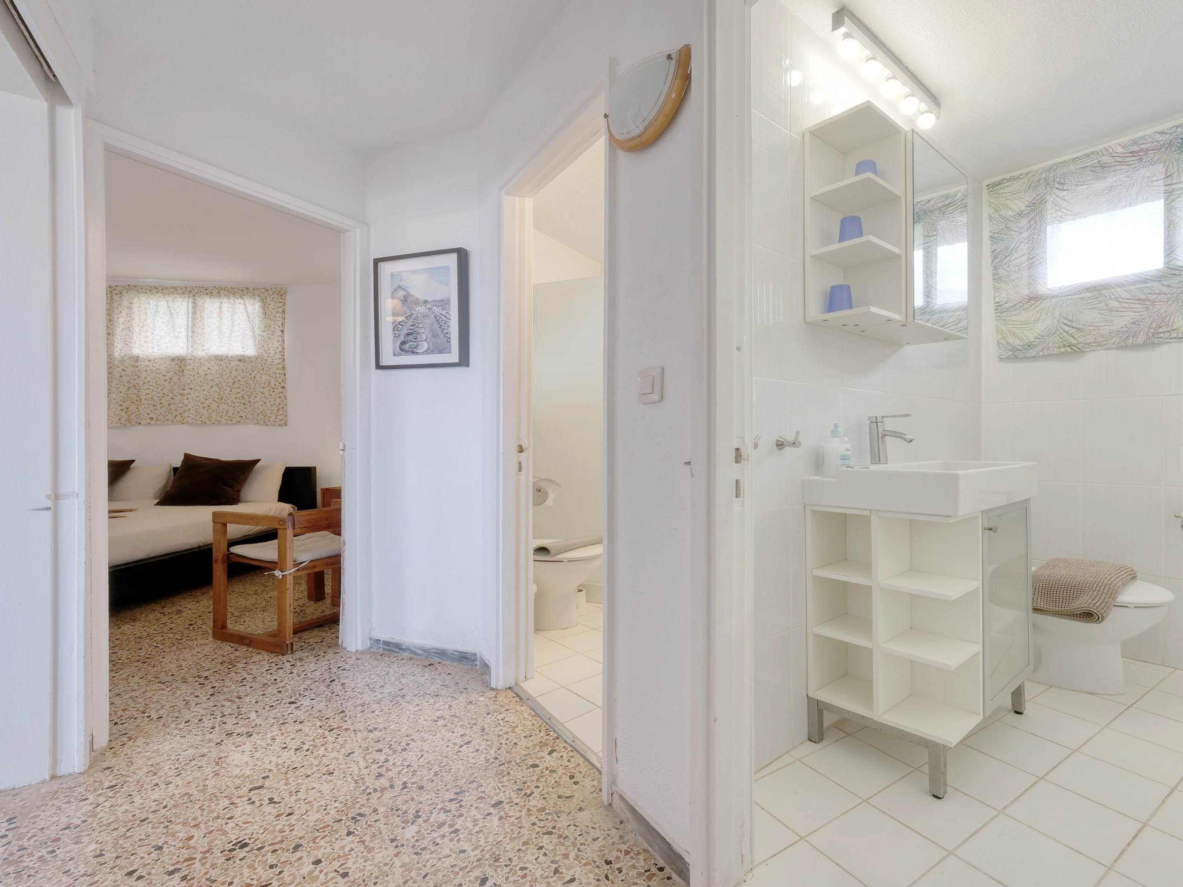 The bathroom is distributed across two independent rooms, offering greater comfort during the stay. One area has a shower and washbasin, while the other has a WC, a second washbasin and washing machine, facilitating simultaneous use.