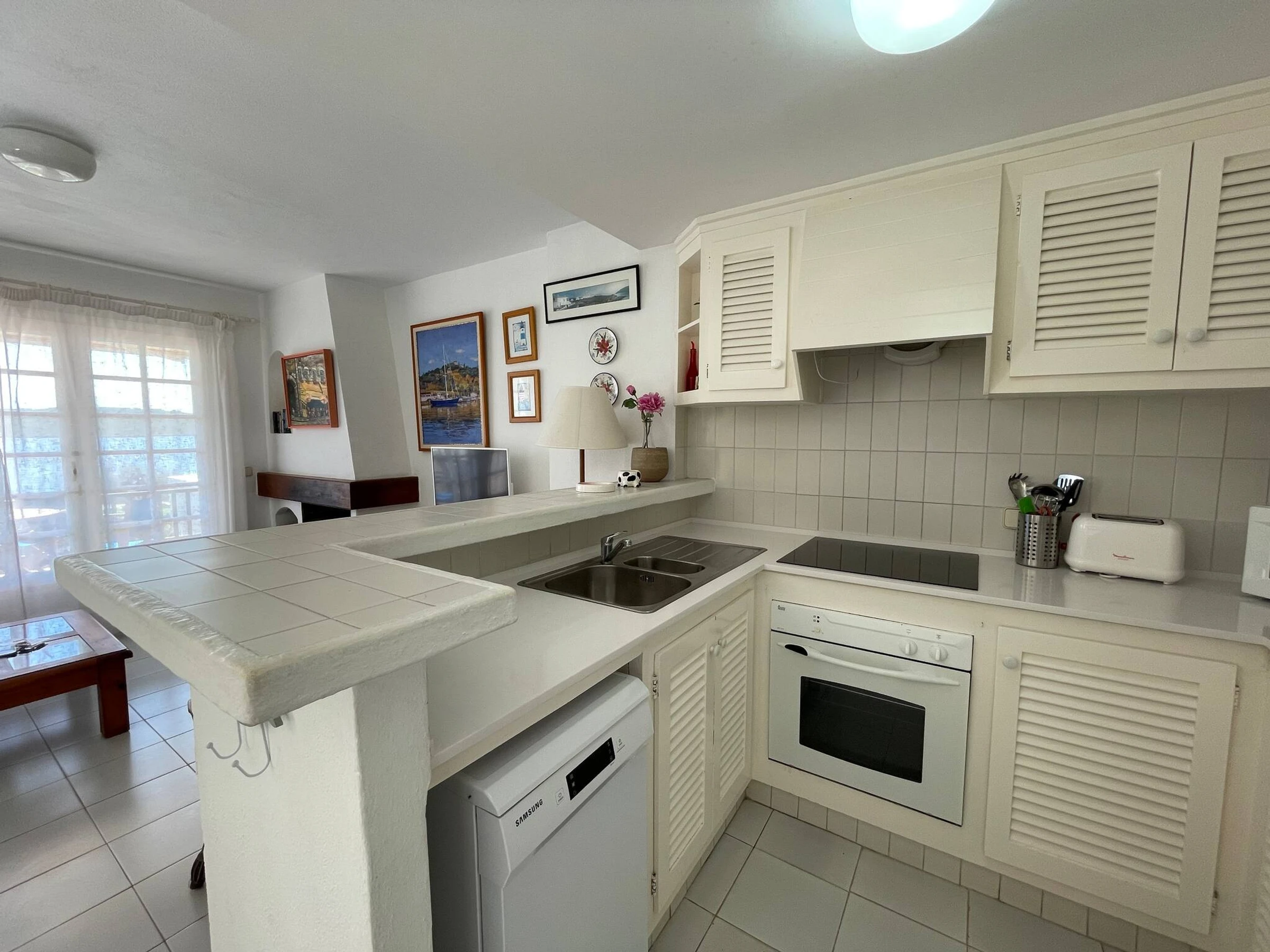 The apartment consists of a bedroom with a double bed and another bedroom with two single beds, a full bathroom, living-dining room, fully equipped open kitchen and spacious terrace with outdoor furniture and spectacular panoramic views.